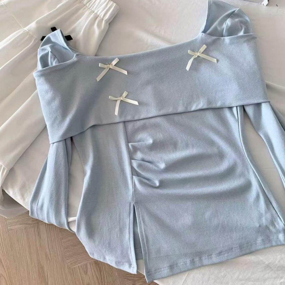 프렌치 젠틀 스타일 리본 디자인 스프링 블루 슬릿 긴팔 탑 하이웨이스트 롱 슬림 스커트 슈트스토어 가기
