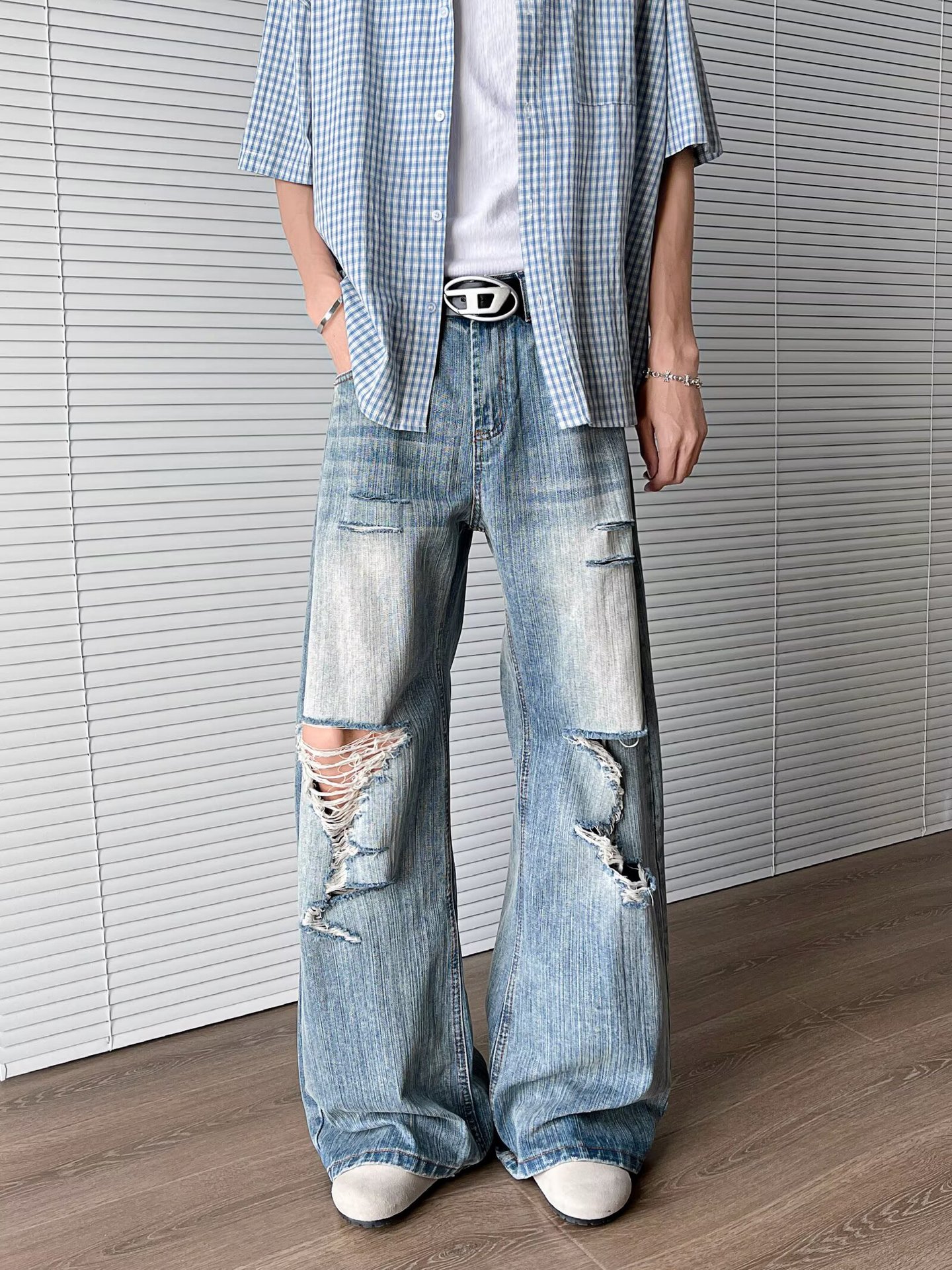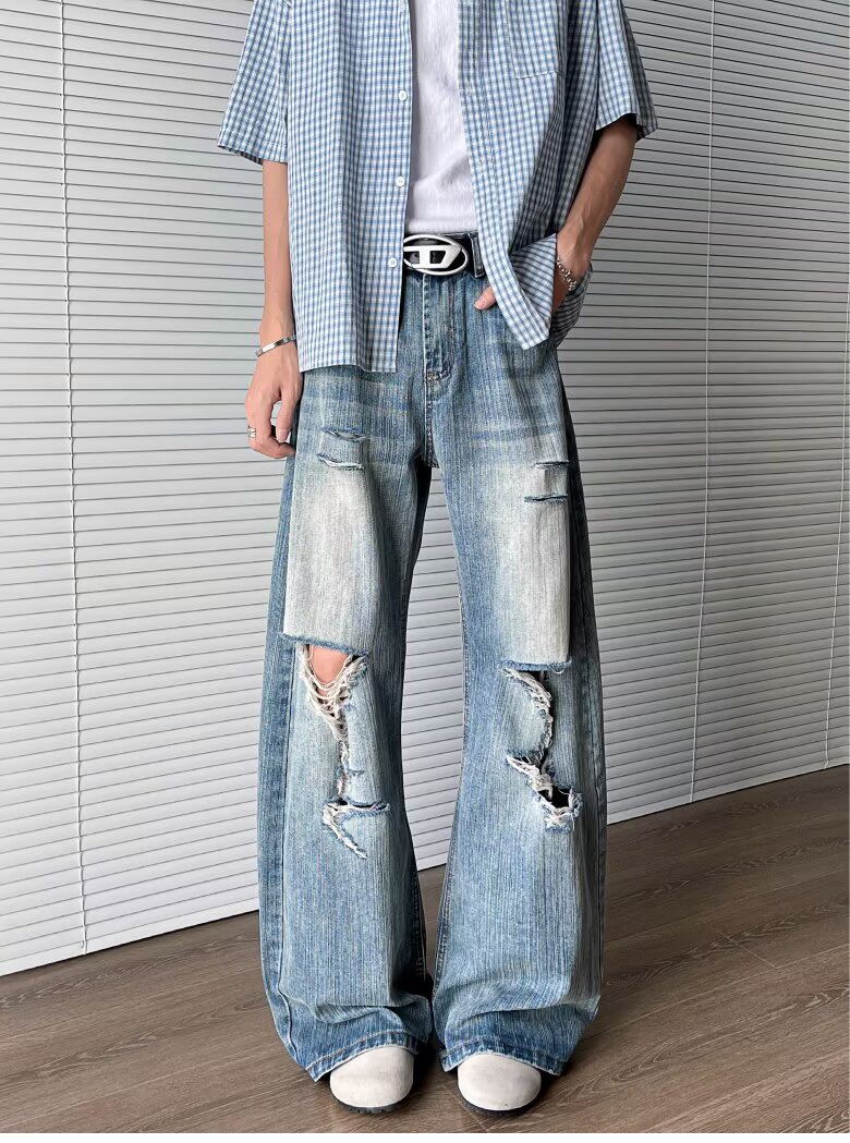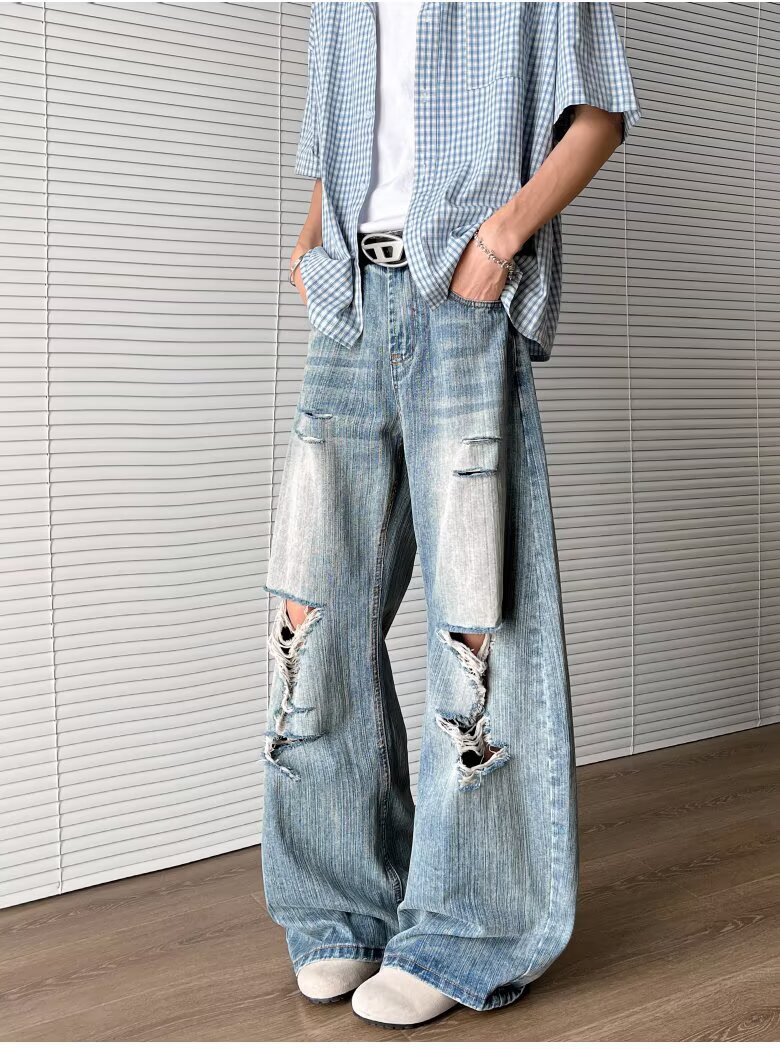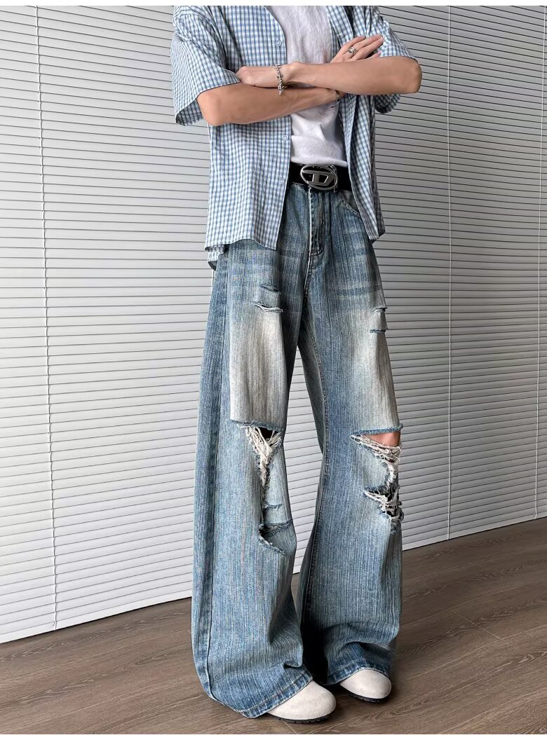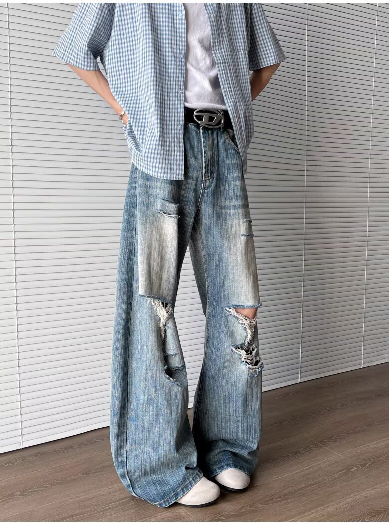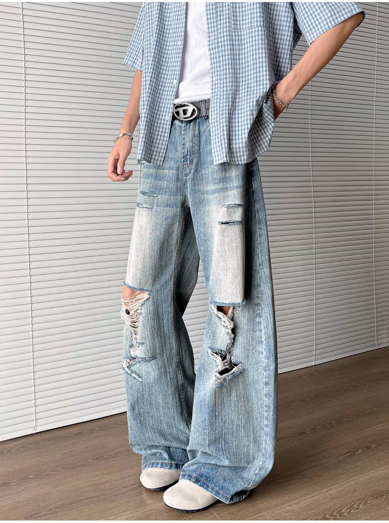 아메리칸 스트리트 레트로 유니섹스 하이엔드 워싱 블루 스트리트 트렌디 찢어진 디자인 루즈한 남성용 세이버 청바지