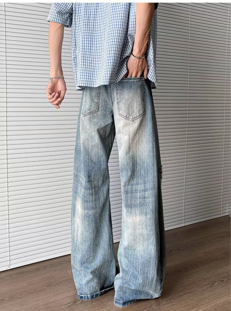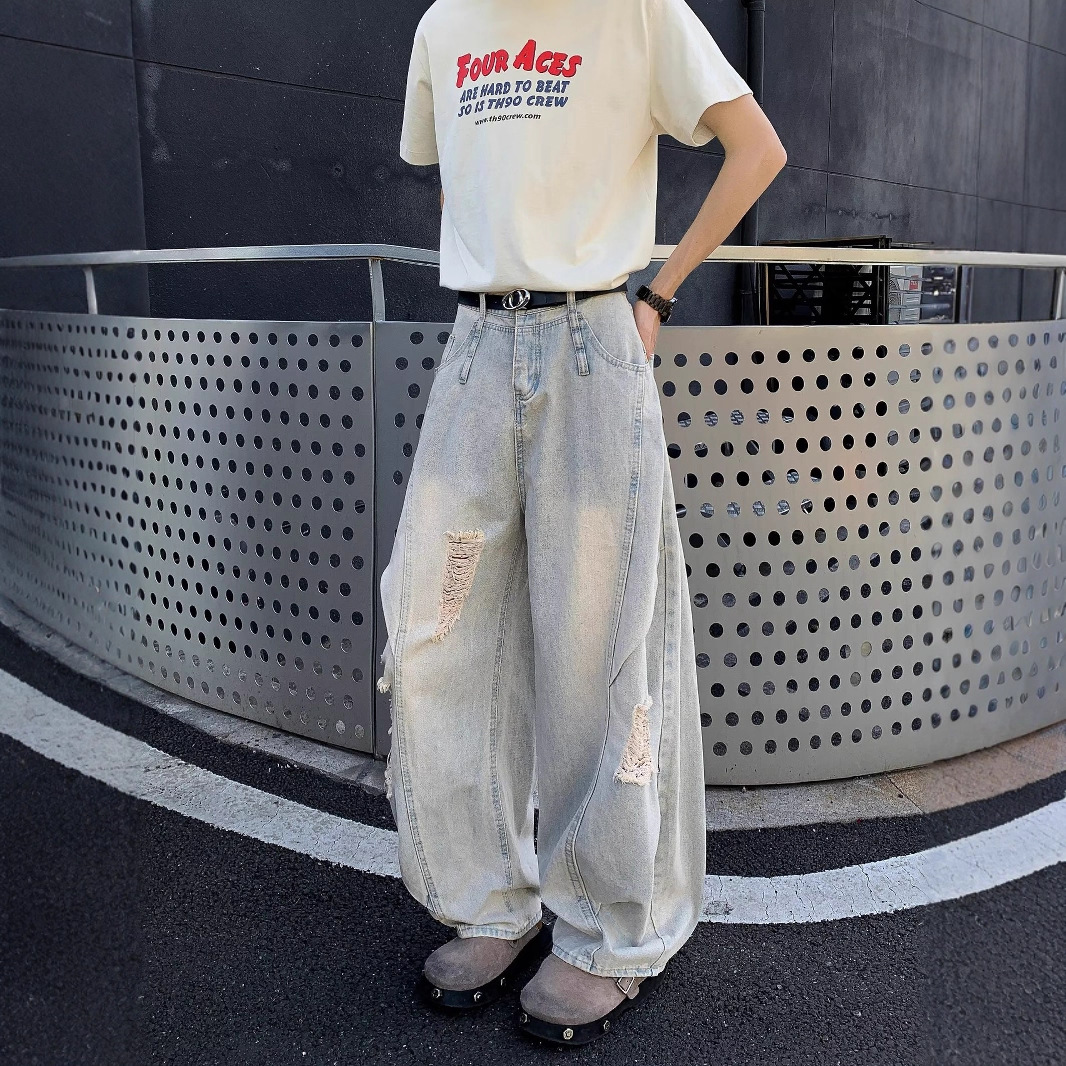 아메리칸 스트리트 레트로 유니섹스 하이엔드 워싱 블루 스트리트 트렌디 찢어진 디자인 루즈한 남성용 세이버 청바지스토어 가기