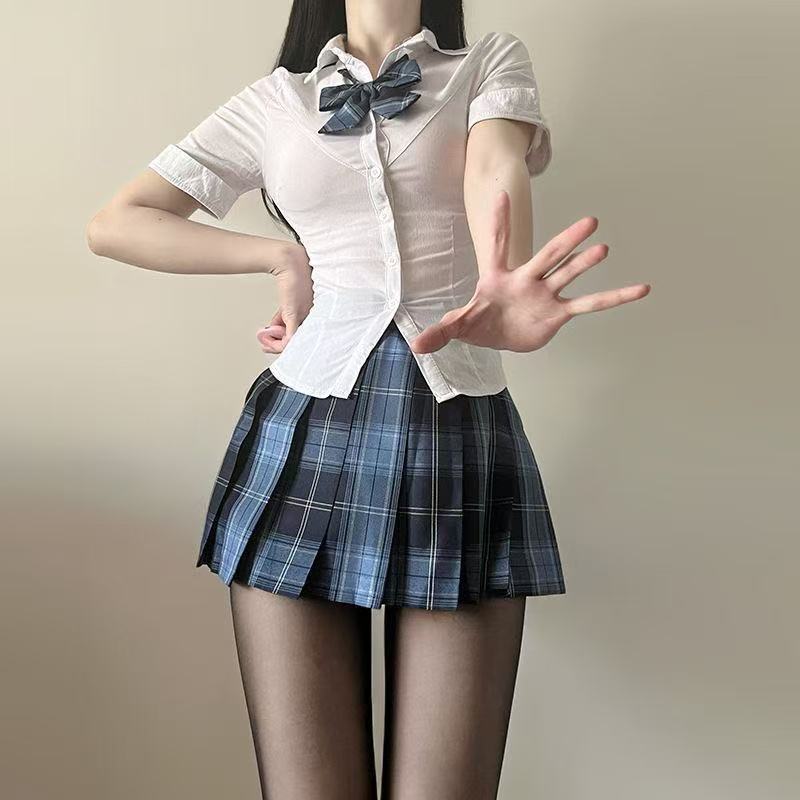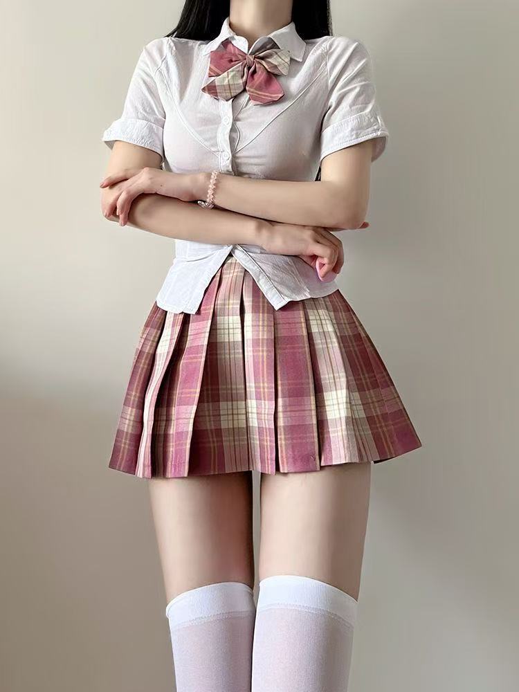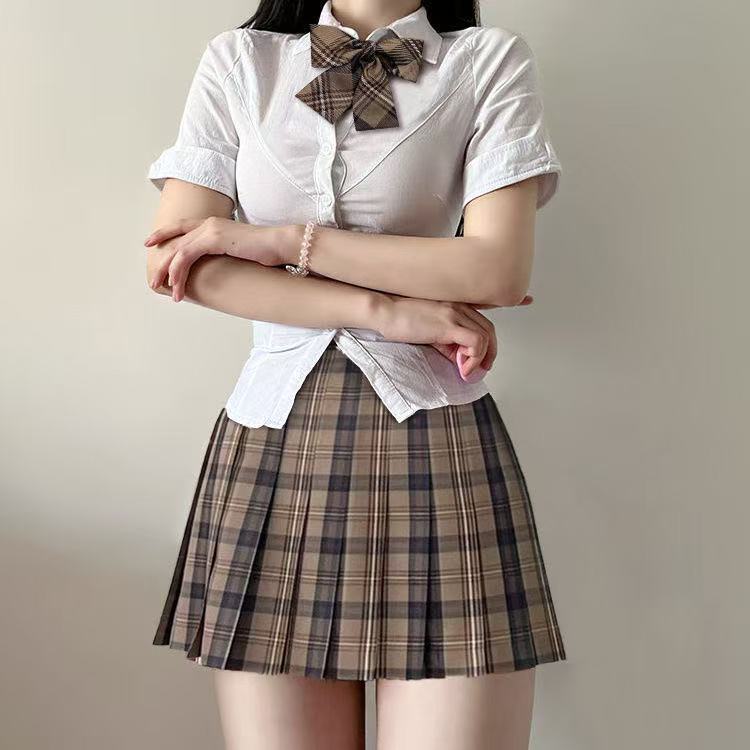 • 흰색 셔츠 + 나비넥타이 + 작은 갈색 체크무늬 스커트 (3종세트)