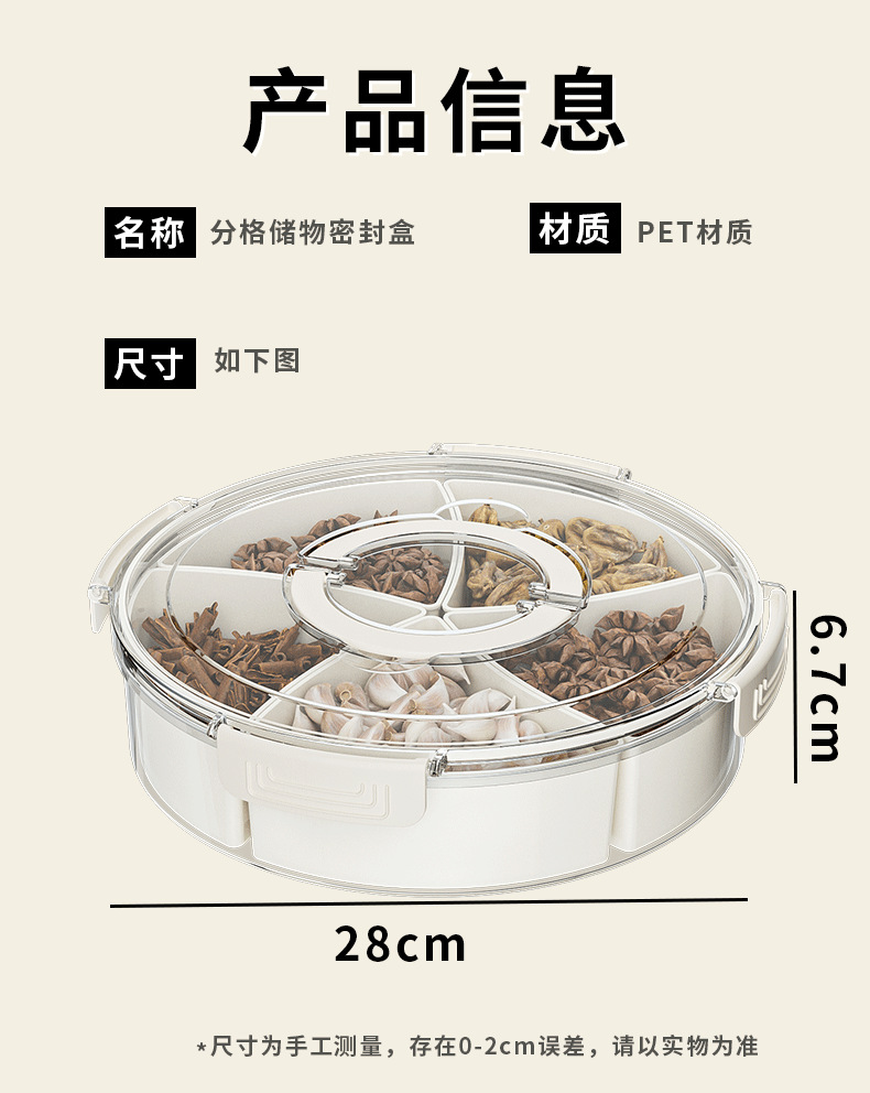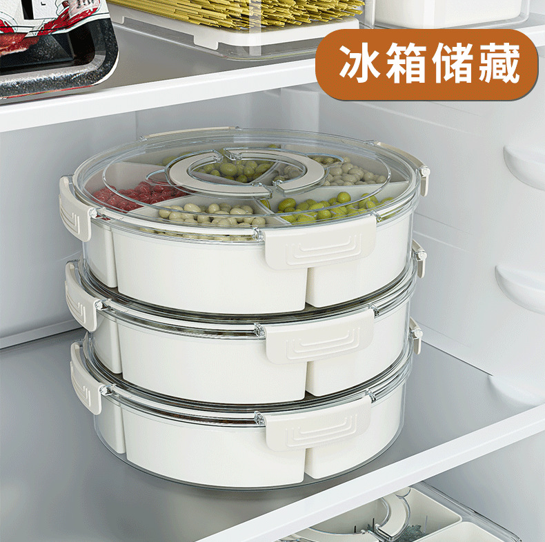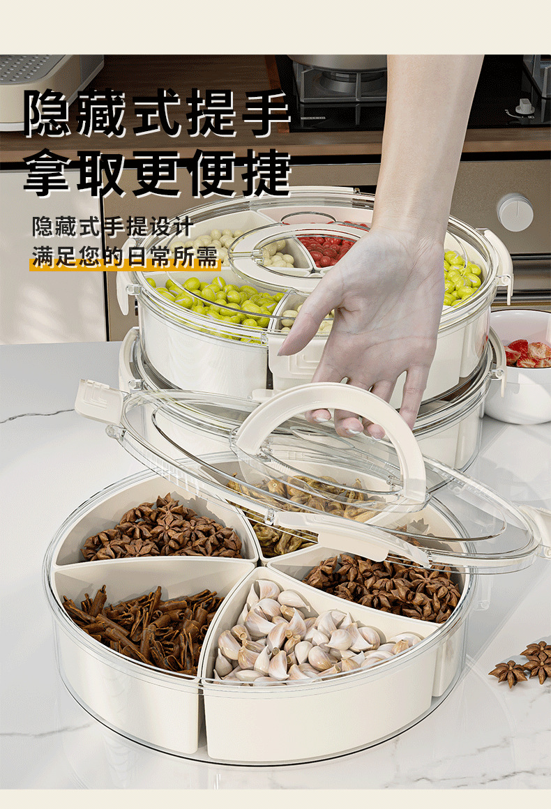 손잡이가 있는 주방 가정용 과일 접시, 5칸 밀봉 방습 건조 과일 접시, 뚜껑이 있는 원형 스낵 보관 상자