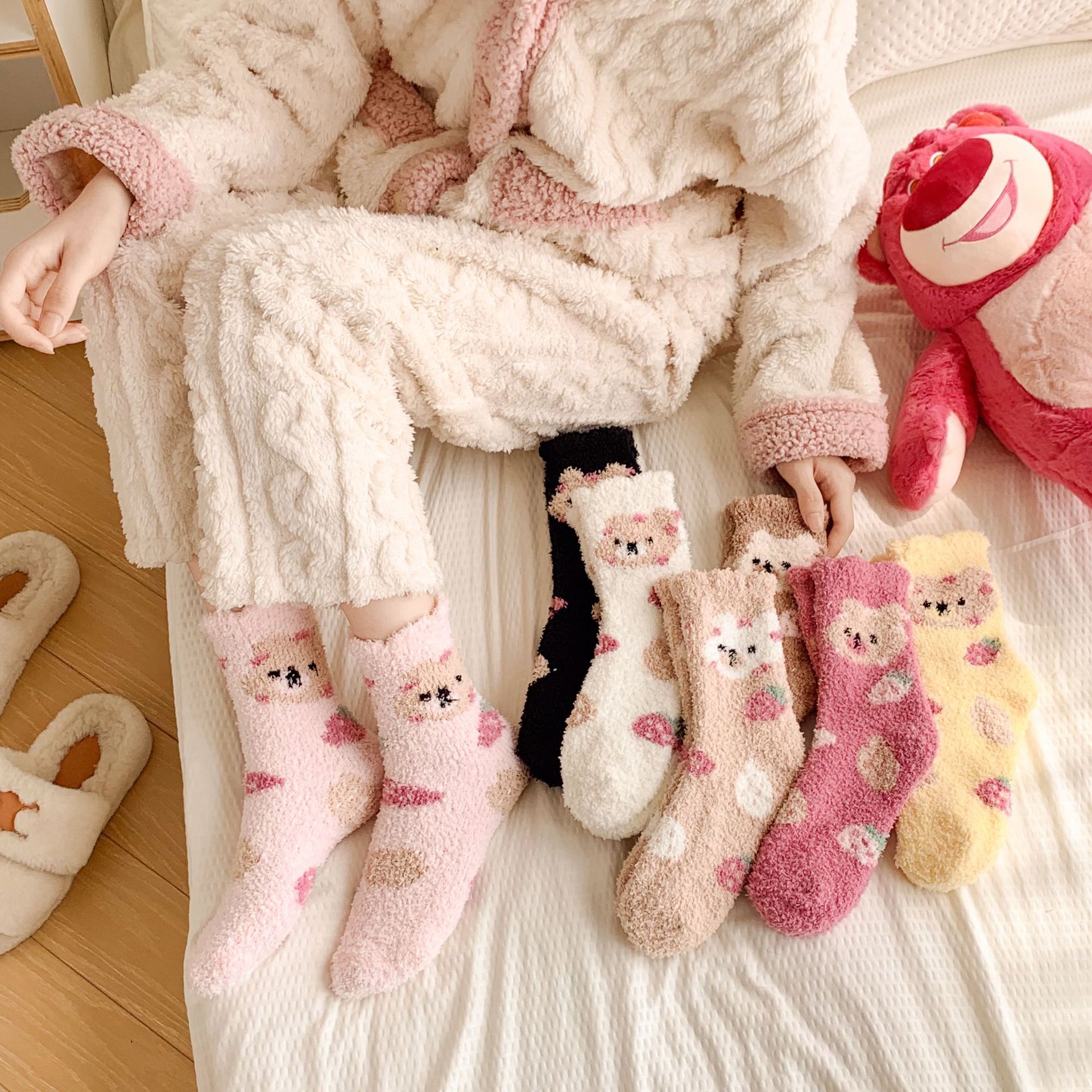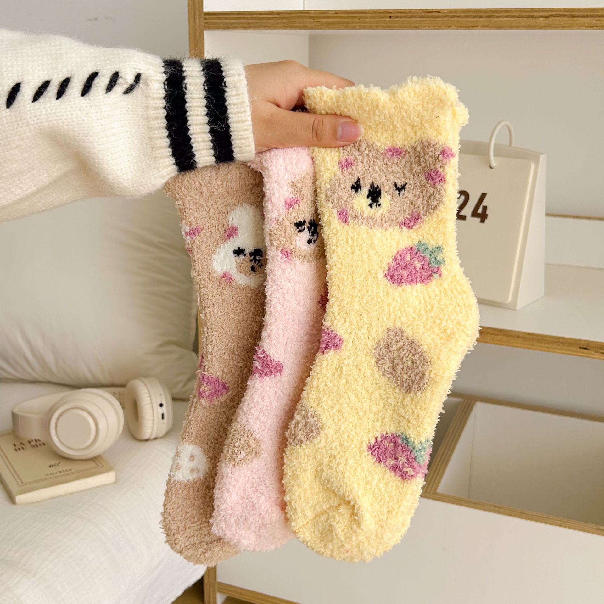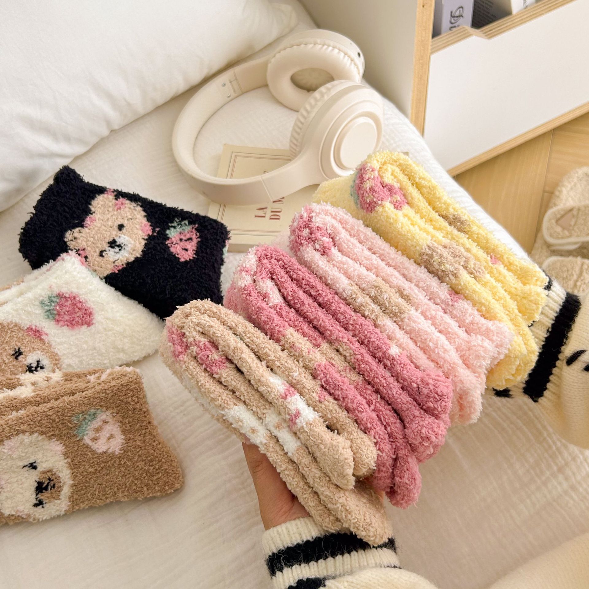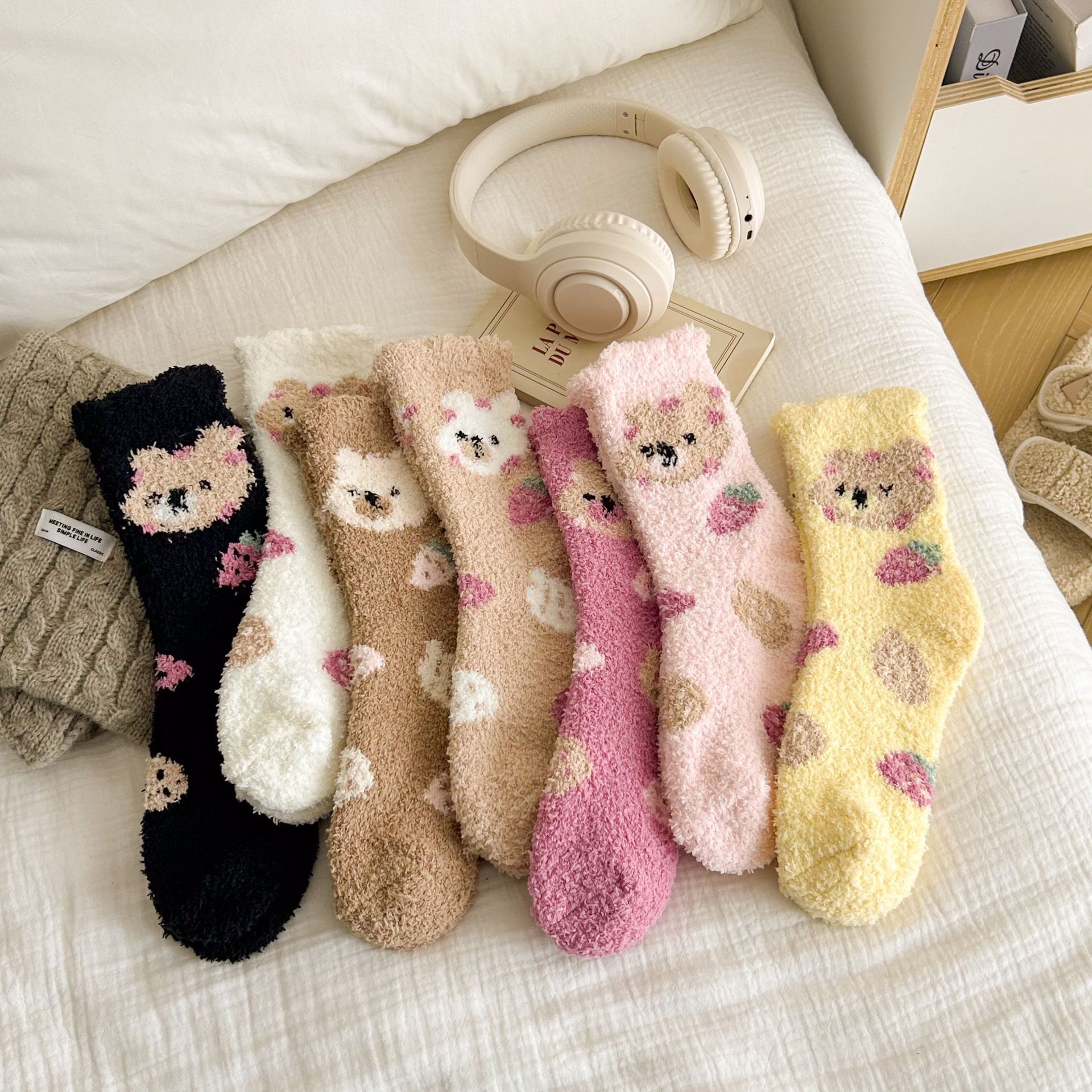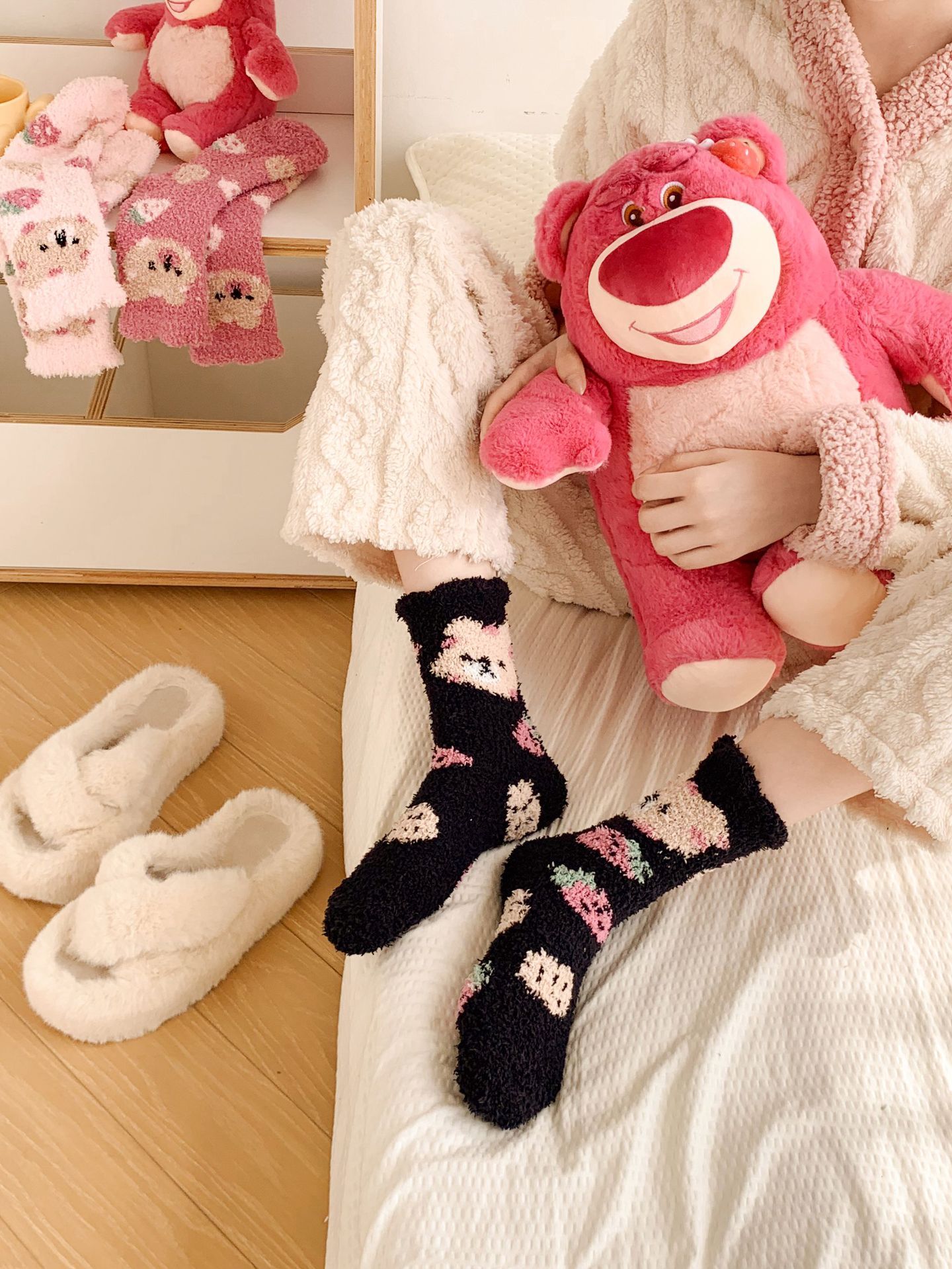 가을 겨울 새로운 산호 벨벳 여성 양말 홈 플로어 양말 달콤하고 귀여운 곰 양말 여성 수면 양말 중간 튜브 만화 양말