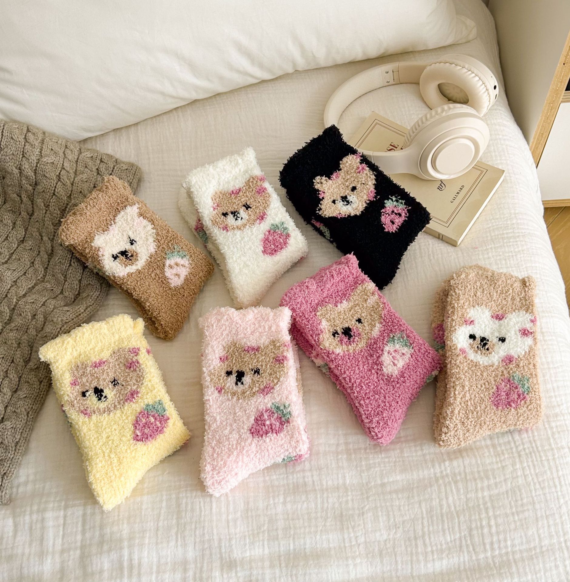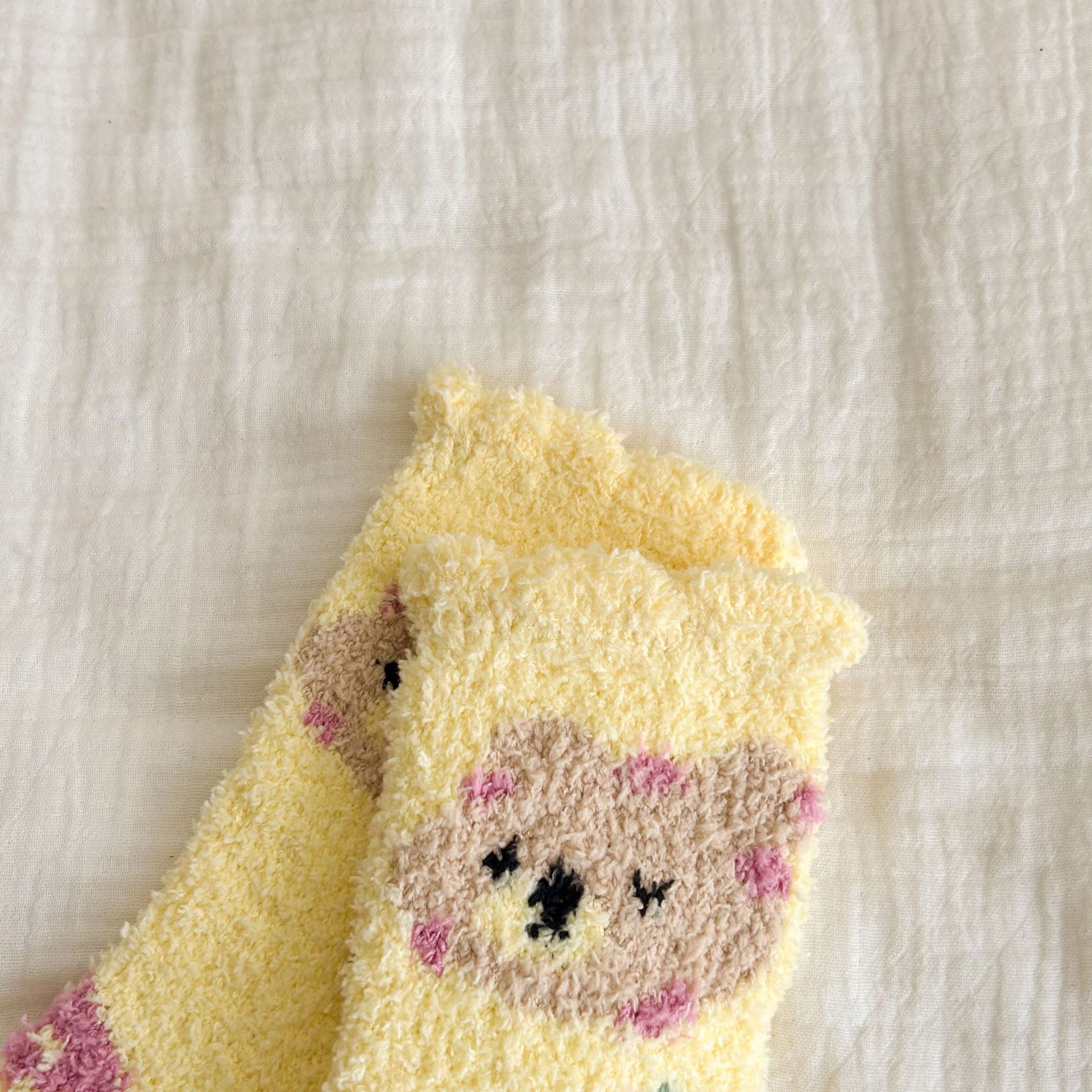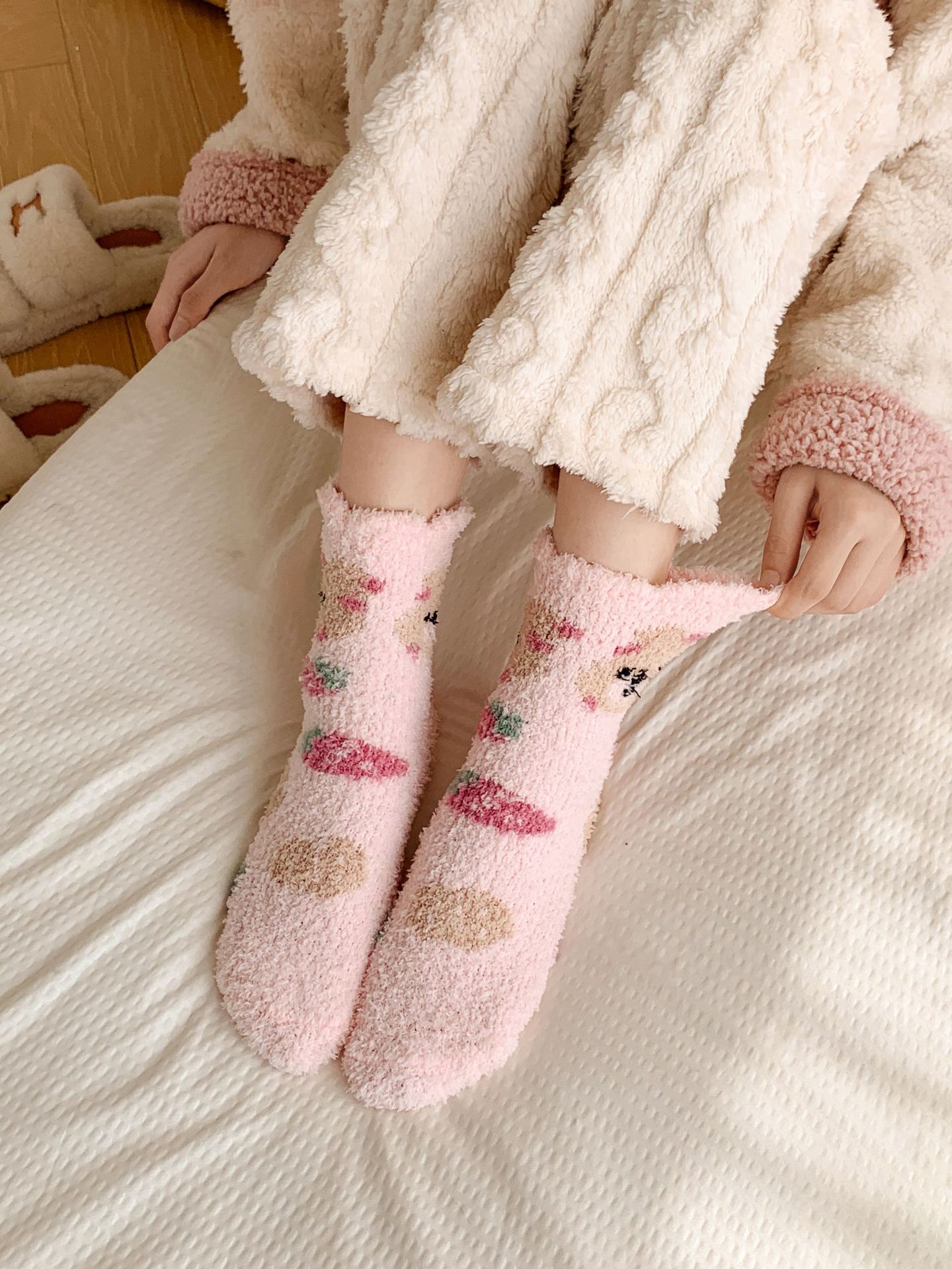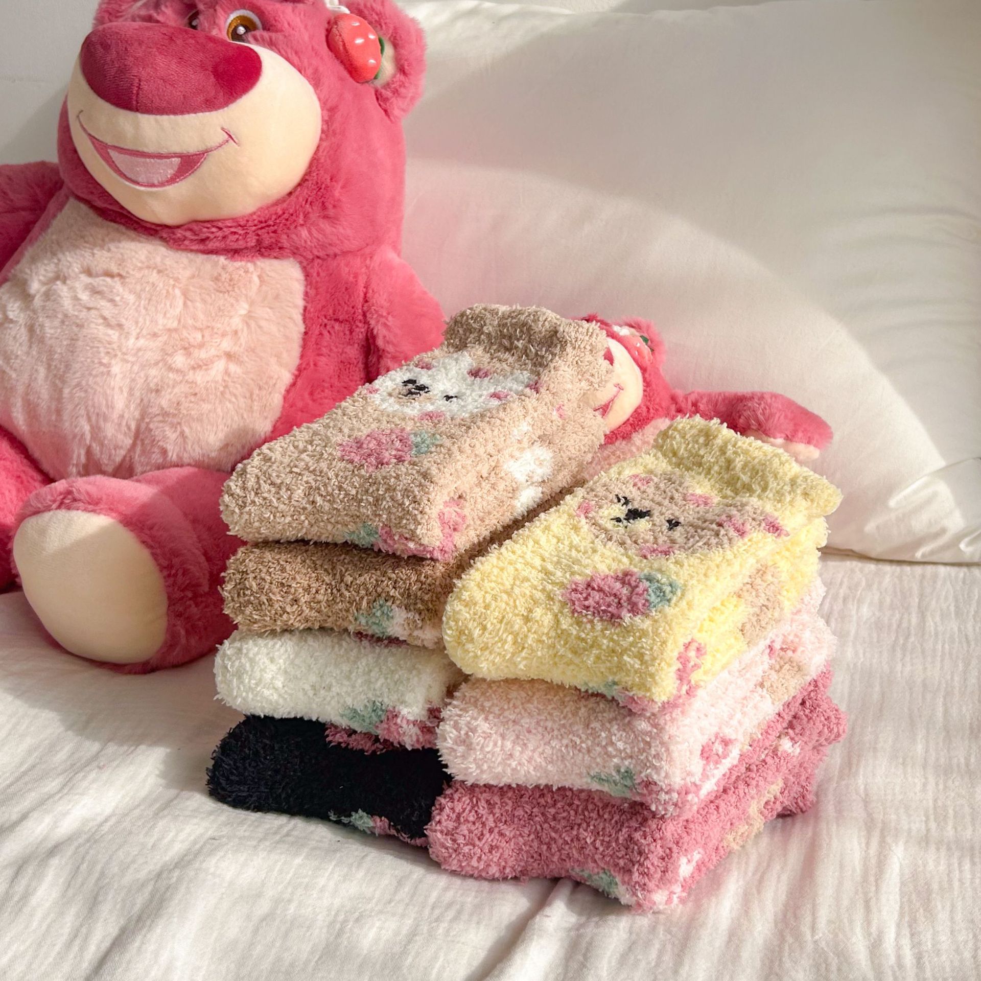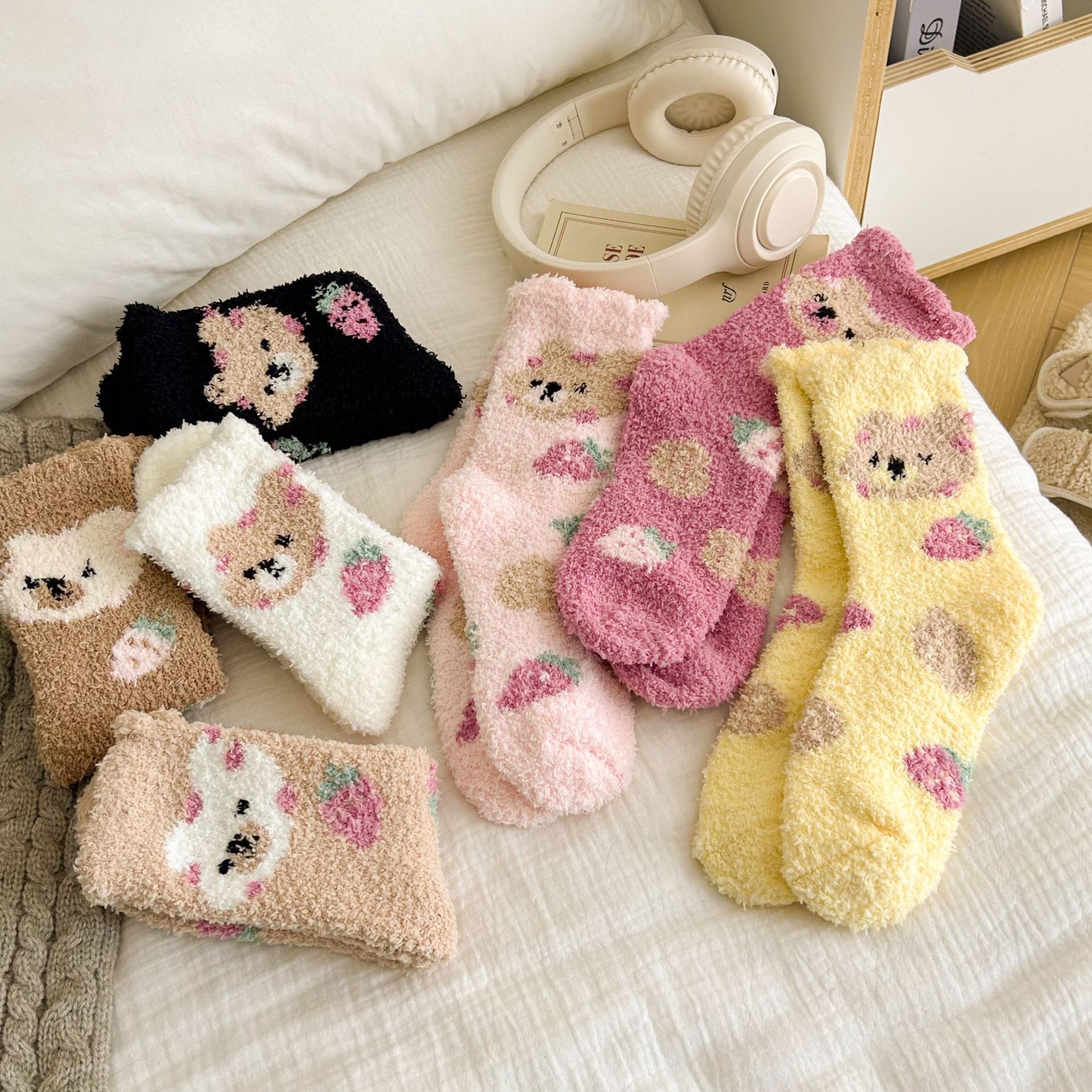 가을 겨울 새로운 산호 벨벳 여성 양말 홈 플로어 양말 달콤하고 귀여운 곰 양말 여성 수면 양말 중간 튜브 만화 양말