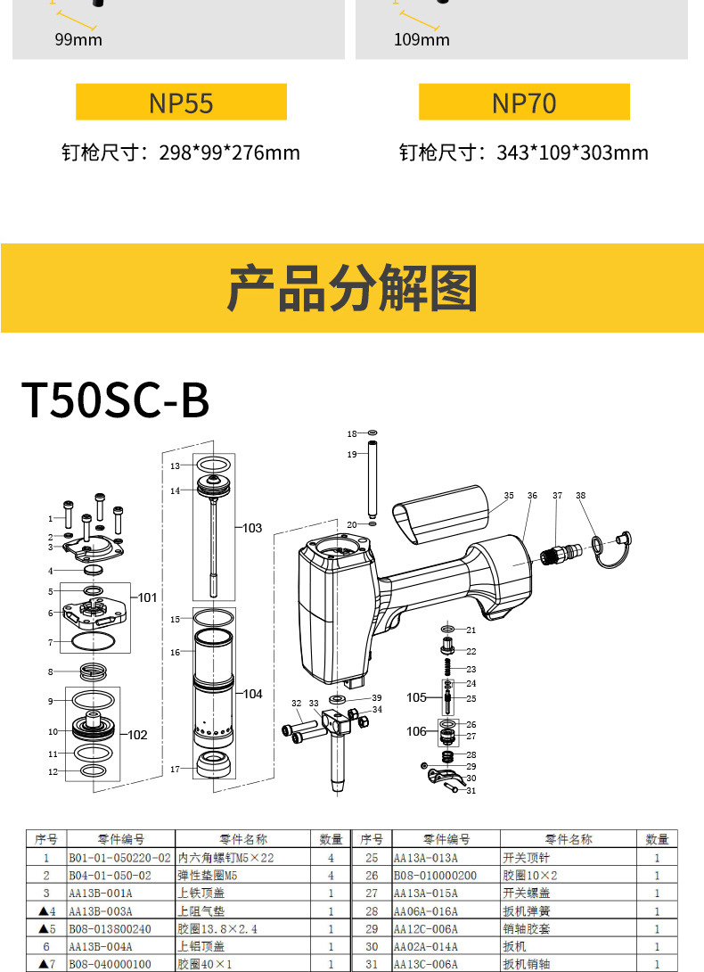 • T50SC-B에는 발사 핀 + 유지 보수 오일 + 렌치가 함께 제공됩니다.