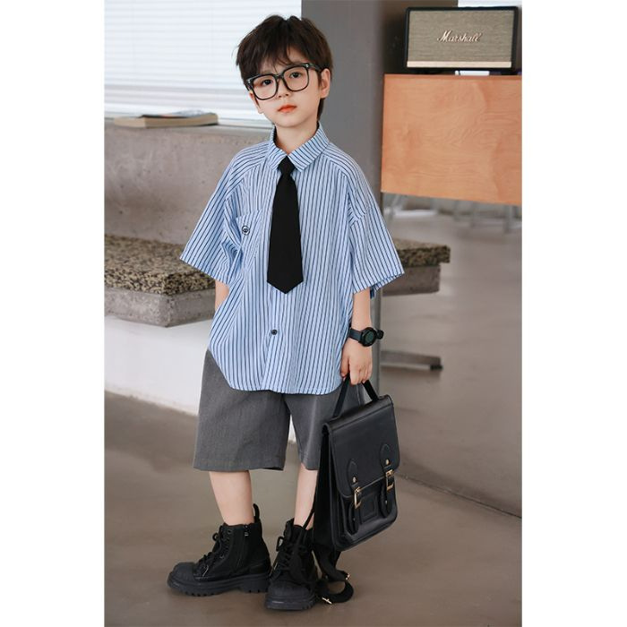 소년 여름 반팔 셔츠 어린이 여름 한국어 버전 2025 새로운 베이비 스트라이프 대학 스타일 셔츠 아동 의류 남성스토어 가기