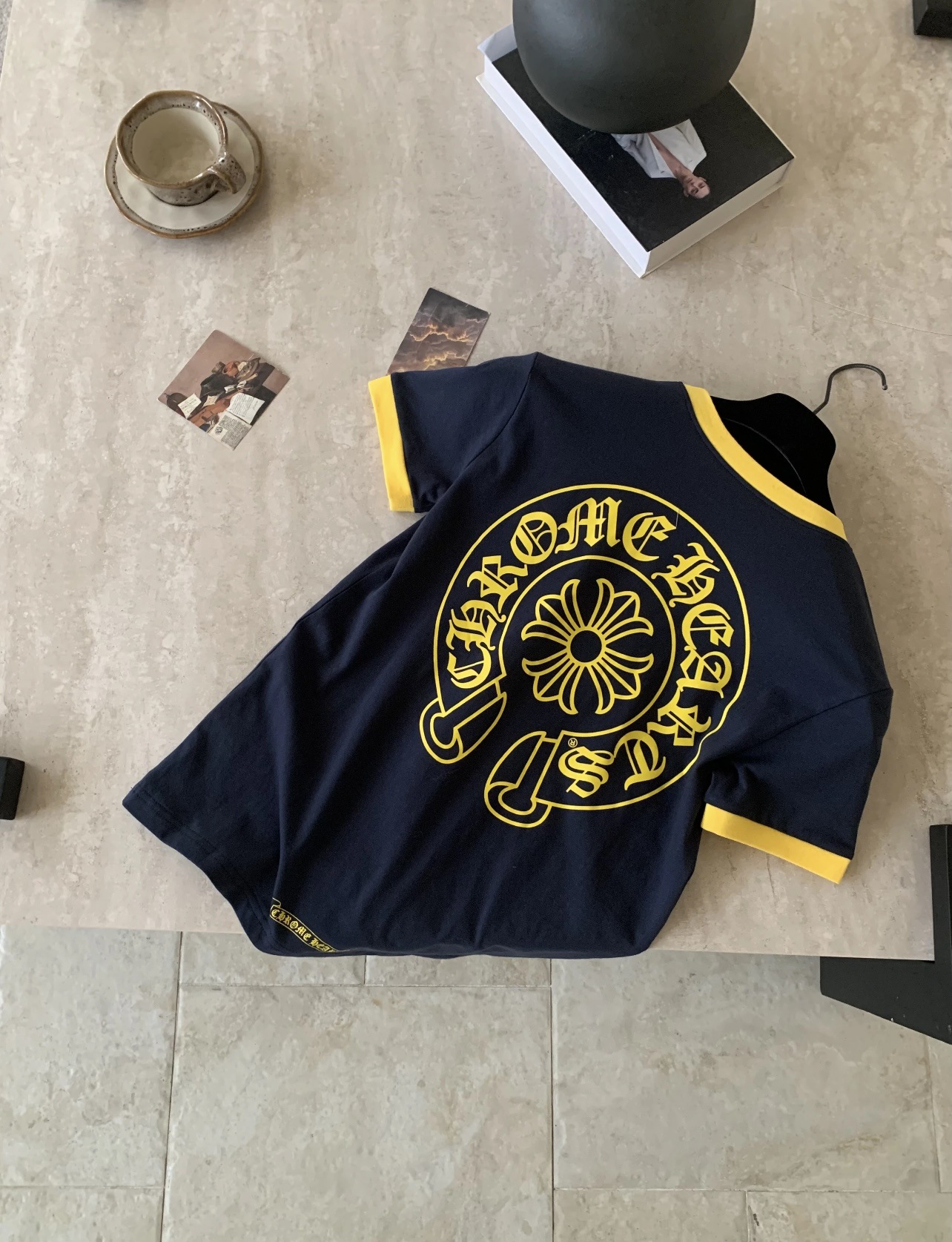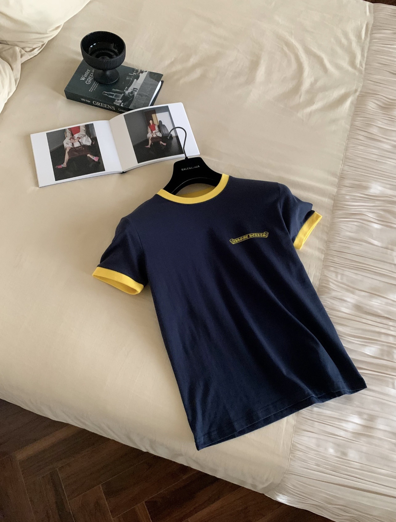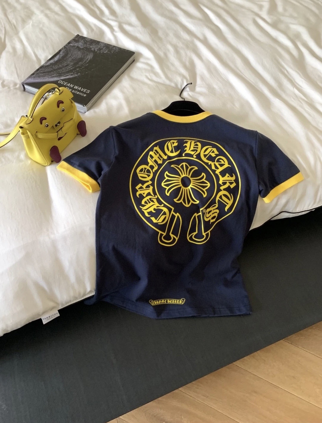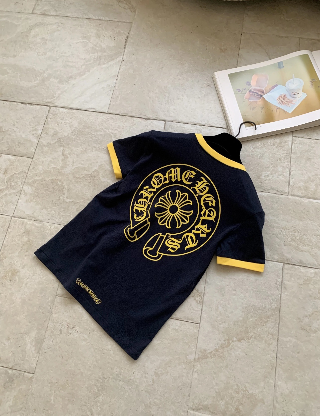 고품질 CH25 여름 새로운 틈새 디자인 트렌디 브랜드 눈길을 끄는 대비 색상 말굽 프린트 여성용 반팔 티셔츠스토어 가기