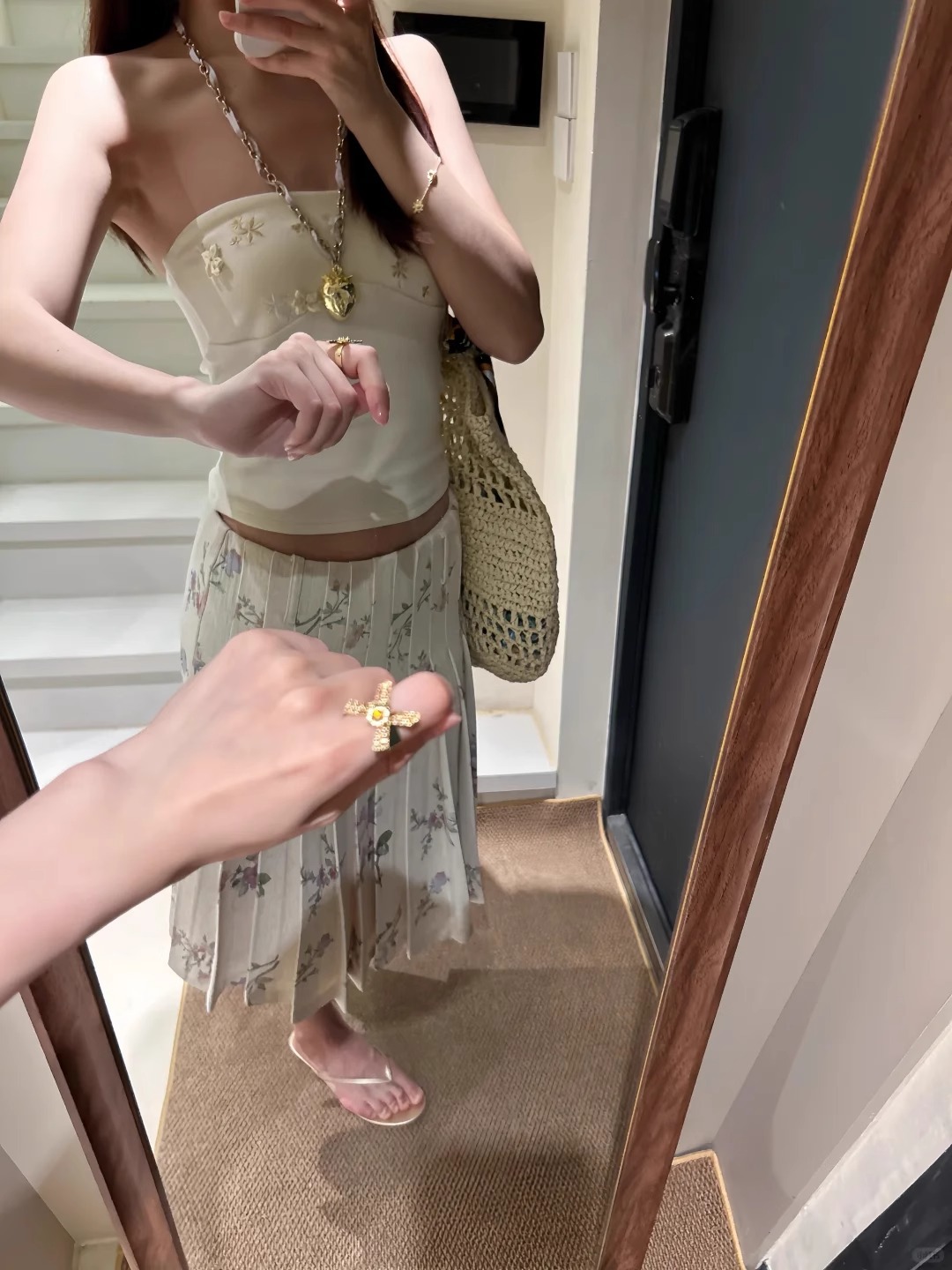 [재고 있음] 레트로 일러스트 꽃무늬 플리츠 스커트 여성 여름 로우 웨이스트 슬리밍 다용도 A라인 스커트 트렌디 미디 스커트스토어 가기