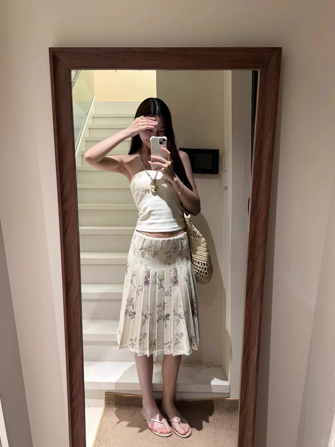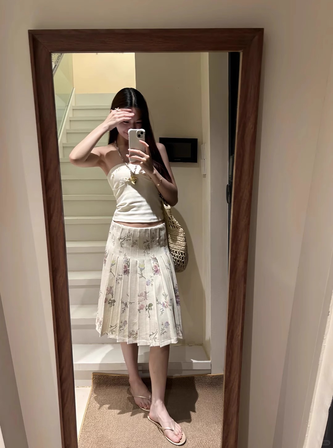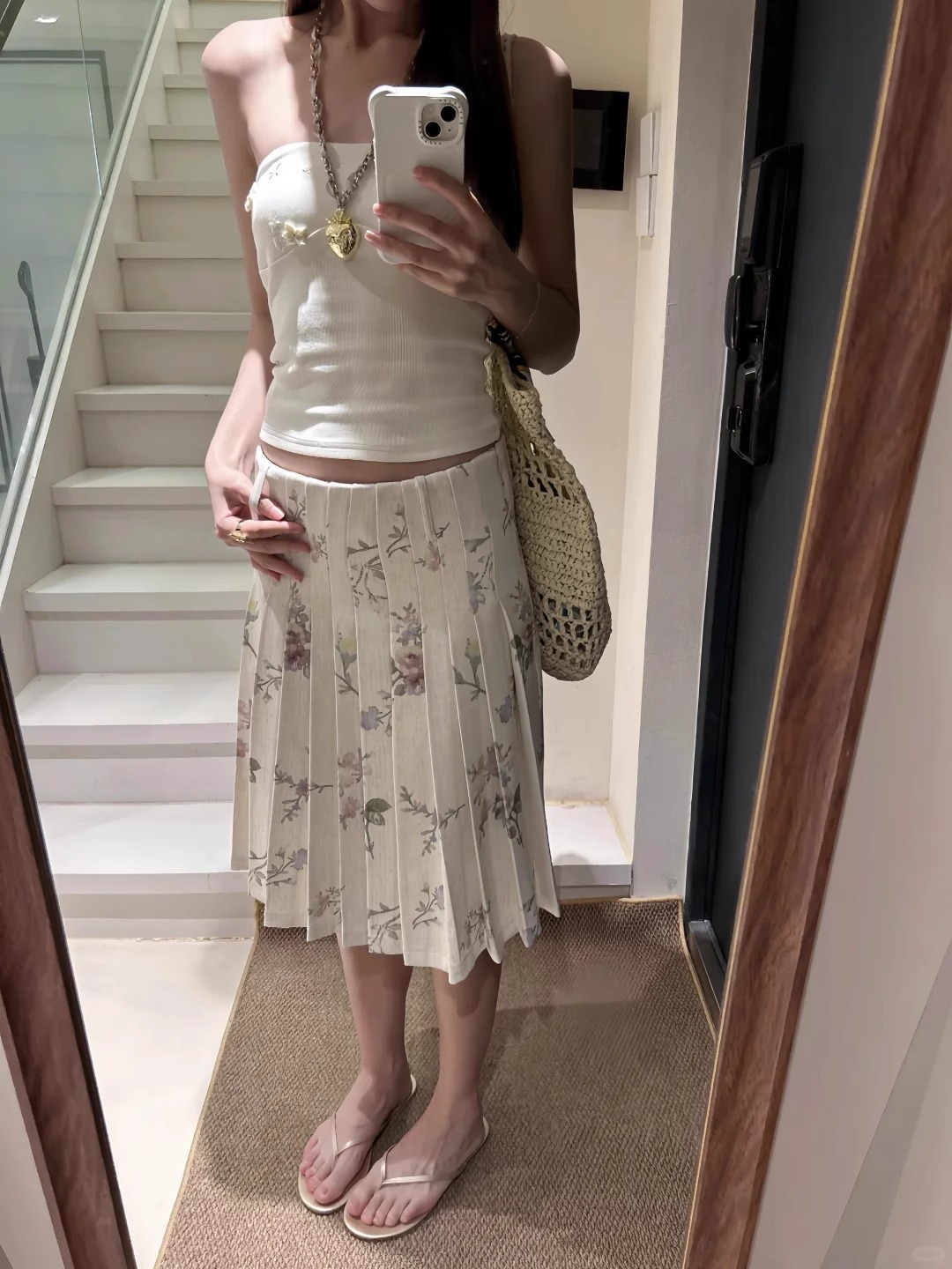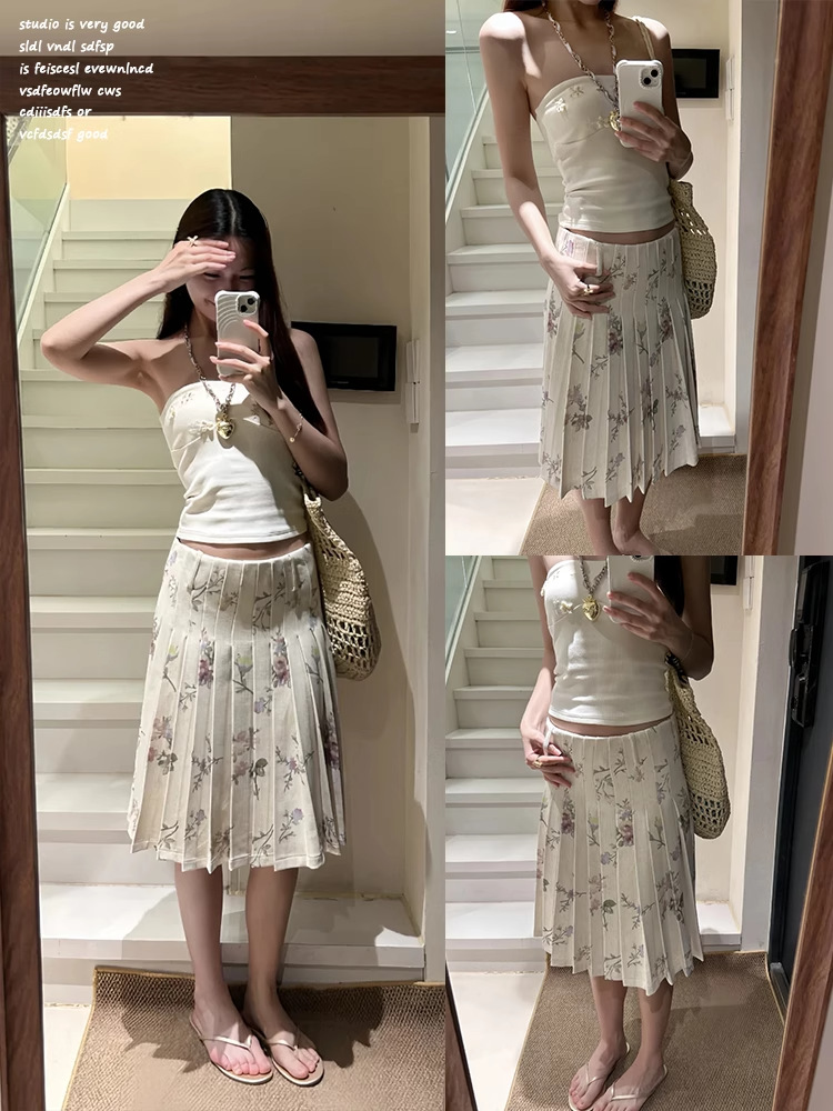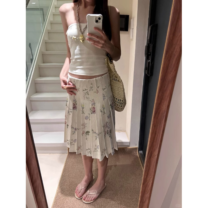 [재고 있음] 레트로 일러스트 꽃무늬 플리츠 스커트 여성 여름 로우 웨이스트 슬리밍 다용도 A라인 스커트 트렌디 미디 스커트