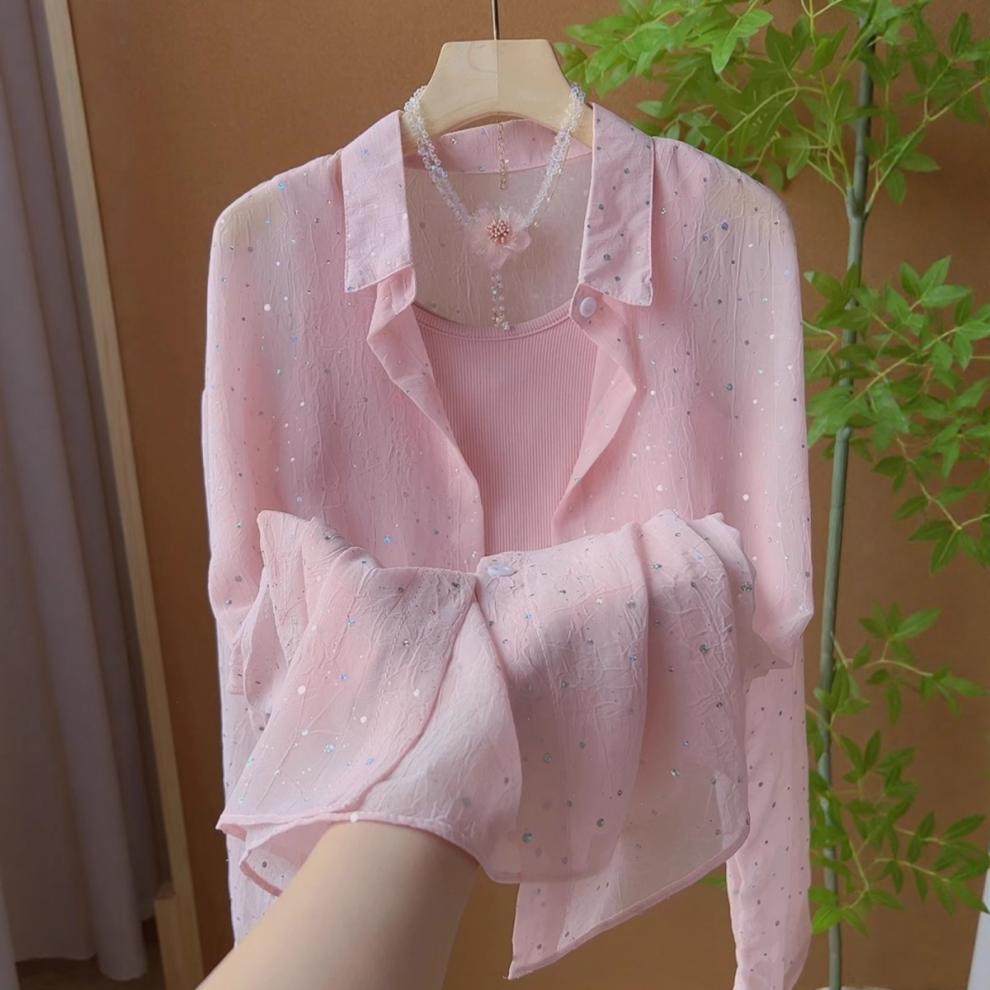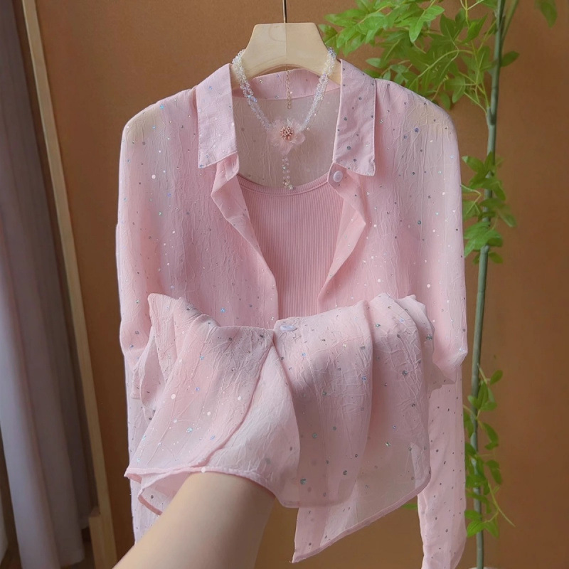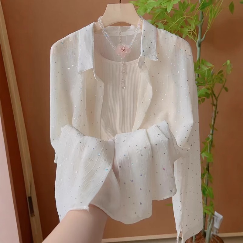 여성을위한 프랑스 달콤하고 부드러운 스타일 스팽글 얇은 자외선 차단 셔츠 여름 캐주얼 루즈 다용도 레이어드 자켓 탑