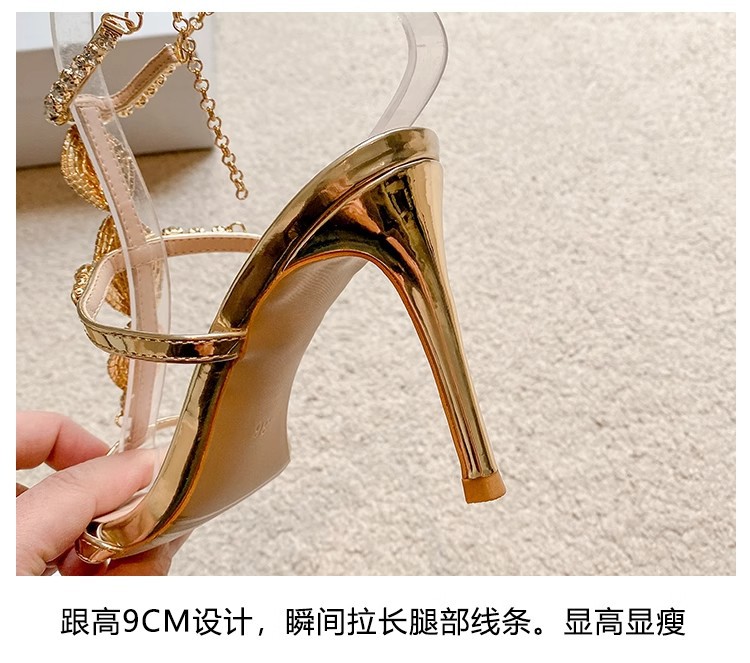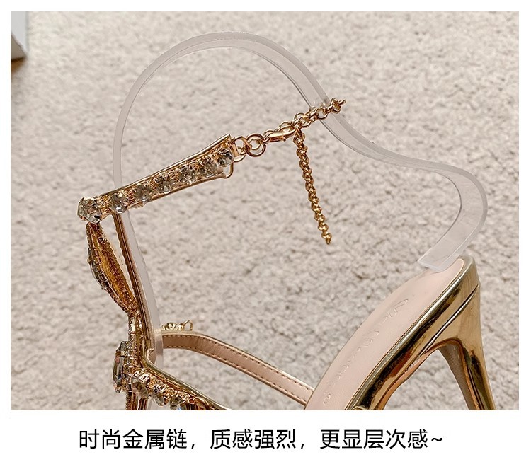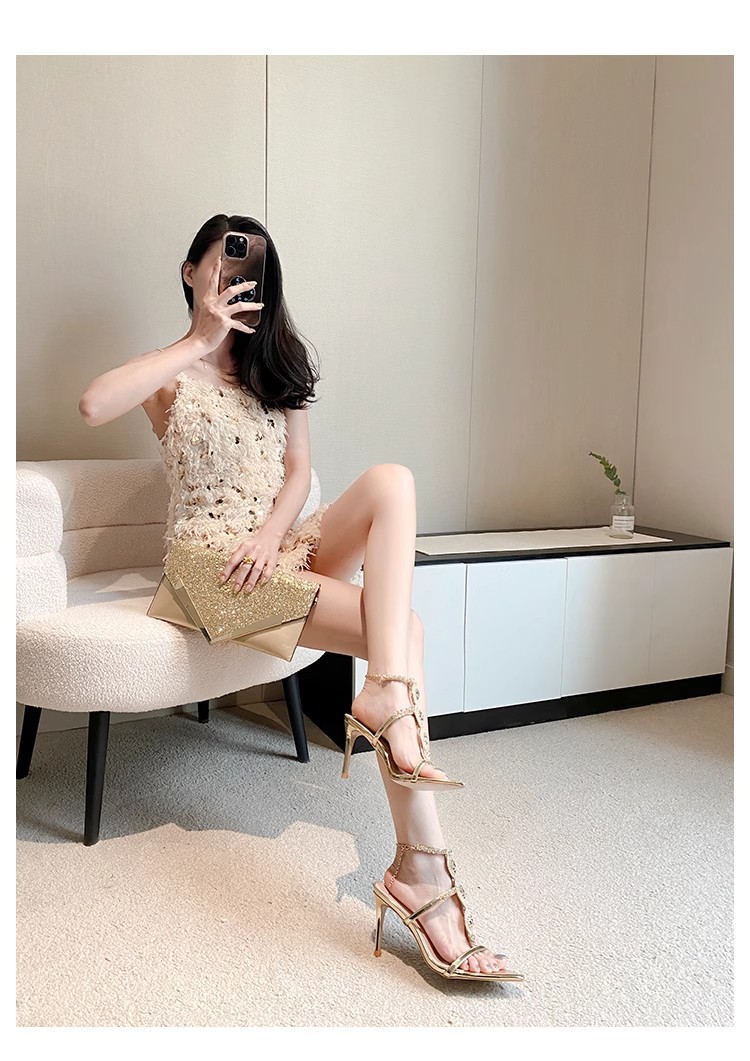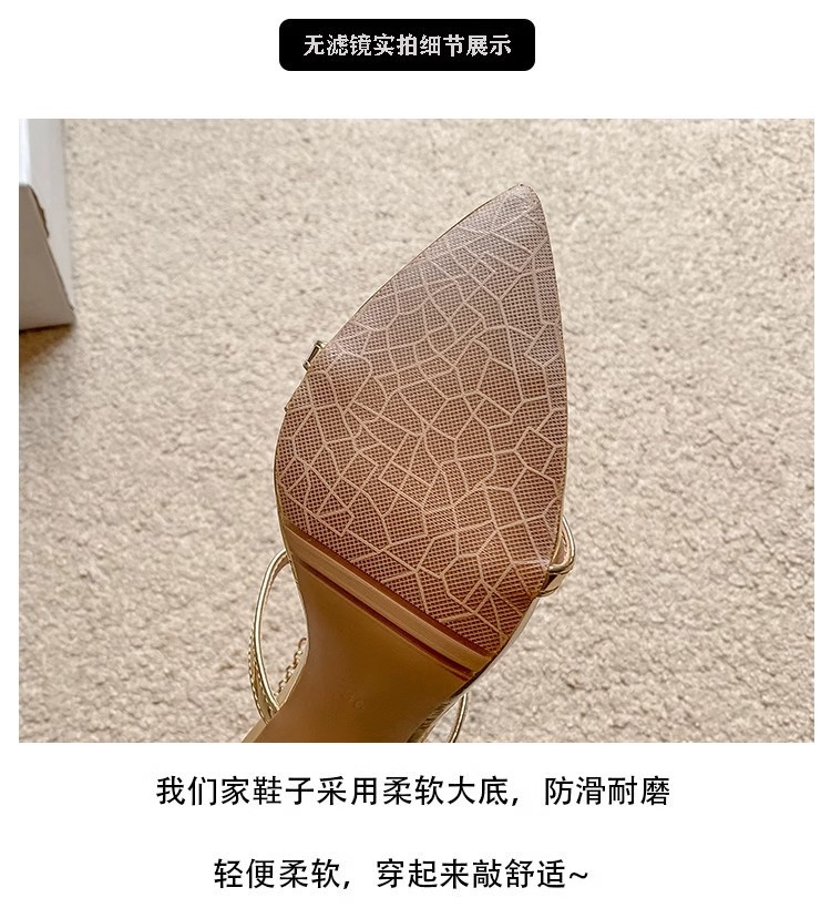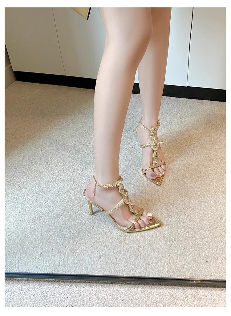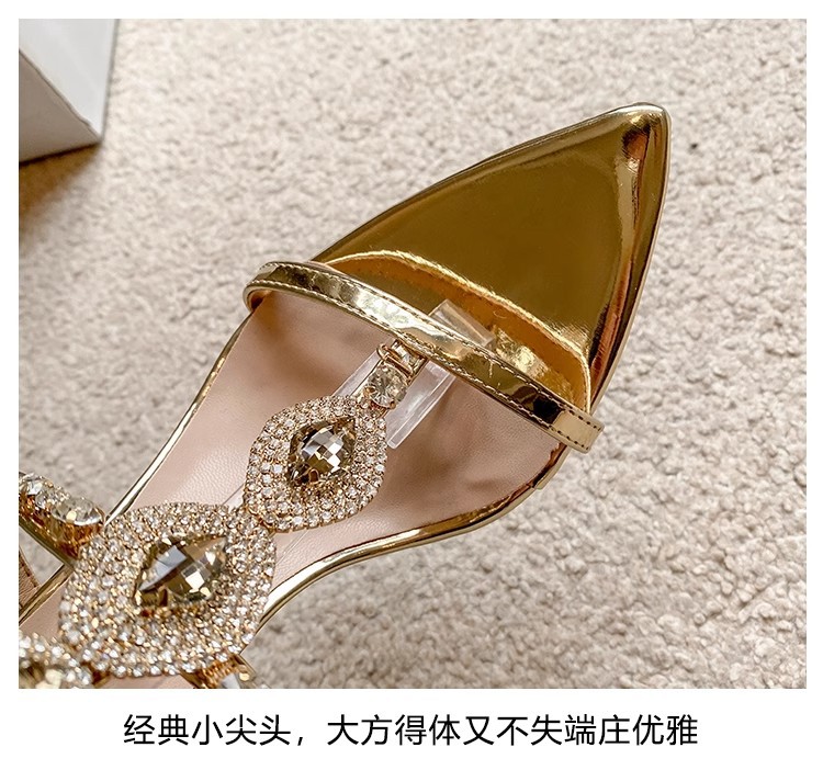 2025 여름 섹시 연회 나이트 클럽 라인스톤 크리스탈 버클 원라인 버클 샌들 포인티드 토 스틸레토 하이힐 여성 골드스토어 가기