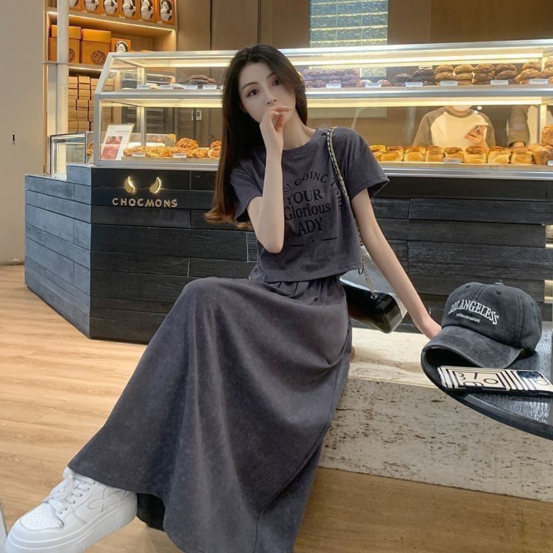 뚱뚱한 여자 정장 여성 여름 기질 연령 감소 심플 스트리트 패션 롱 스커트 투피스 세트