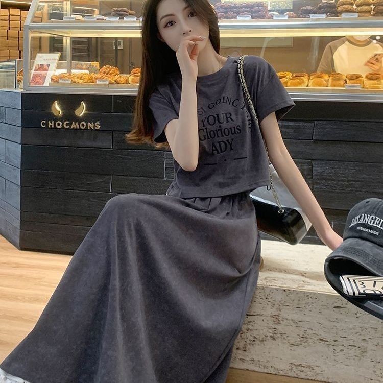 뚱뚱한 여자 정장 여성 여름 기질 연령 감소 심플 스트리트 패션 롱 스커트 투피스 세트스토어 가기