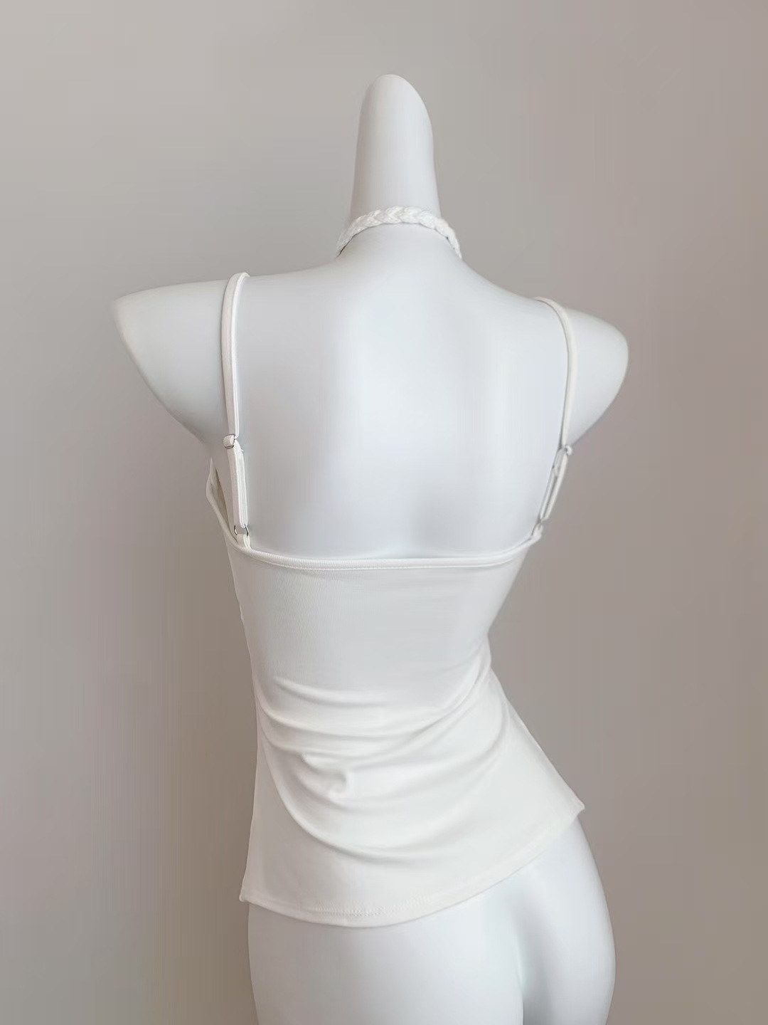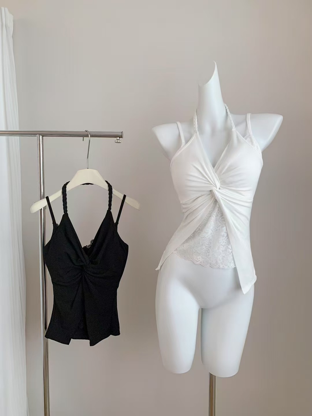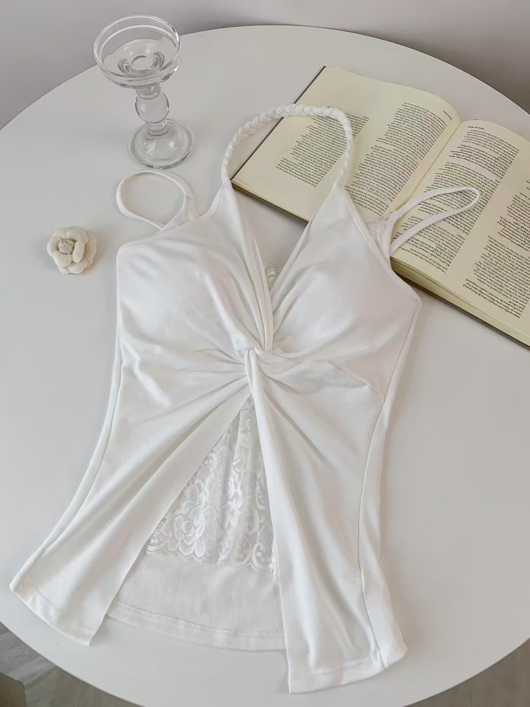 여름 여성을 위한 흰색 홀터넥 캐미솔, 가슴 패드가 있는 레이스 섹시한 핫걸 짧은 디자인 아우터 탑