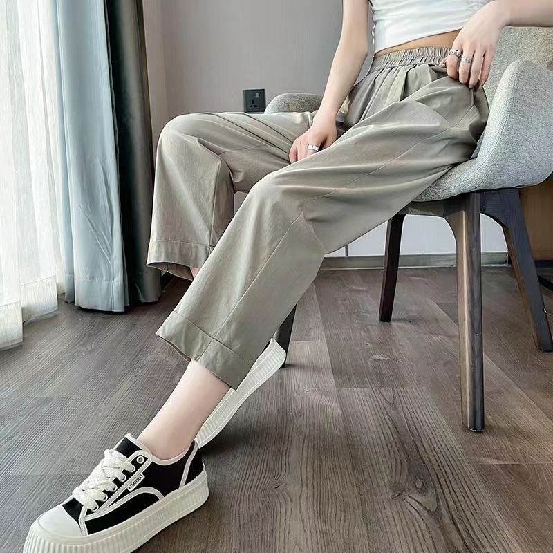 여름용 여성용 아이스 실크 와이드 팬츠 얇은 하이웨이스트 슬리밍 시원한 속건성 9부 커프스 워크웨어 스트레이트 팬츠스토어 가기