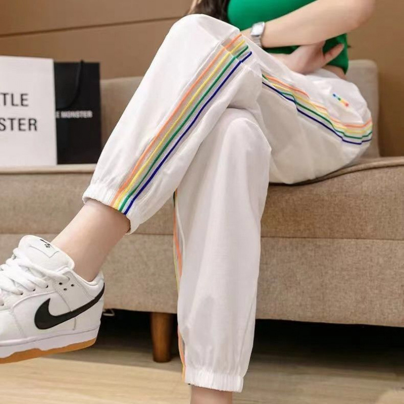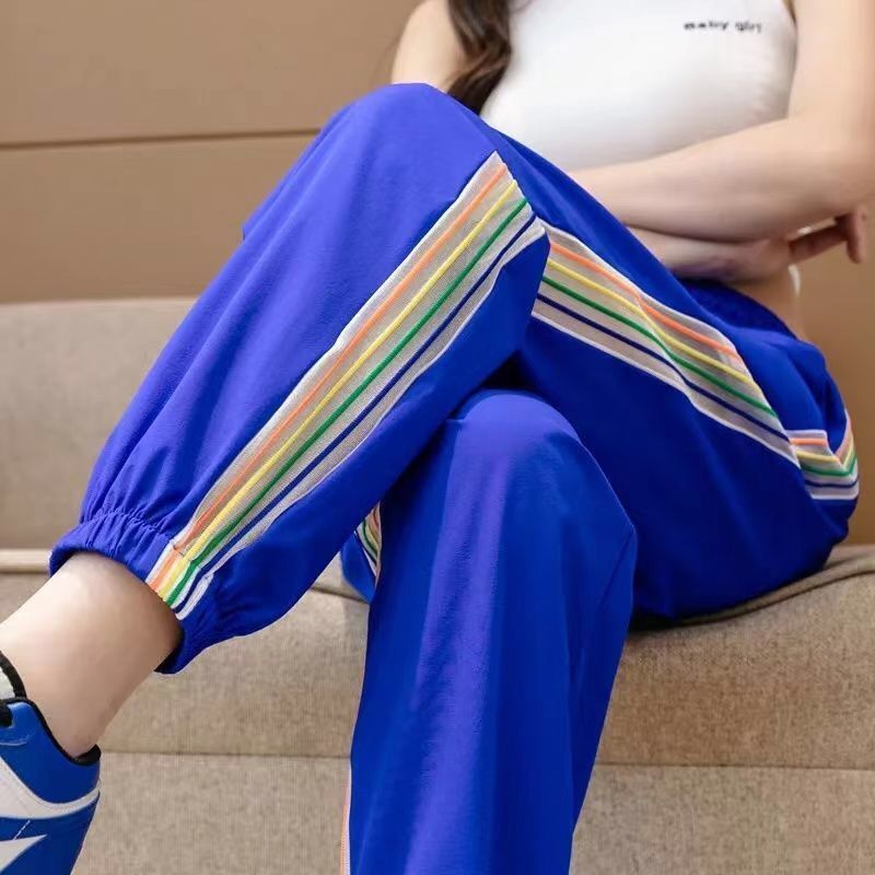 여름용 여성용 컬러풀 아이스 실크 속건 팬츠, 얇은 뚱 레인보우 스트라이프 하렘 스웨트팬츠, 루즈한 대형 레깅스 스웨트팬츠스토어 가기