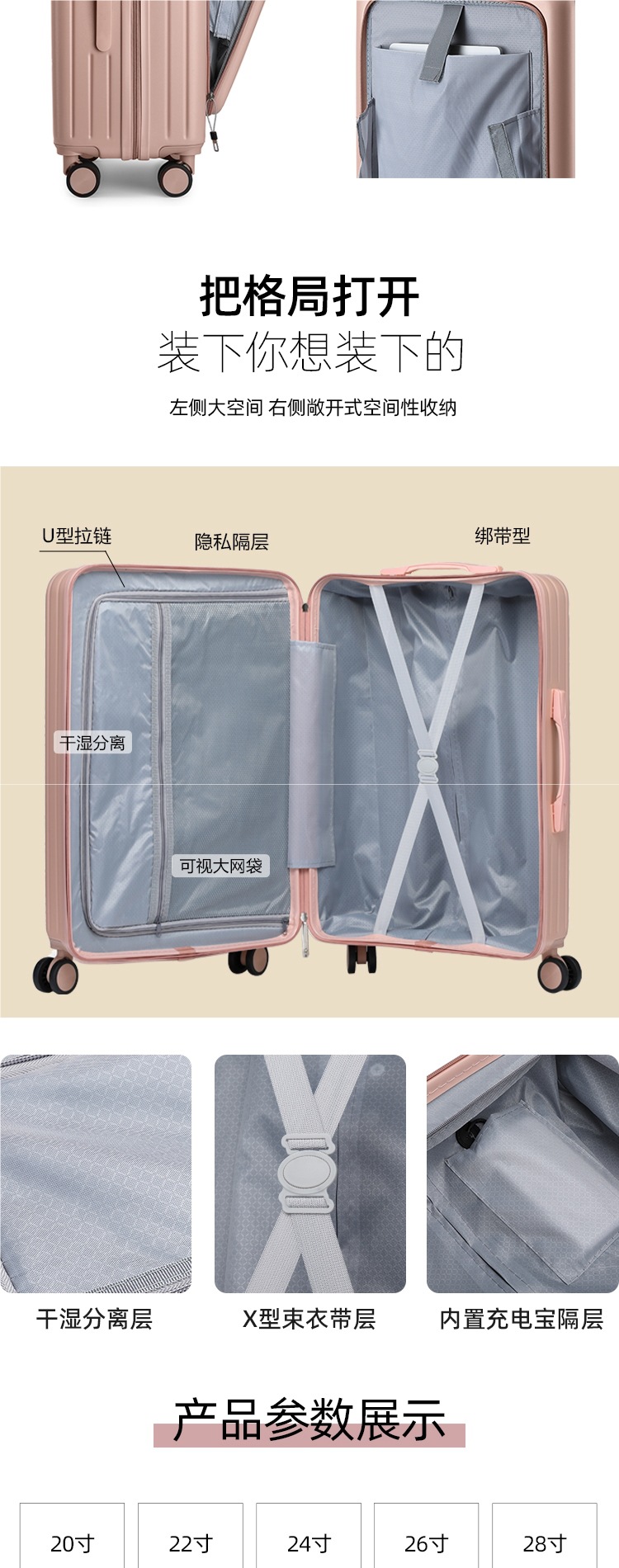 전면 개방형 여행가방 20inch 소형 탑승 가방 24inch 소년 소녀용 대용량 비밀번호 여행가방 트롤리 가방