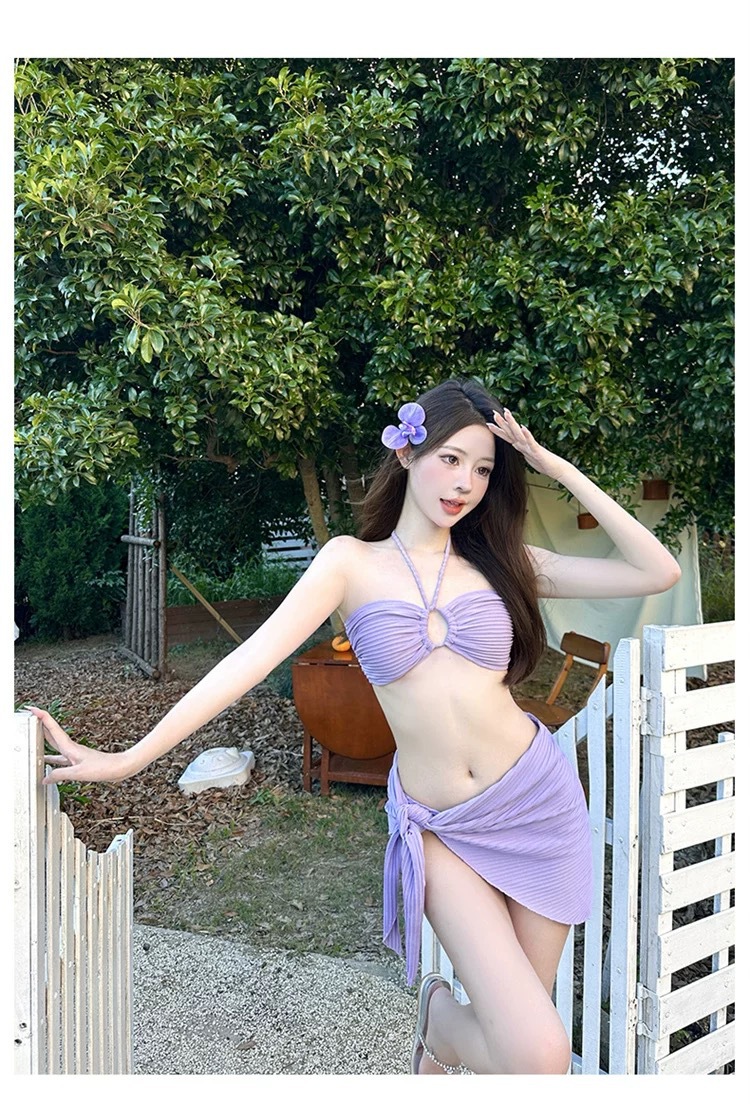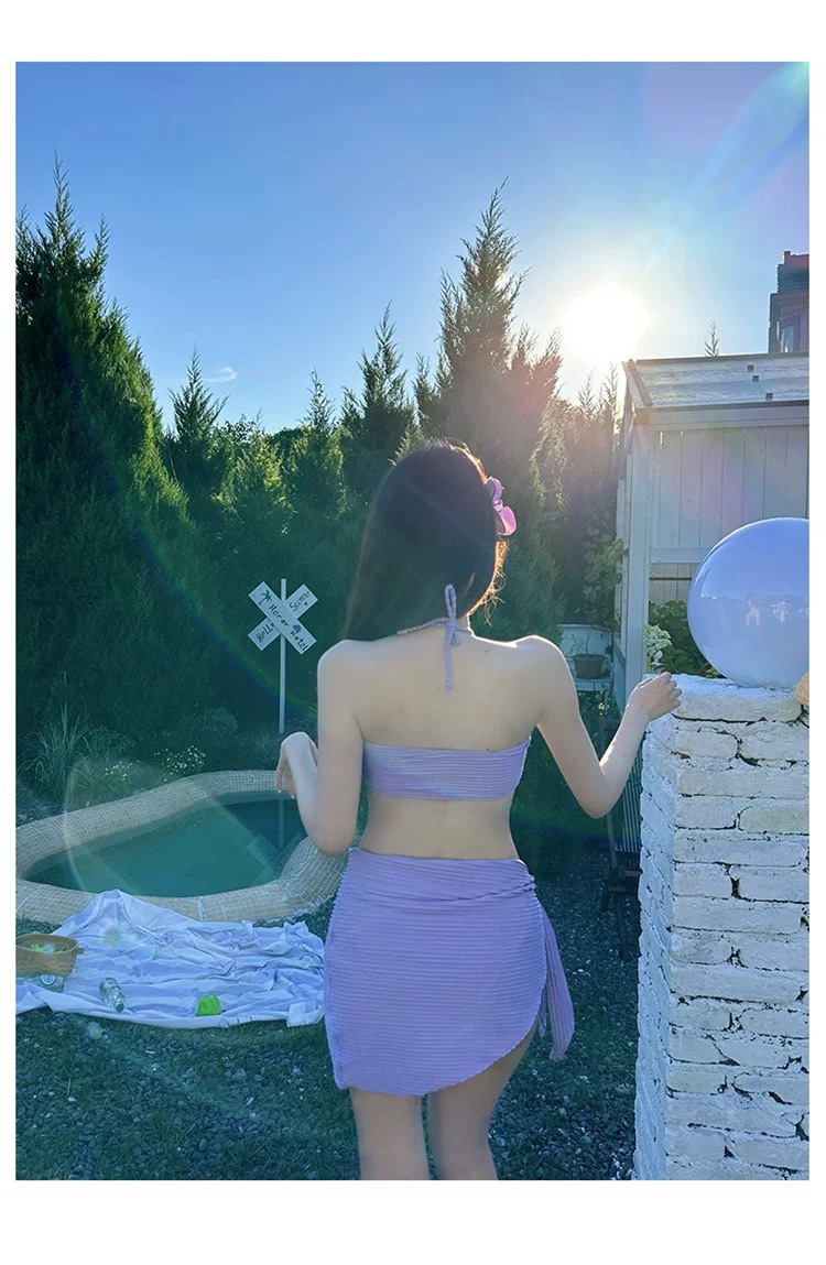 스플릿 스커트 비키니 3피스 세트, 퍼플 화이트 홀터넥, 속이 빈 디자인, 아름답고 섹시한 백리스 비치스토어 가기