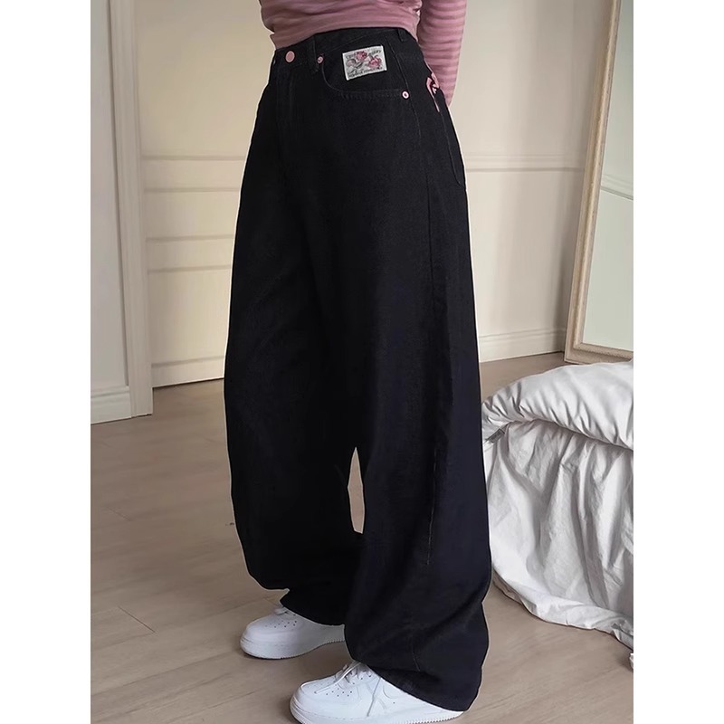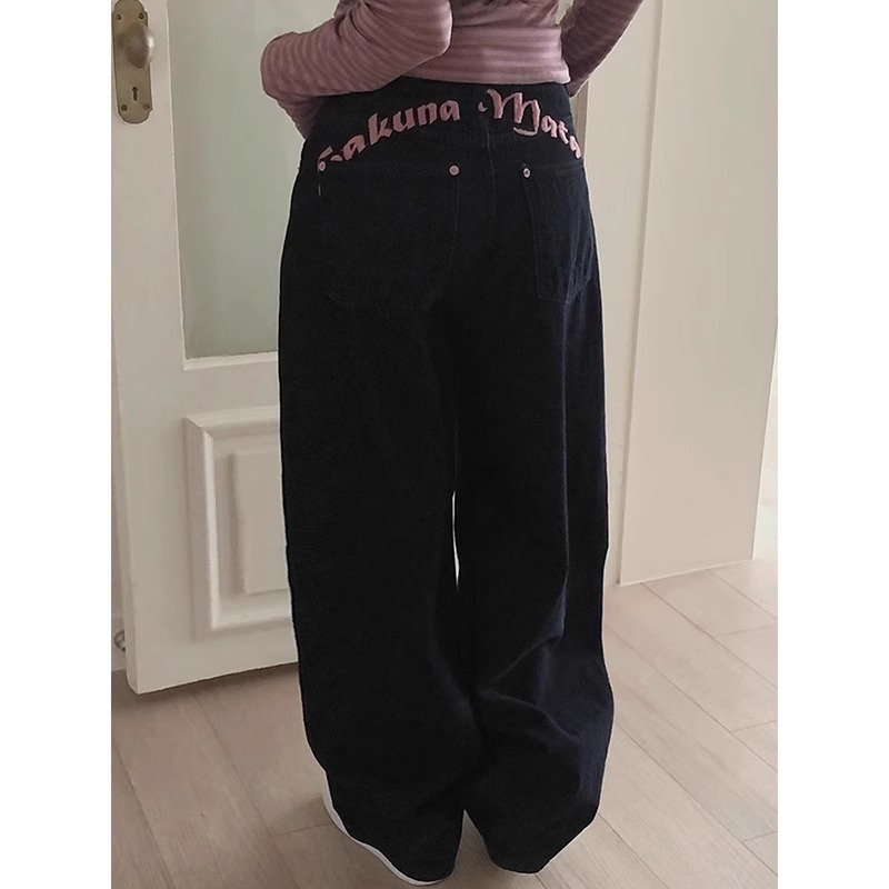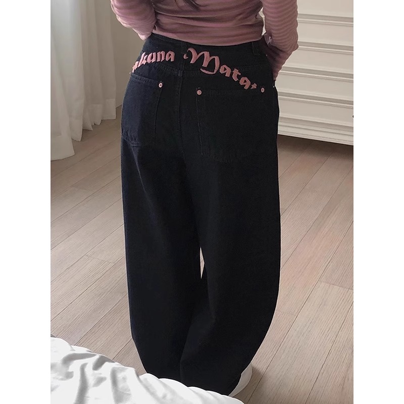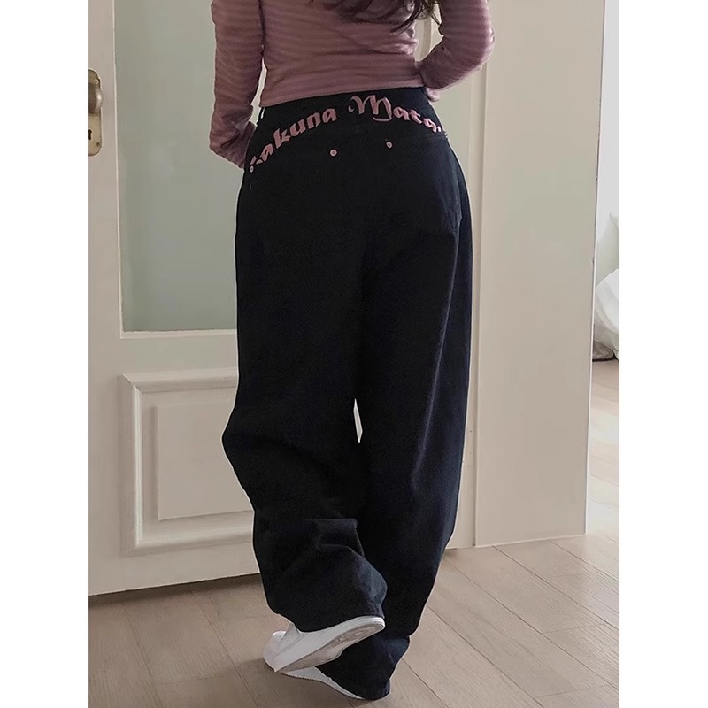 여성을위한 뒷면에 검은 색 자수 문자 인쇄 청바지 봄 새로운 달콤하고 시원한 뜨거운 소녀 하이 웨이스트 슬림 롱 바지