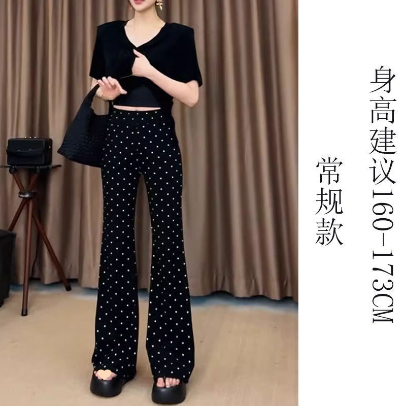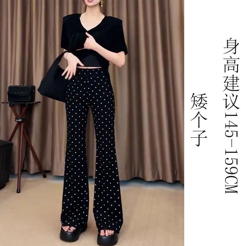 여름 여성을 위한 블랙 폴카 도트 프린트 스트레이트 캐주얼 바지 새로운 얇은 하이 웨이스트 스트레치 슬리밍 마이크로 플레어 바지스토어 가기