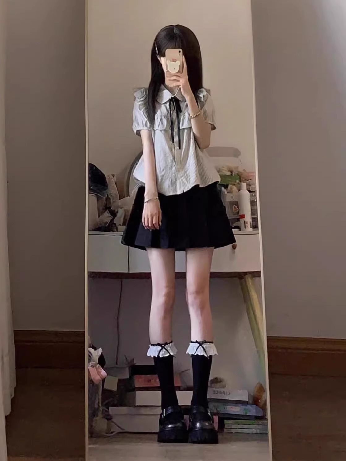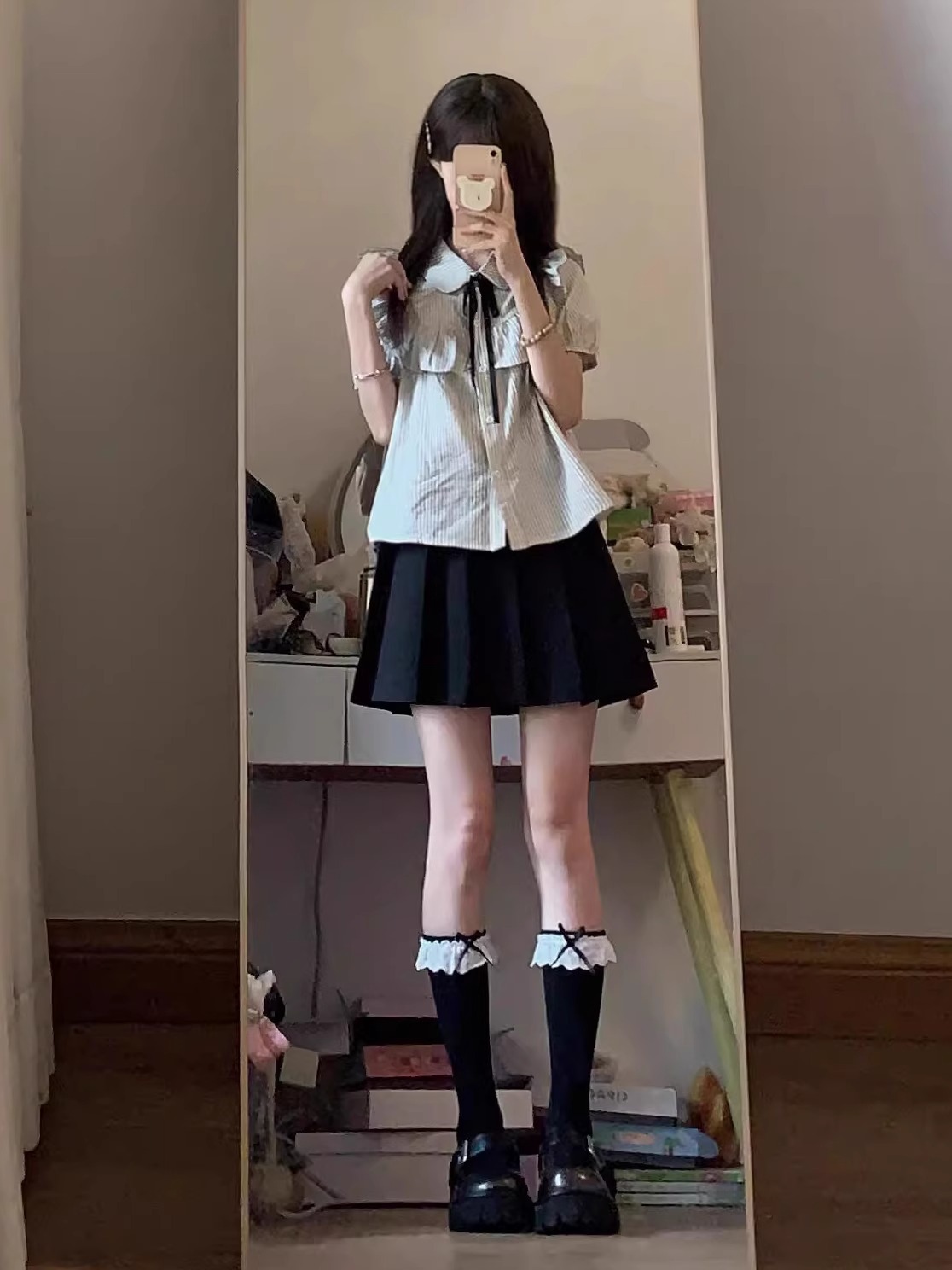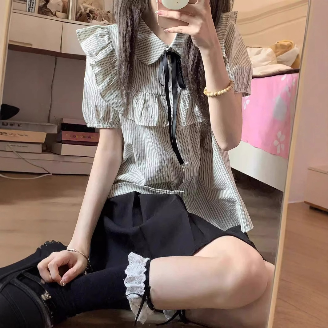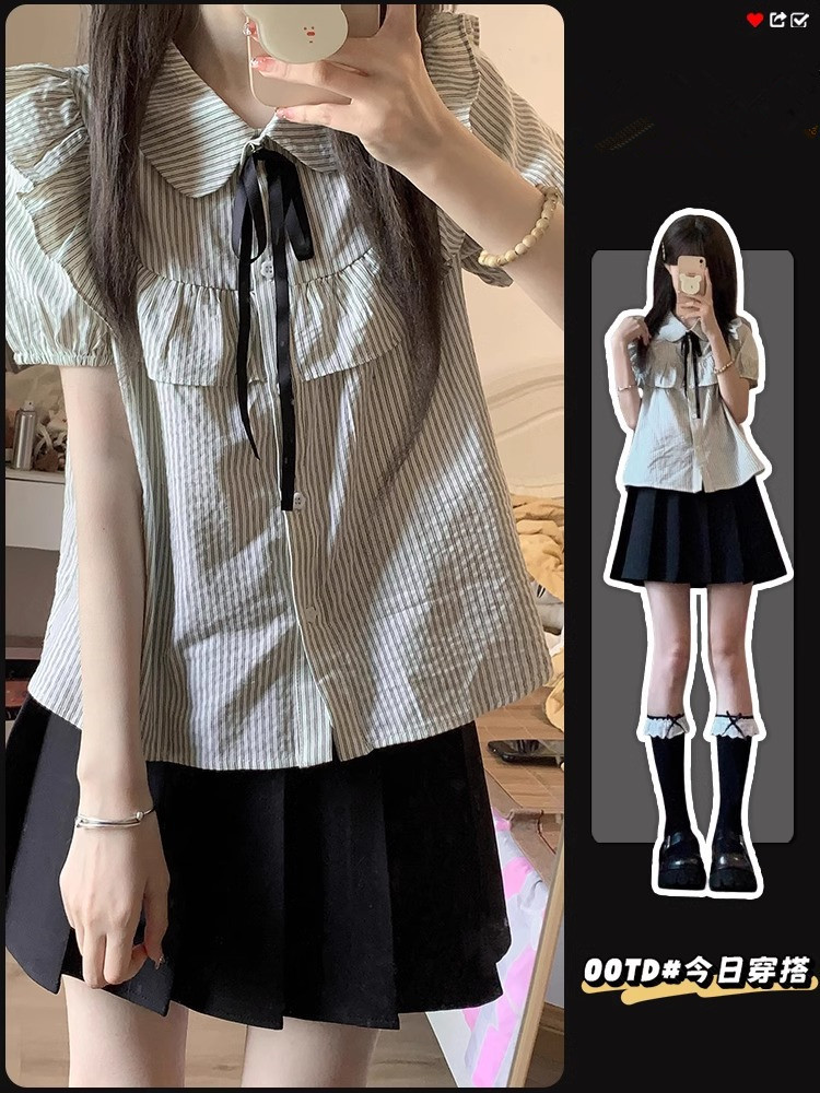 여성을 위한 대학 스타일 스트라이프 러플 퍼프 슬리브 셔츠, 초가을, 달콤한 디자인, 작은 사람들을 위한 슬리밍 짧은 탑