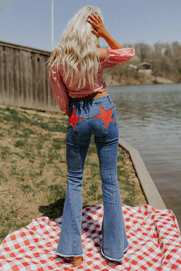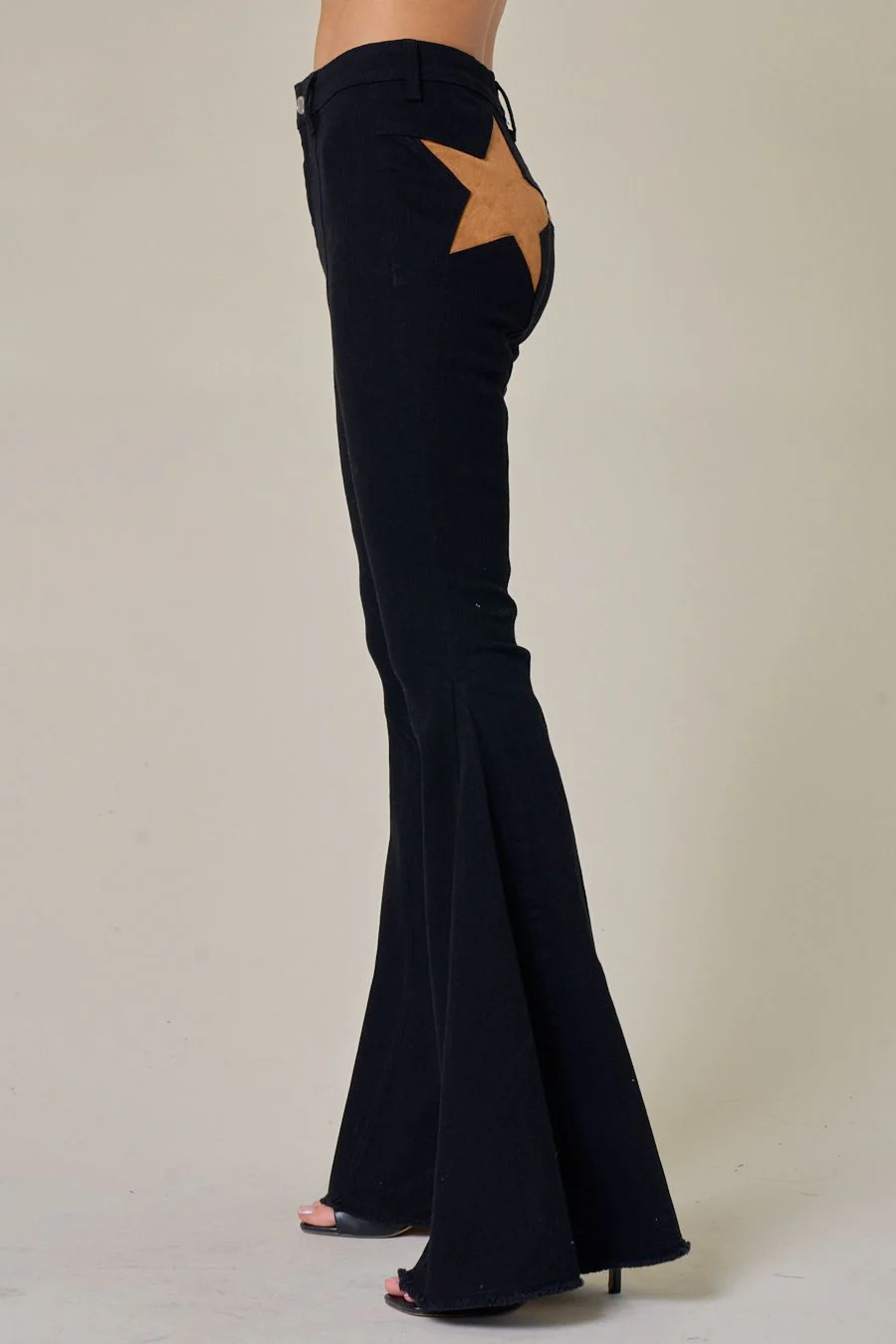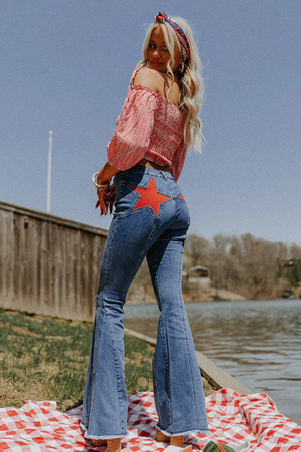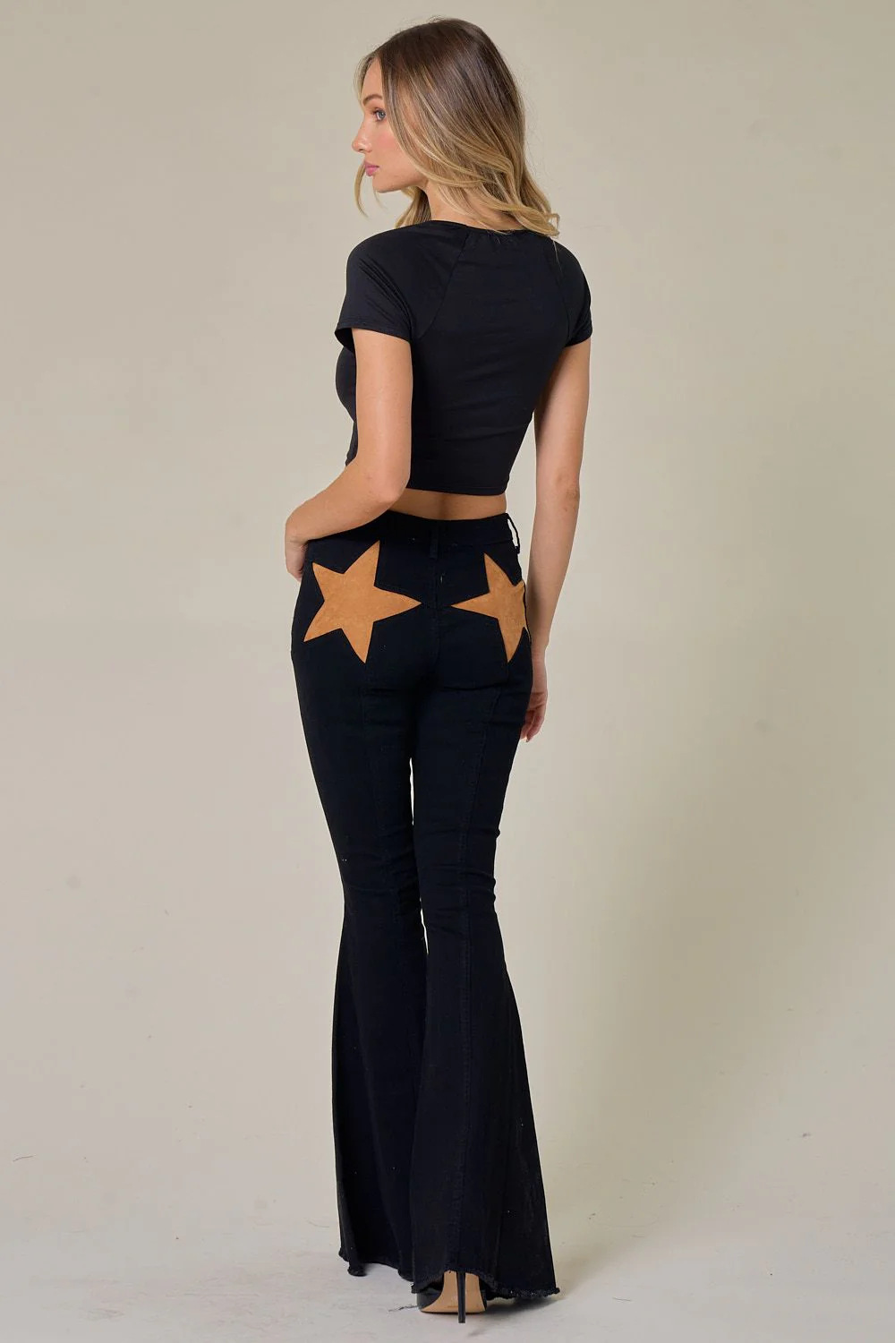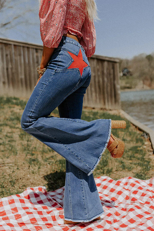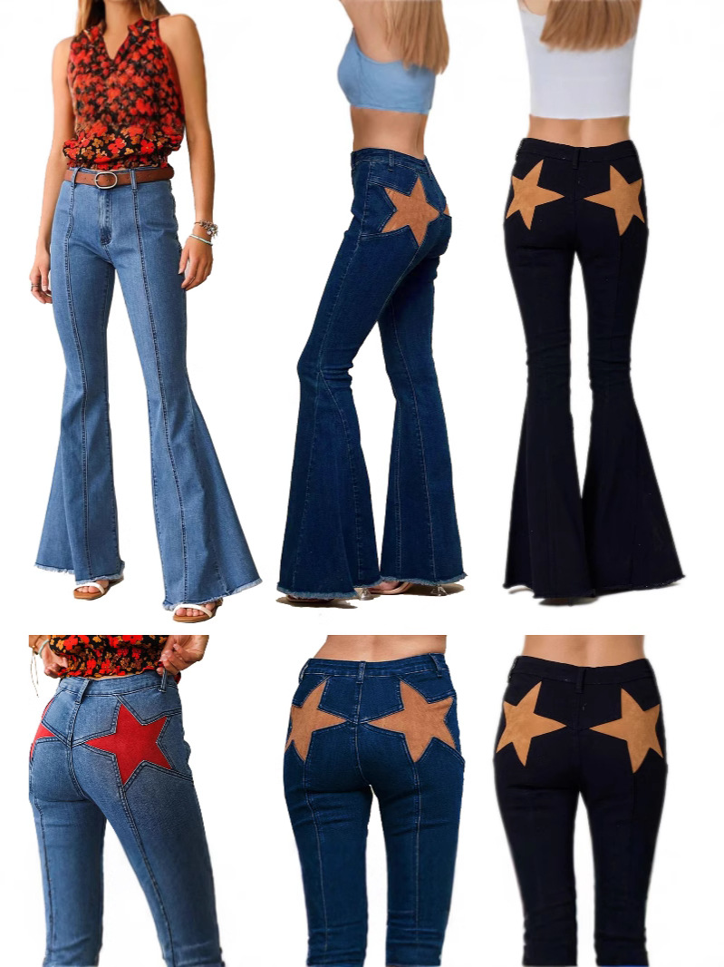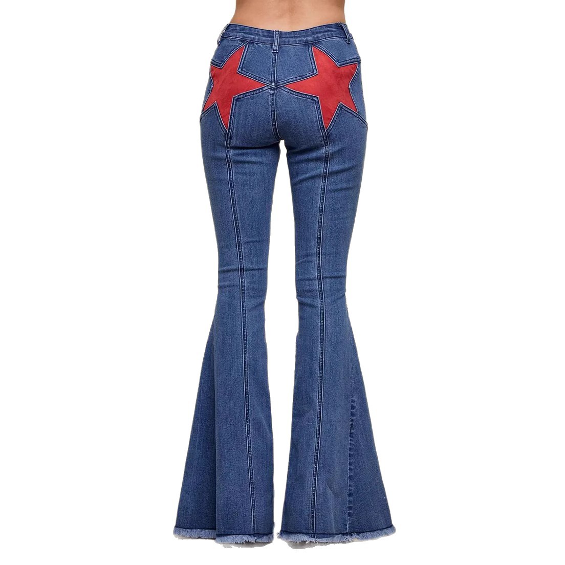 2025 새로운 유럽과 미국의 고품질 섹시한 여성의 중간 허리 탄성 접합 맞춤형 오각형 패치 청바지 여성용스토어 가기