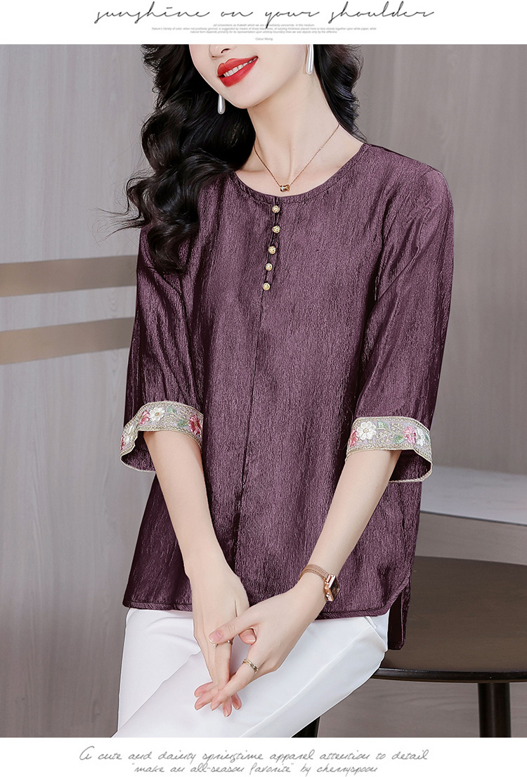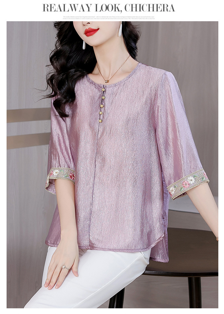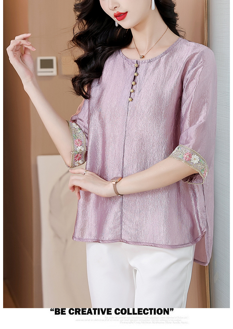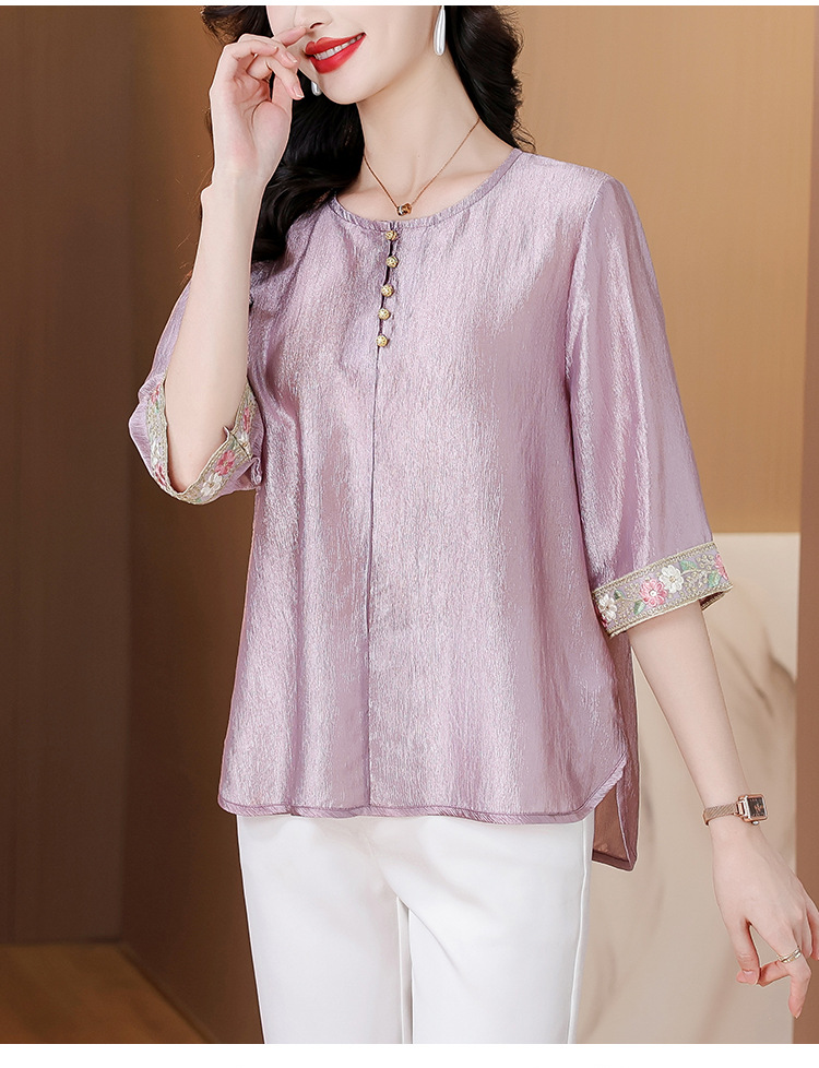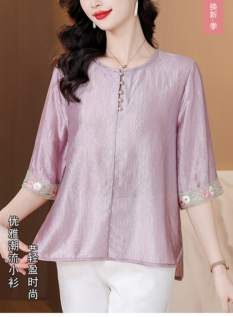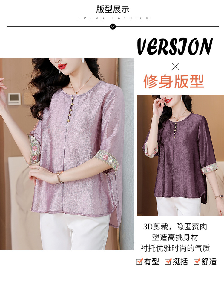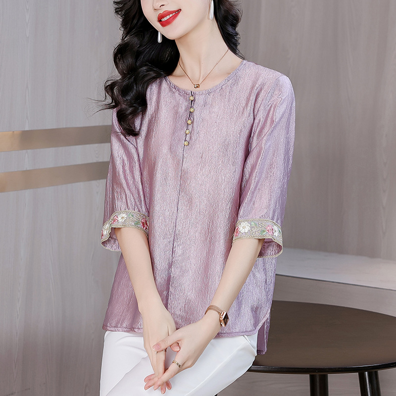 여성을위한 새로운 중국 스타일 수 놓은 레이스 쉬폰 셔츠 2025 여름 새로운 캐주얼 기질 연령 감소 숙녀 라운드 넥 셔츠 여름스토어 가기