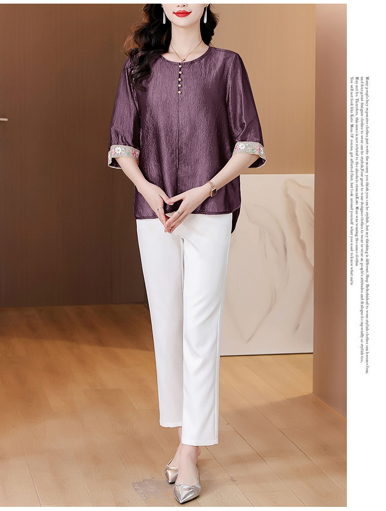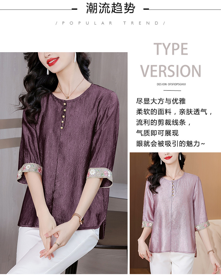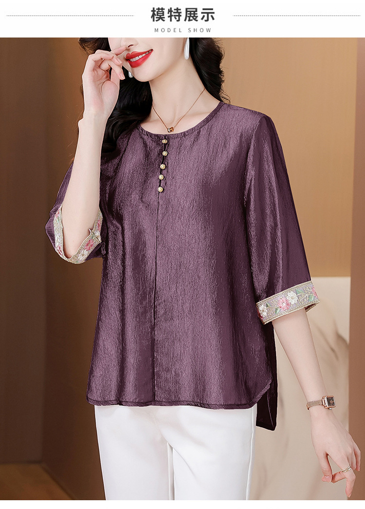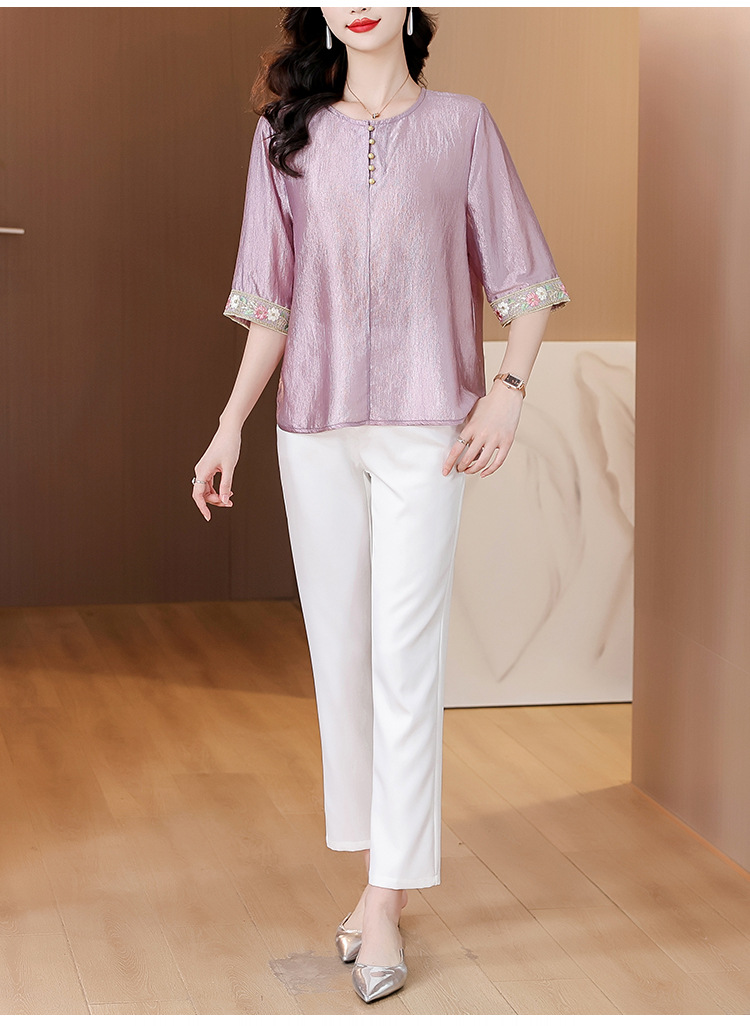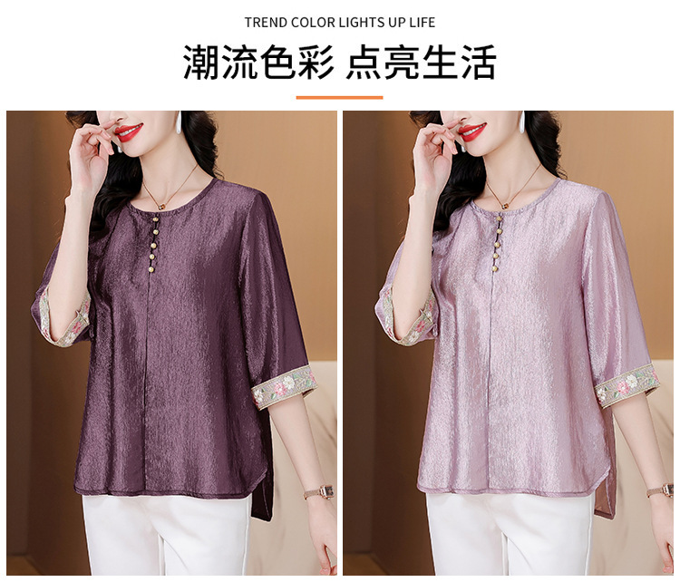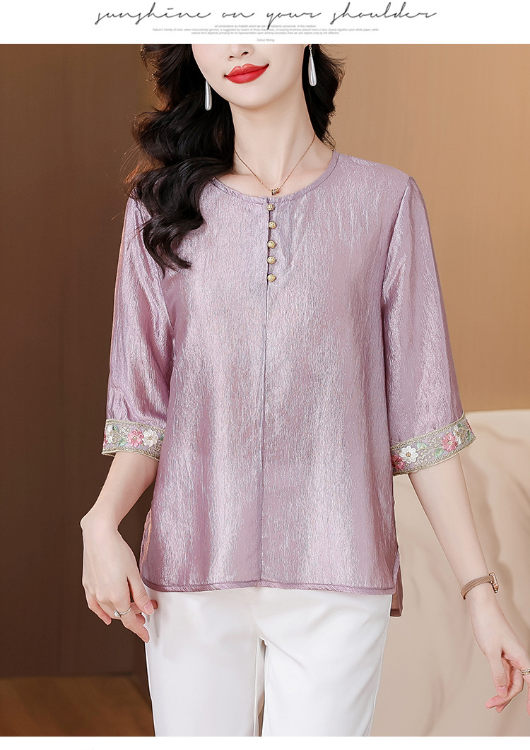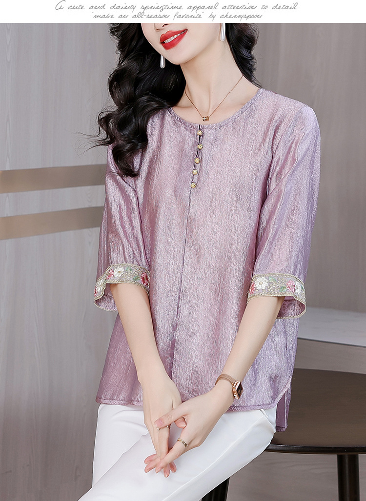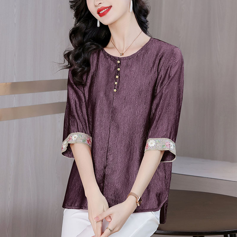 여성을위한 새로운 중국 스타일 수 놓은 레이스 쉬폰 셔츠 2025 여름 새로운 캐주얼 기질 연령 감소 숙녀 라운드 넥 셔츠 여름스토어 가기