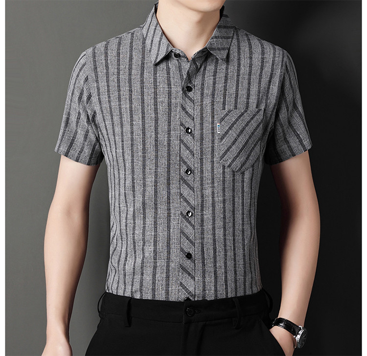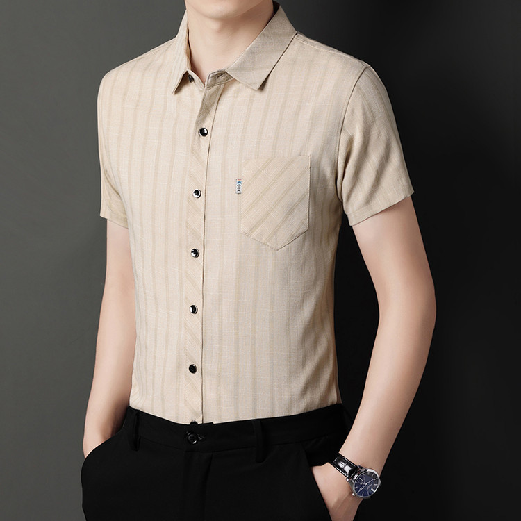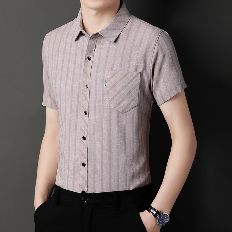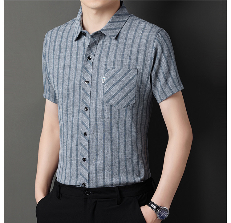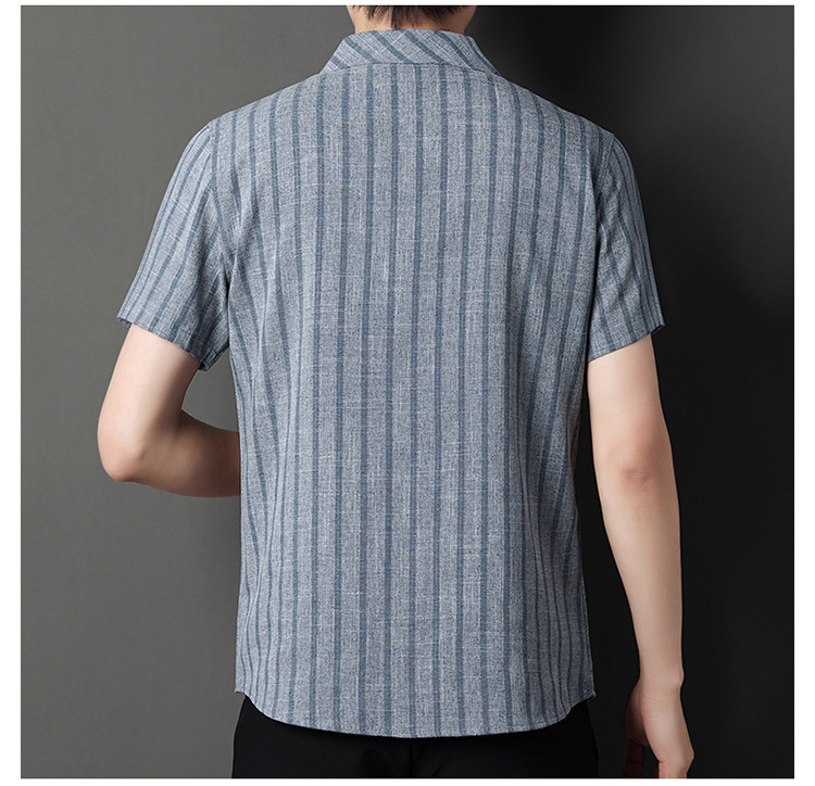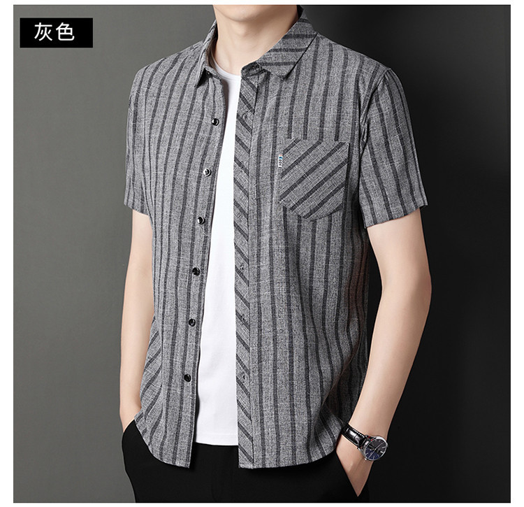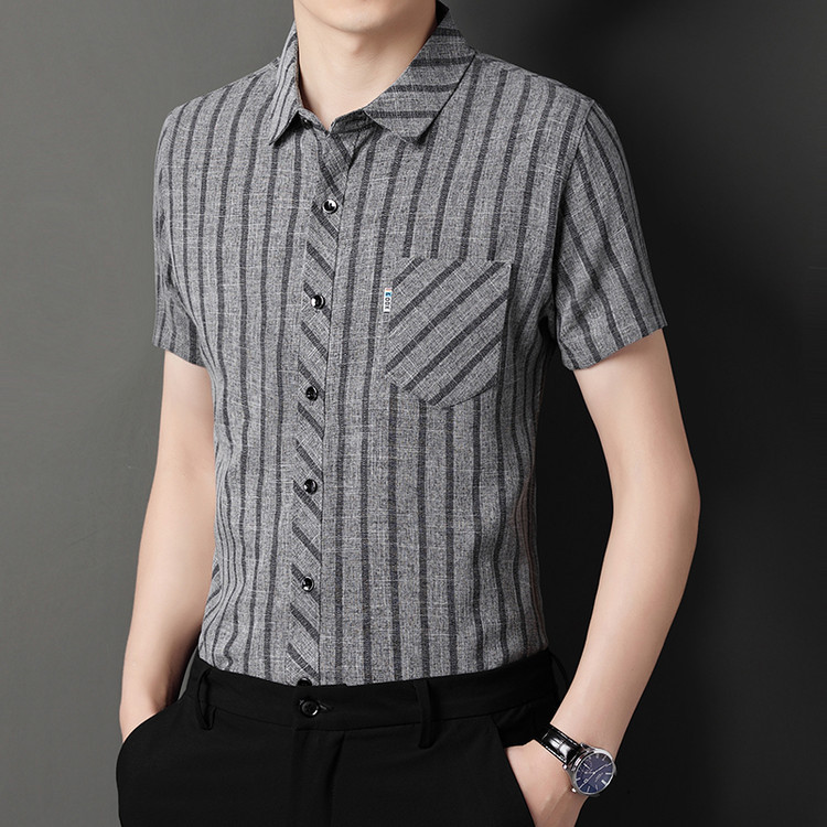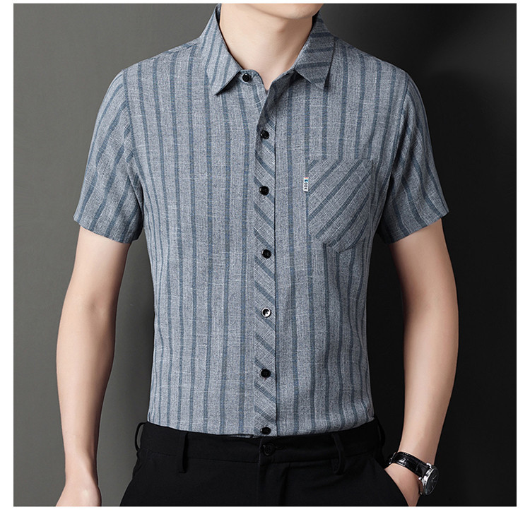 남성 셔츠 반팔 세로 줄무늬 얼음 실크 면 및 린넨 여름 신작 캐주얼 셔츠 남성 여름 크로스 보더 드롭 배송