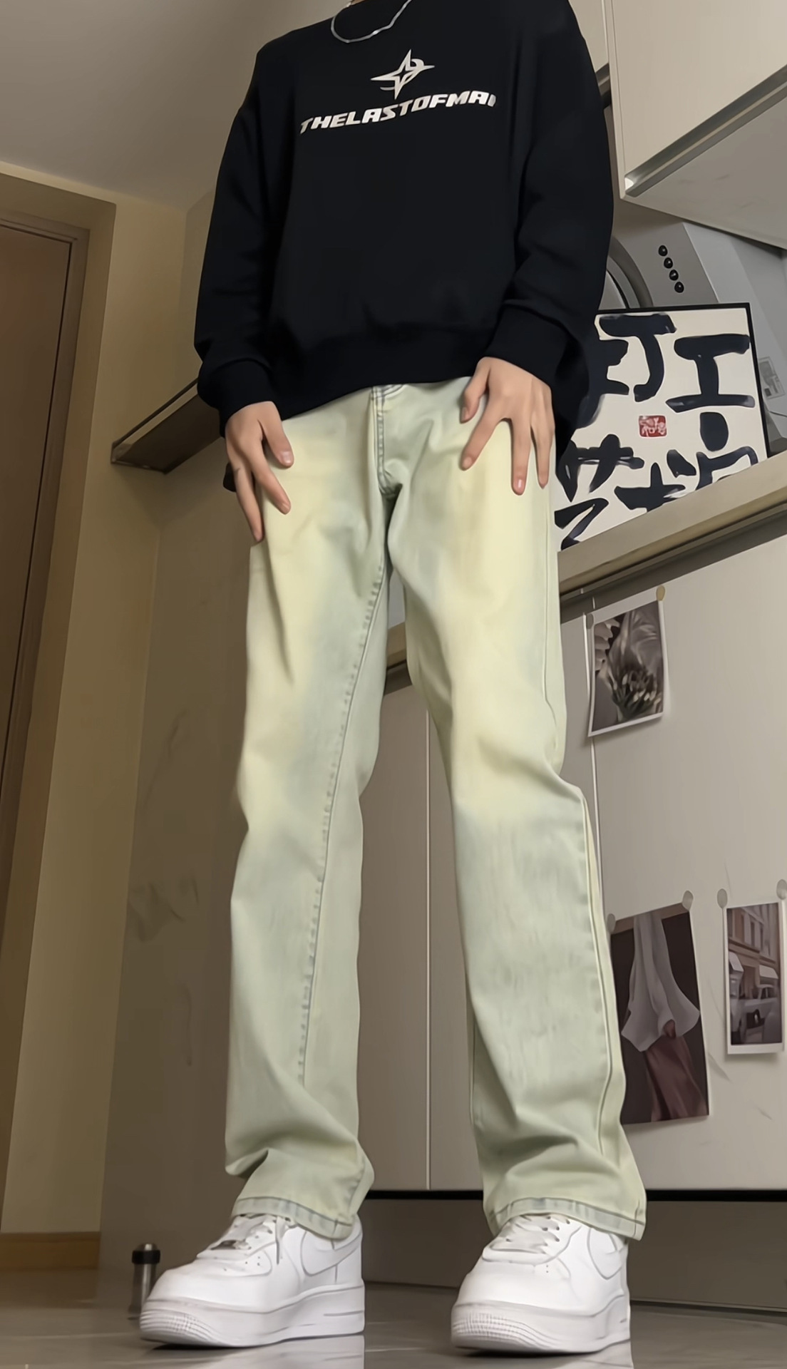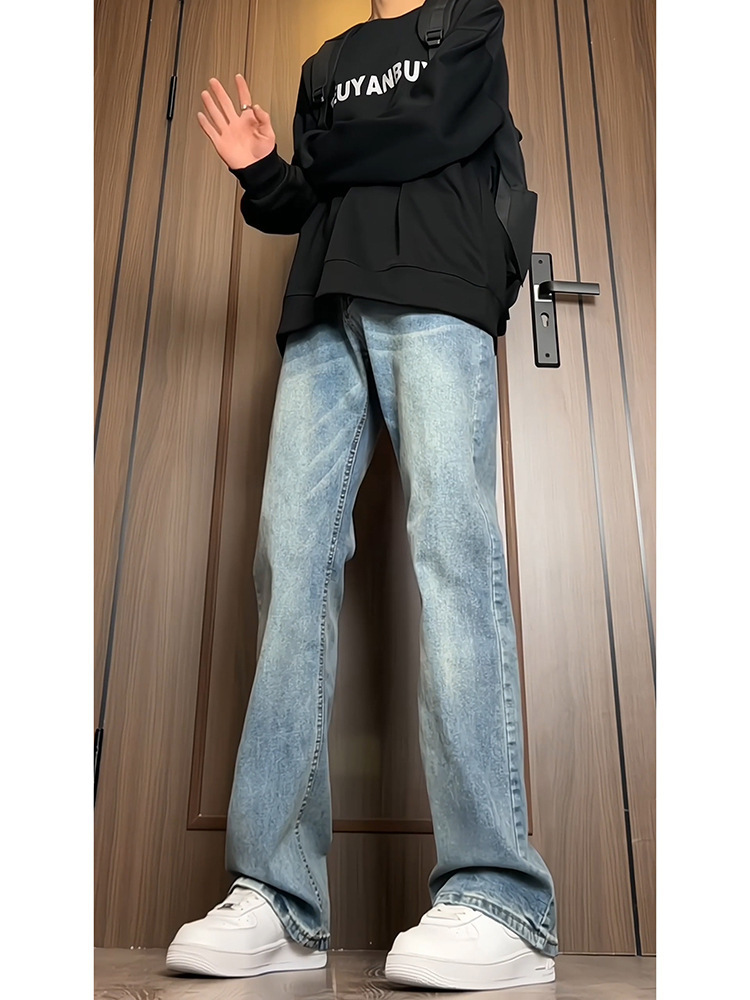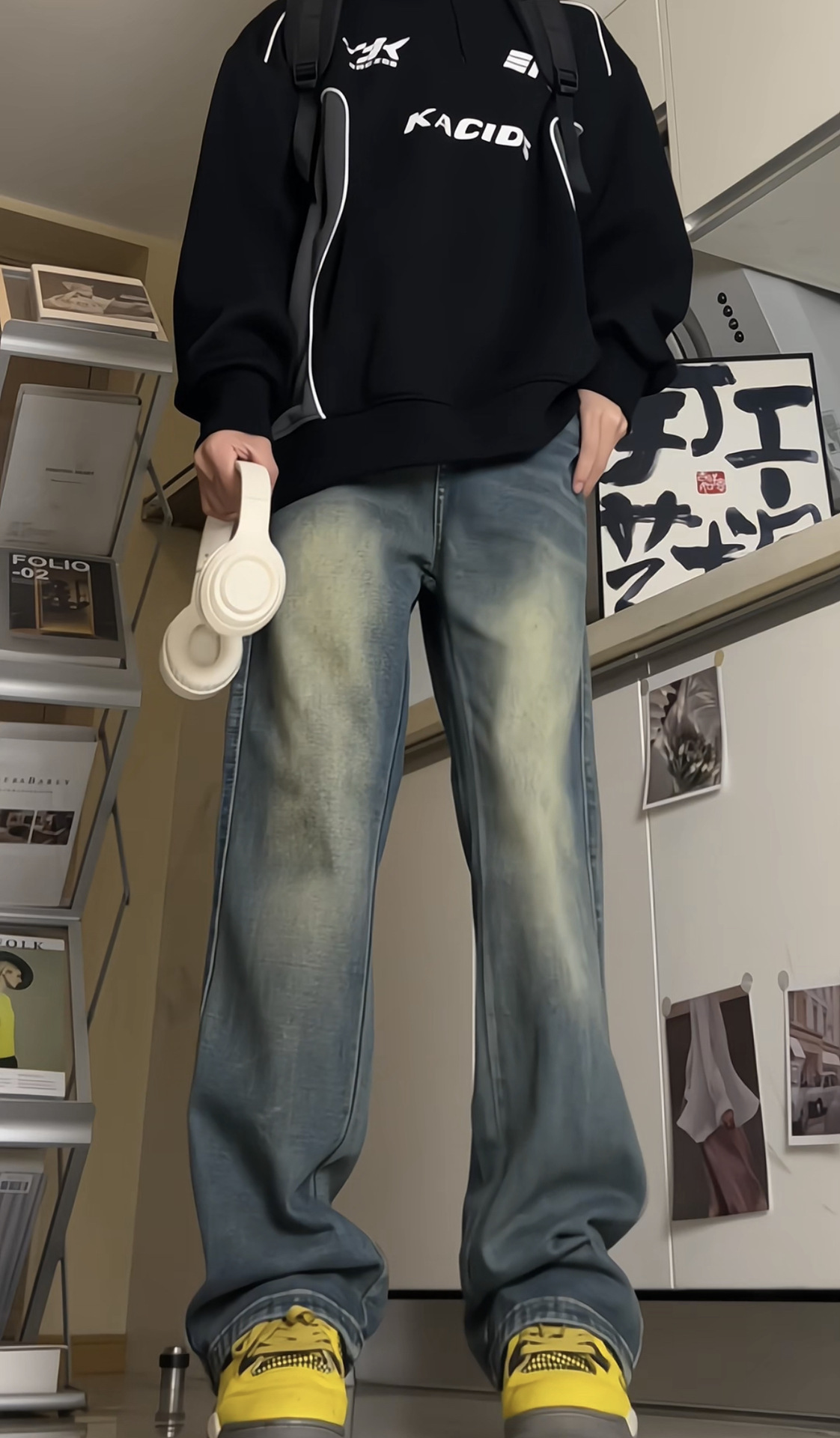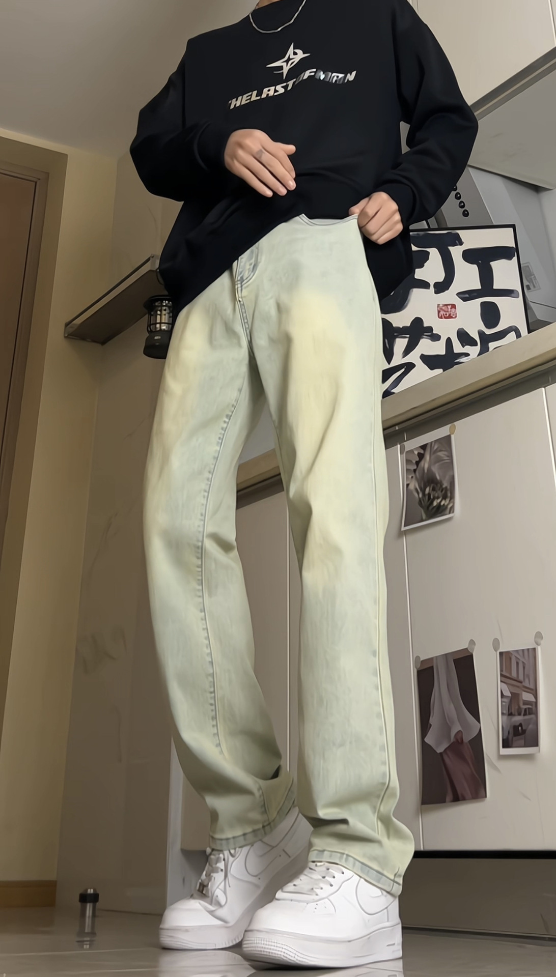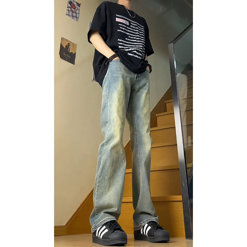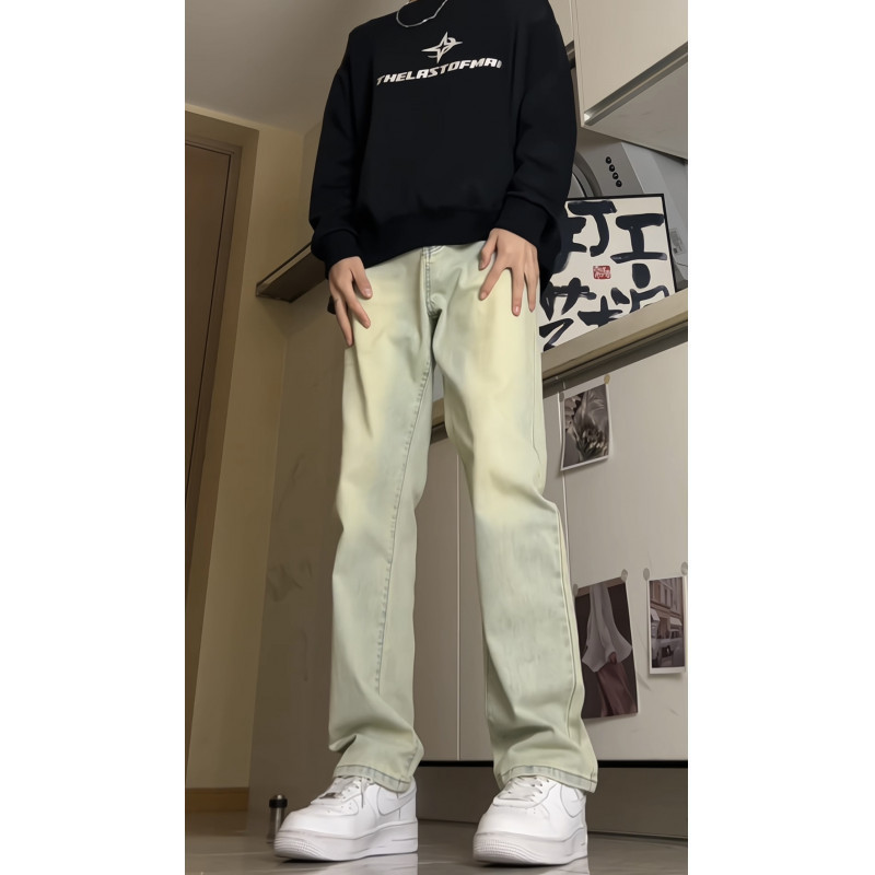 패셔너블한 옐로우 머드 컬러 청바지 남성용 봄, 가을, 겨울 2025 새로운 미국 트렌디 브랜드 하이 스트리트 슬림 스트레이트 마이크로 플레어 팬츠스토어 가기