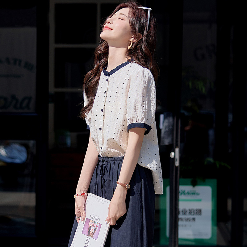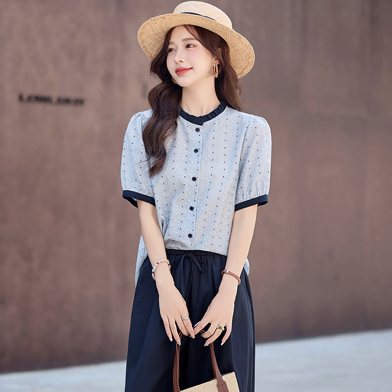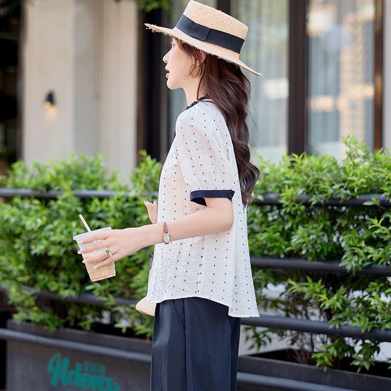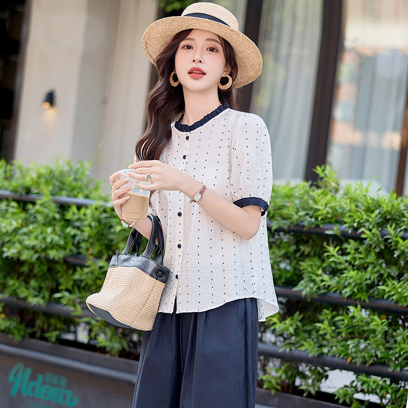 여성을위한 프랑스 복고풍 폴카 도트 반팔 셔츠 여름 2025 새로운 경량 라운드 넥 탑 통근 셔츠스토어 가기
