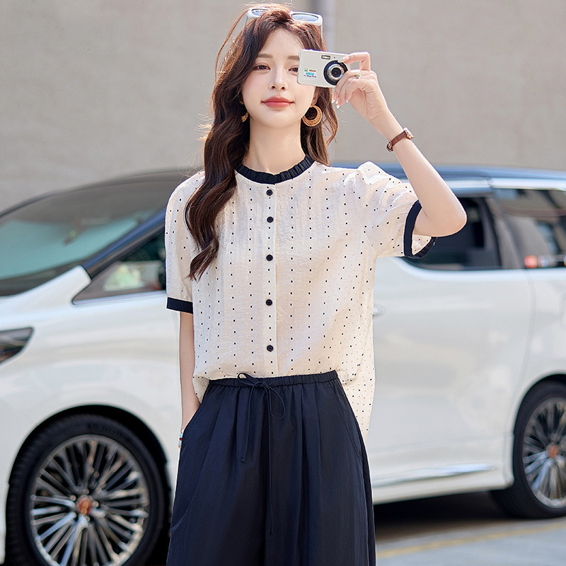 여성을위한 프랑스 복고풍 폴카 도트 반팔 셔츠 여름 2025 새로운 경량 라운드 넥 탑 통근 셔츠