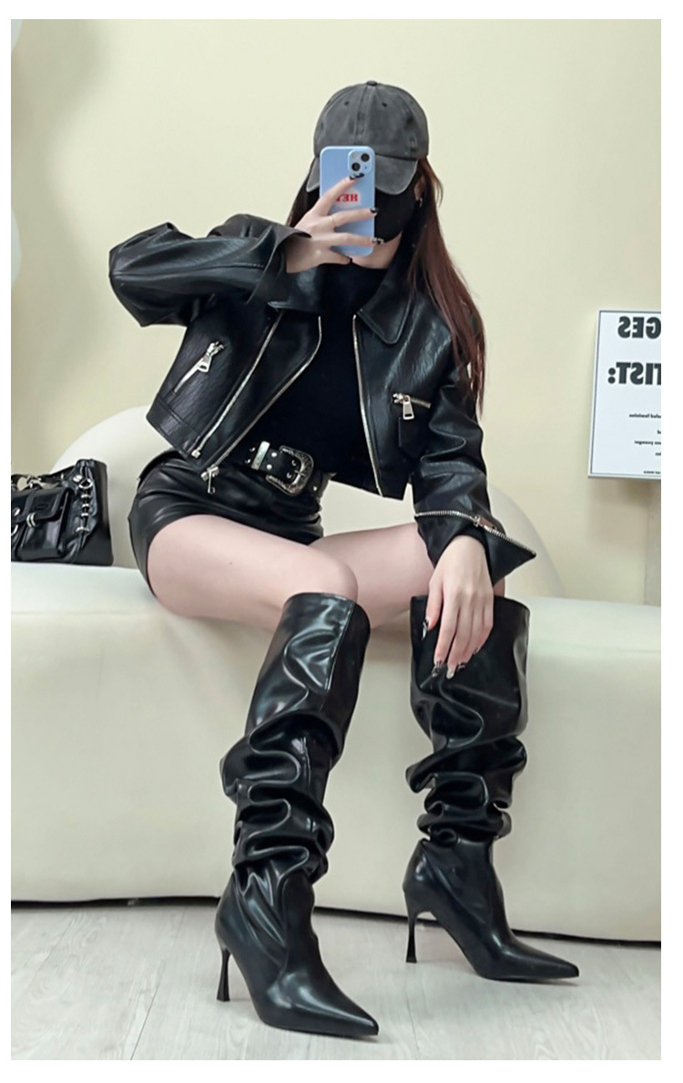 스팟상품! 여성용 대형 튜브 주름 파일 부츠 포인티드 토 부츠 2024 봄, 가을 나이트 부츠 웨스턴 카우보이스토어 가기