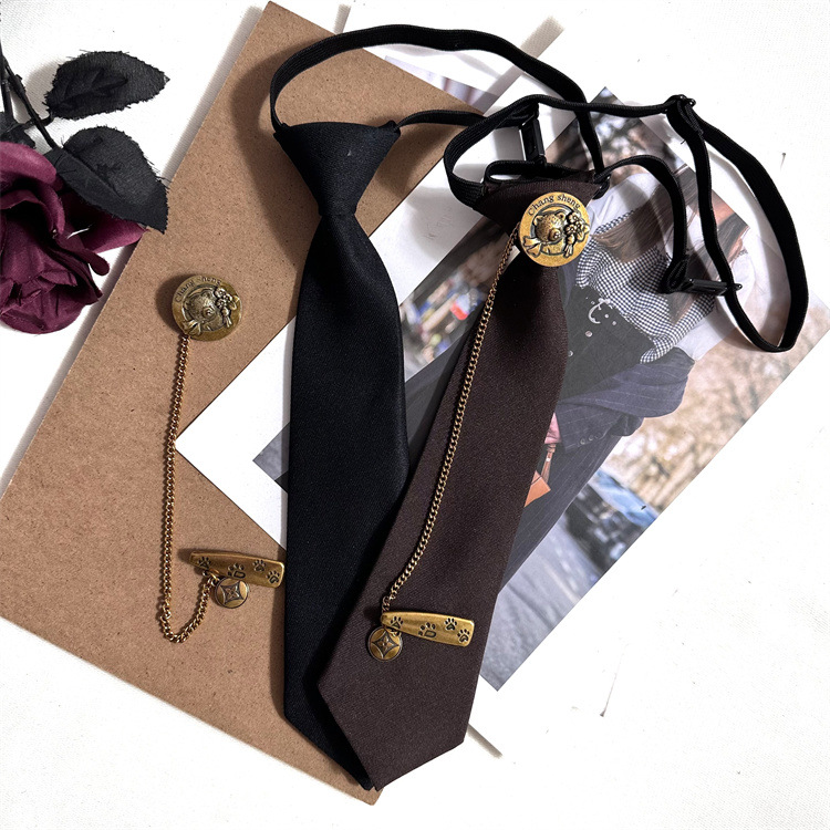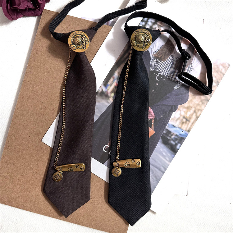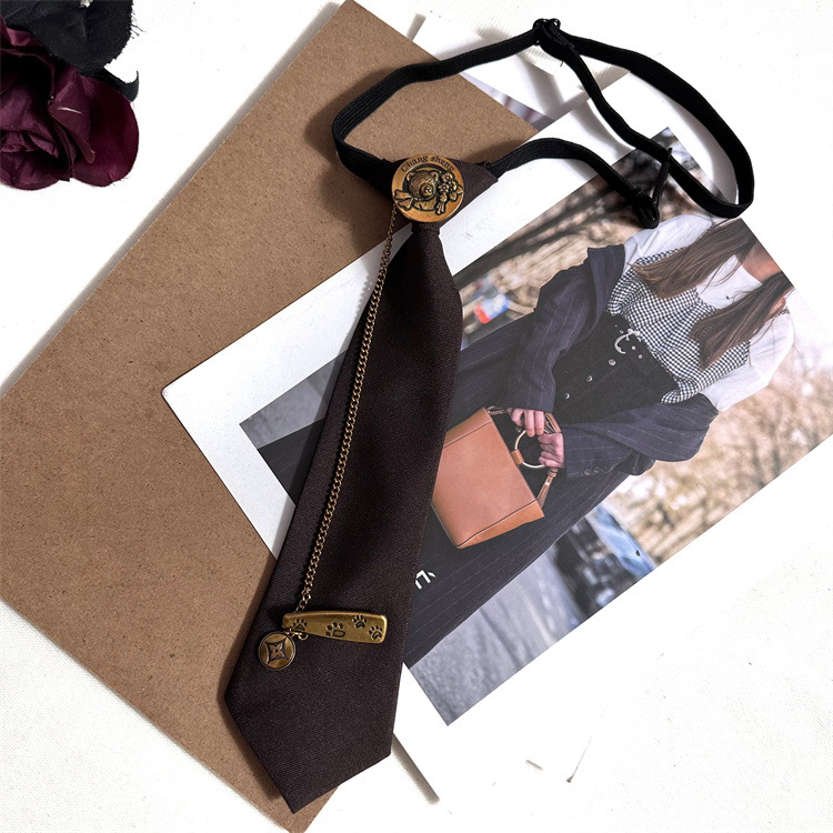 레트로 하이엔드 브라운 넥타이, 브론즈 메탈 체인, 베어 라운드 헤드 핀 장식, 다용도 넥타이 없음스토어 가기