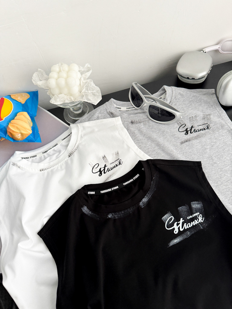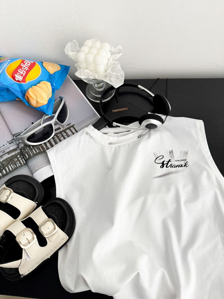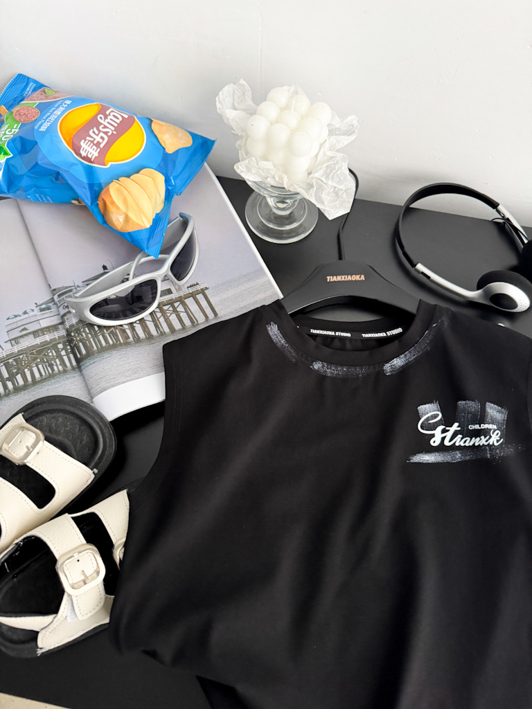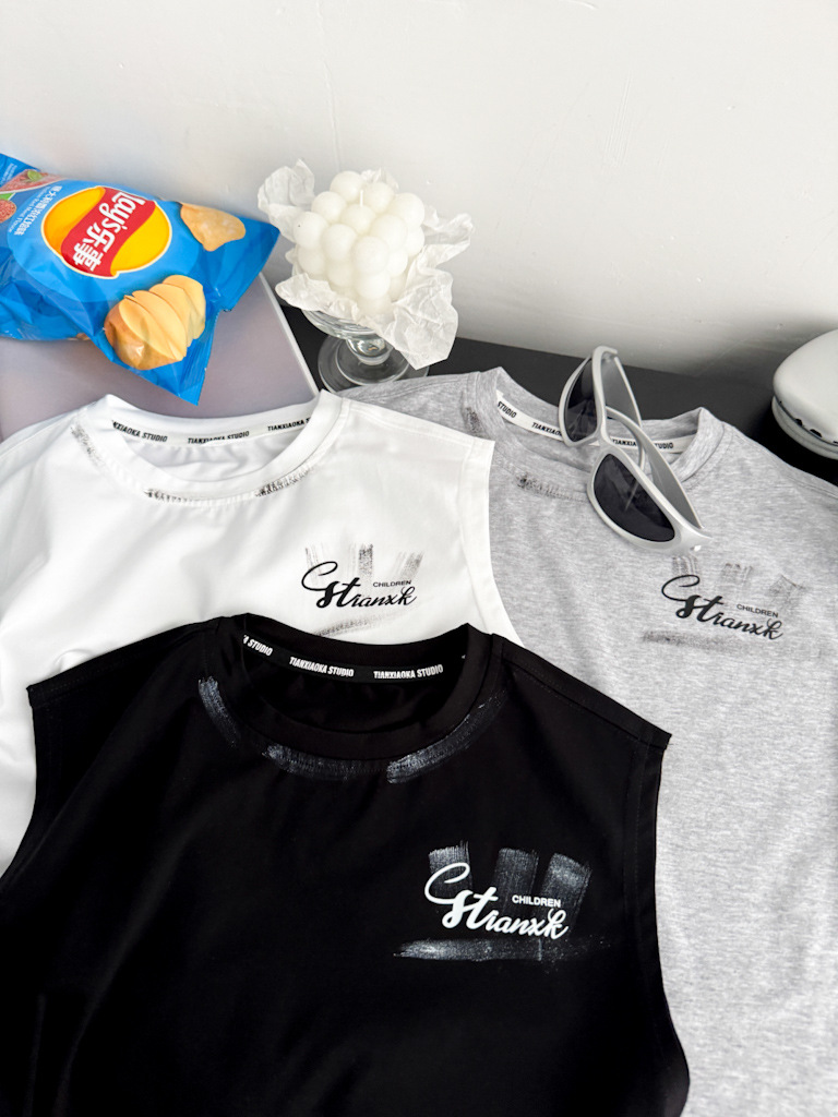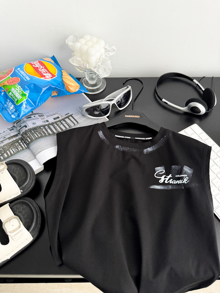 어린이 한국 스타일 캐주얼 면 조끼 2025 여름 신작 소년 느슨한 라운드 넥 민소매 티셔츠 페인트 트렌디하고 멋집니다스토어 가기