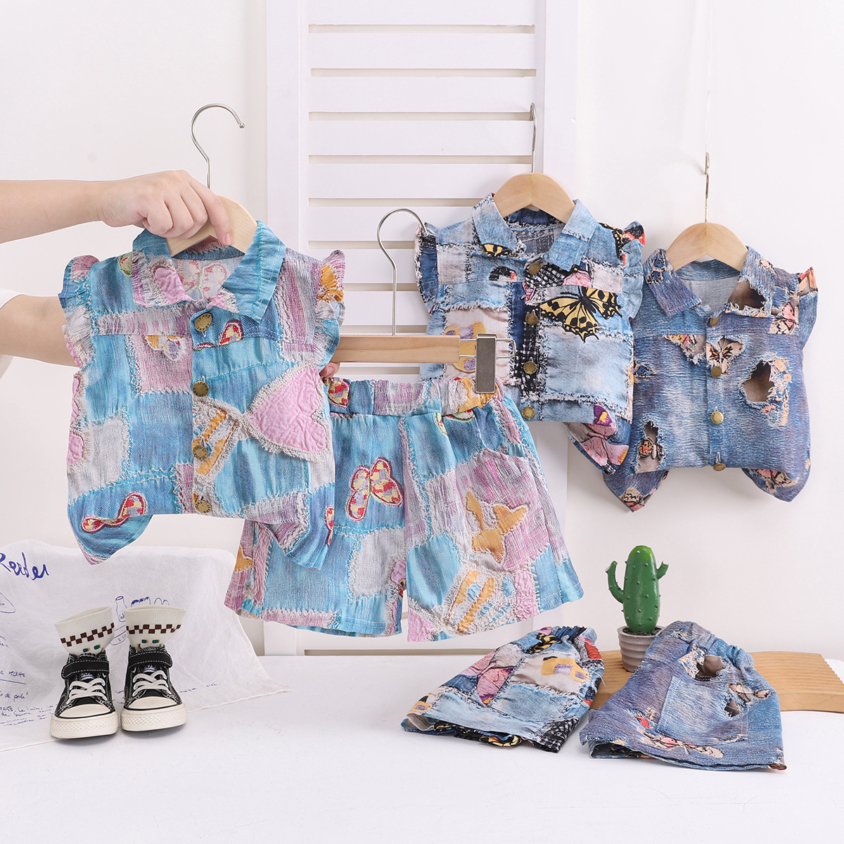국경 간 아동 의류 소녀 여름 해변 스타일 반팔 양복 대외 무역 어린이 모조 데님 플라이 슬리브 셔츠 투피스 세트스토어 가기