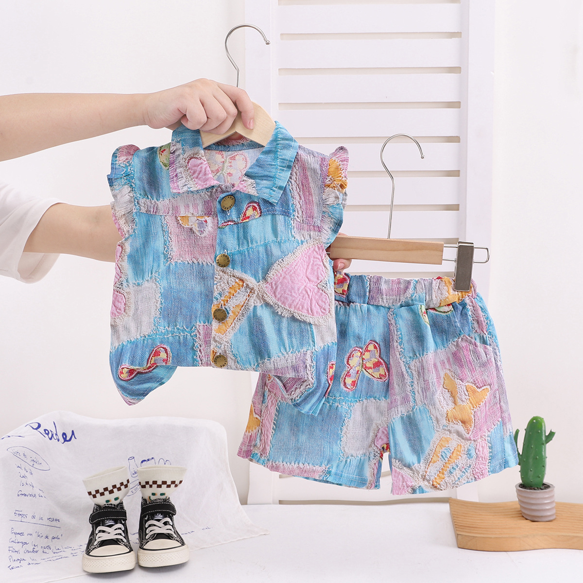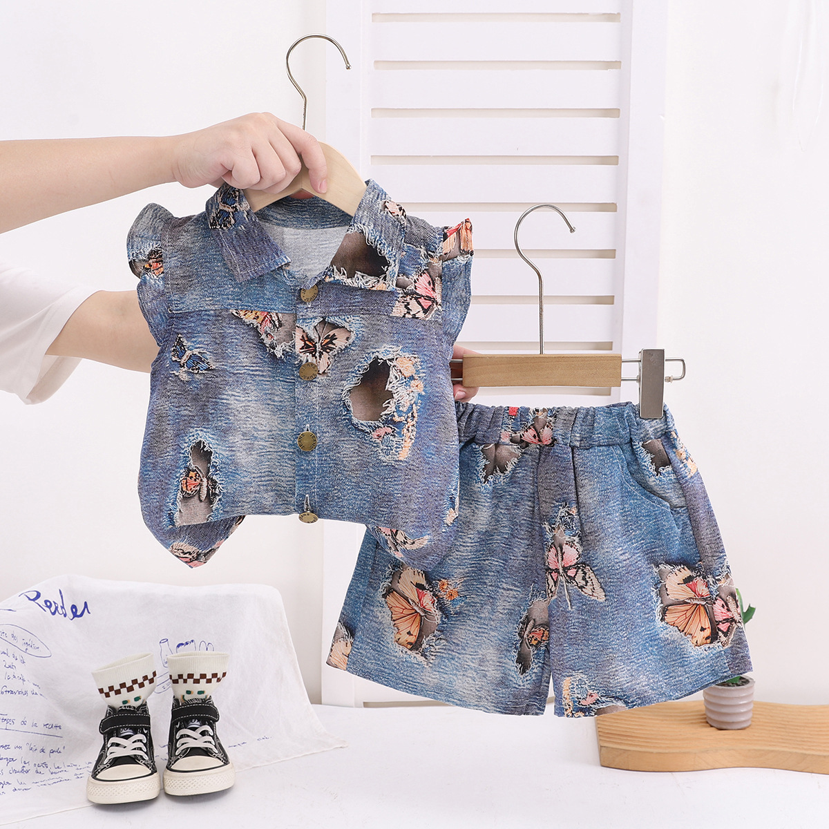 국경 간 아동 의류 소녀 여름 해변 스타일 반팔 양복 대외 무역 어린이 모조 데님 플라이 슬리브 셔츠 투피스 세트