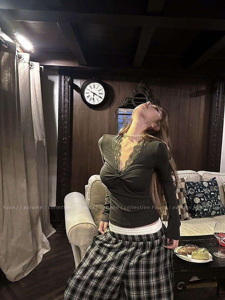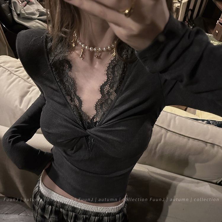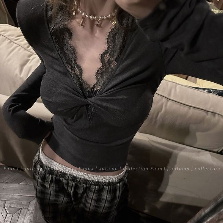봄과 가을 새로운 순수한 욕망 스타일 뜨거운 소녀 레이스 짧은 긴팔 티셔츠 여성 슬림 피트 디자인 바닥 셔츠 탑