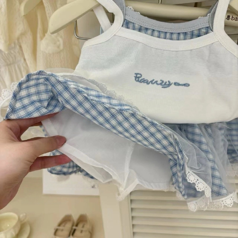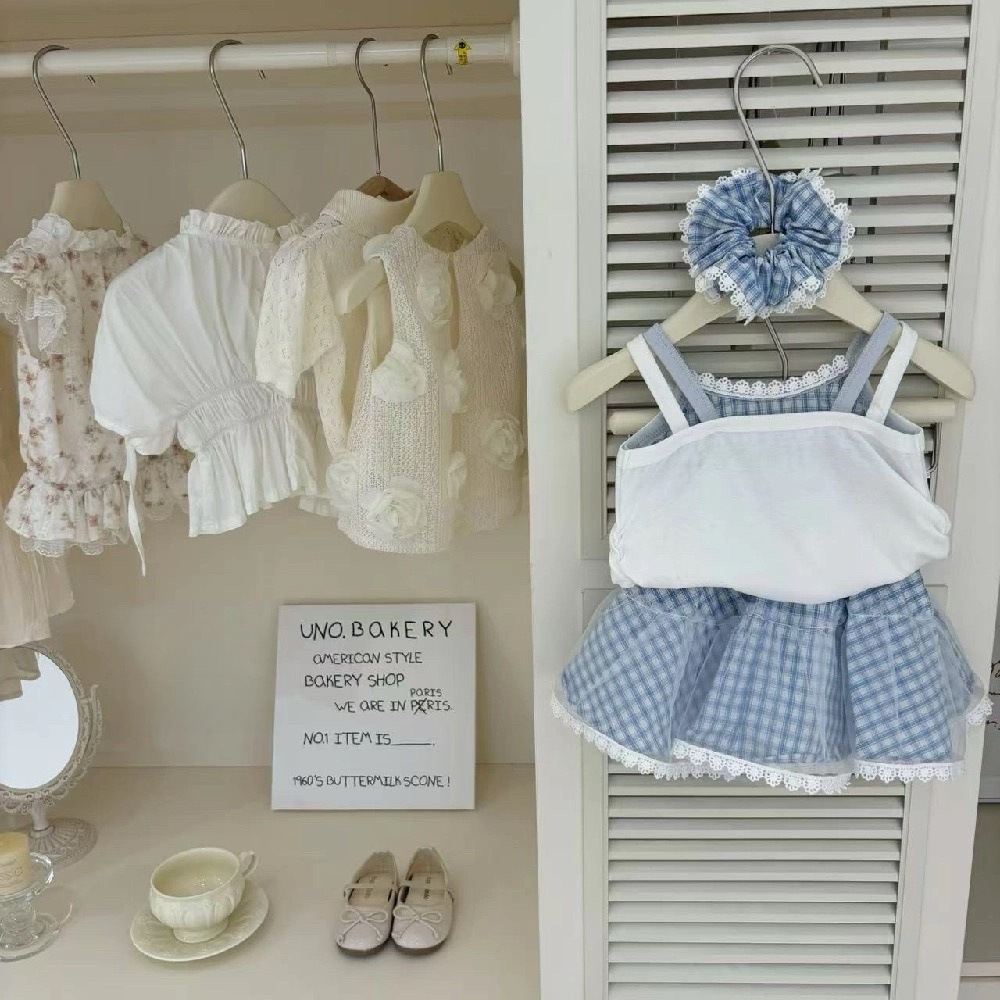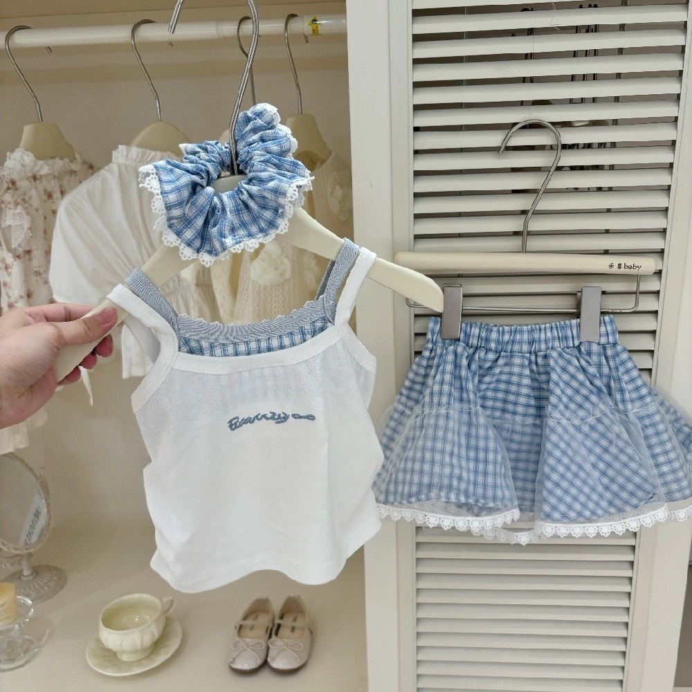 여아 한국 스타일 달콤한 여름복 2026 신상 아동 자수 민소매 탑과 레이스 체크무늬 스커트 투피스 세트