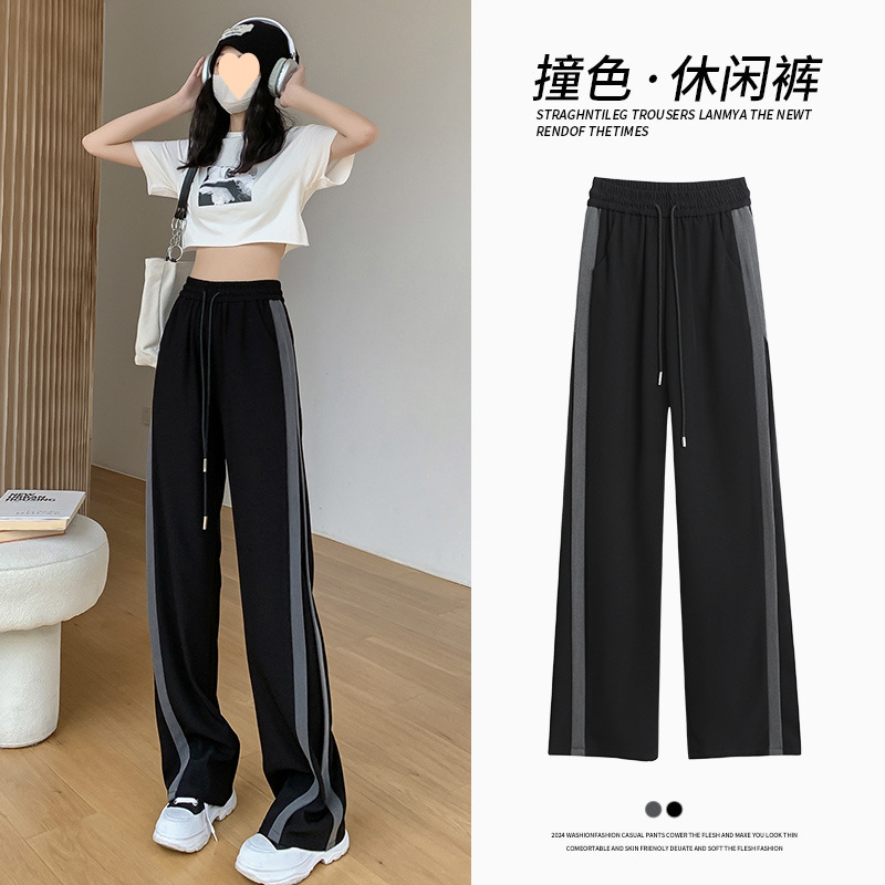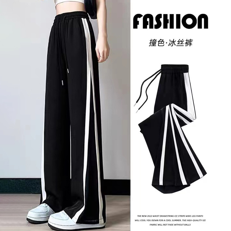 여성을위한 얼음 실크 캐주얼 바지 여름 얇은 2025 새로운 스트레이트 루즈 스포츠 블랙 봄, 여름 하이 웨이스트 와이드 레그 팬츠