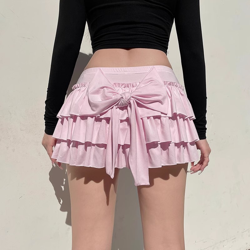 달콤하고 매콤한 핑크색 뒷 엉덩이 리본 케이크 스커트 여성 연령 감소 다목적 로우 웨이스트 섹시한 a 라인 스커트