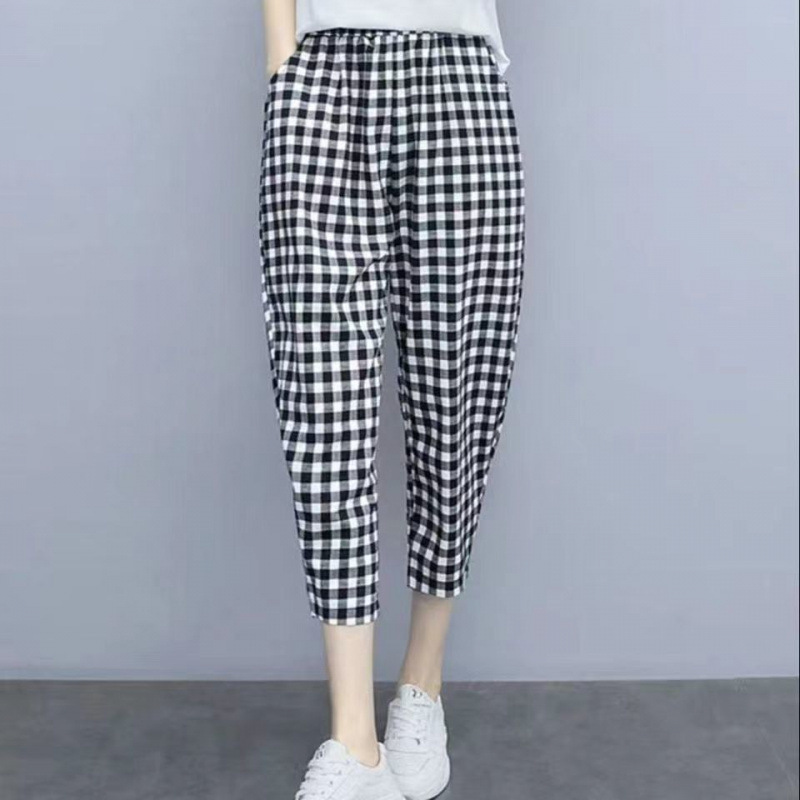 여성용 면 체크 무늬 바지 2025 여름 새로운 한국 스타일 슬림핏 하렘 탄성 레깅스 여성용 크롭 팬츠스토어 가기