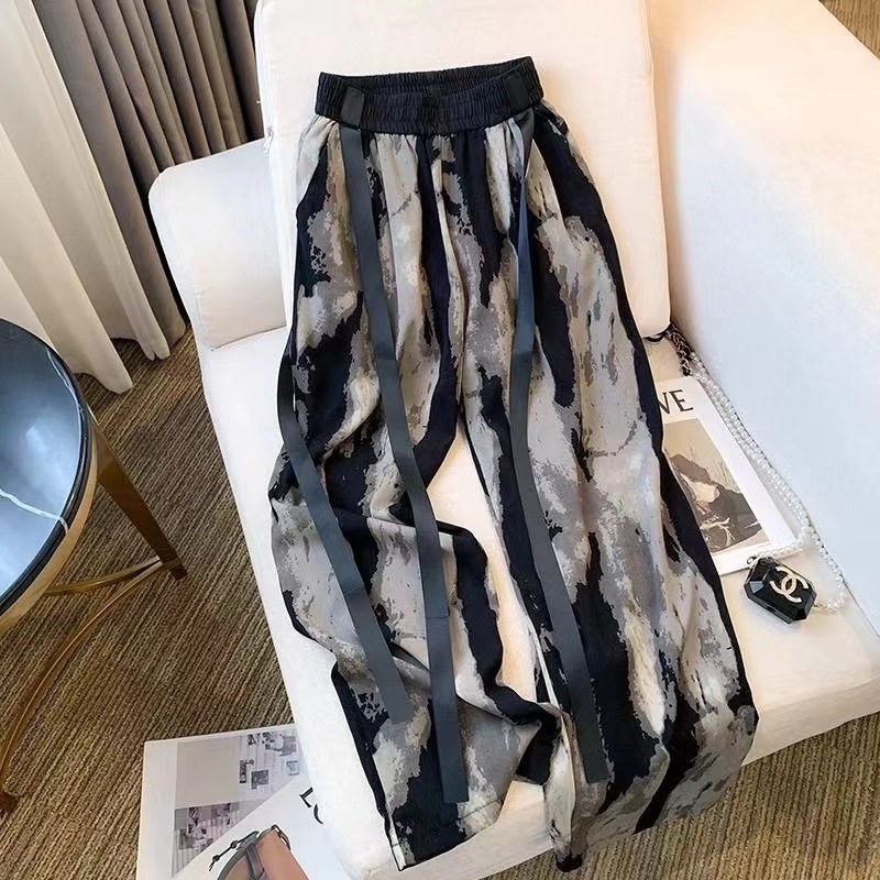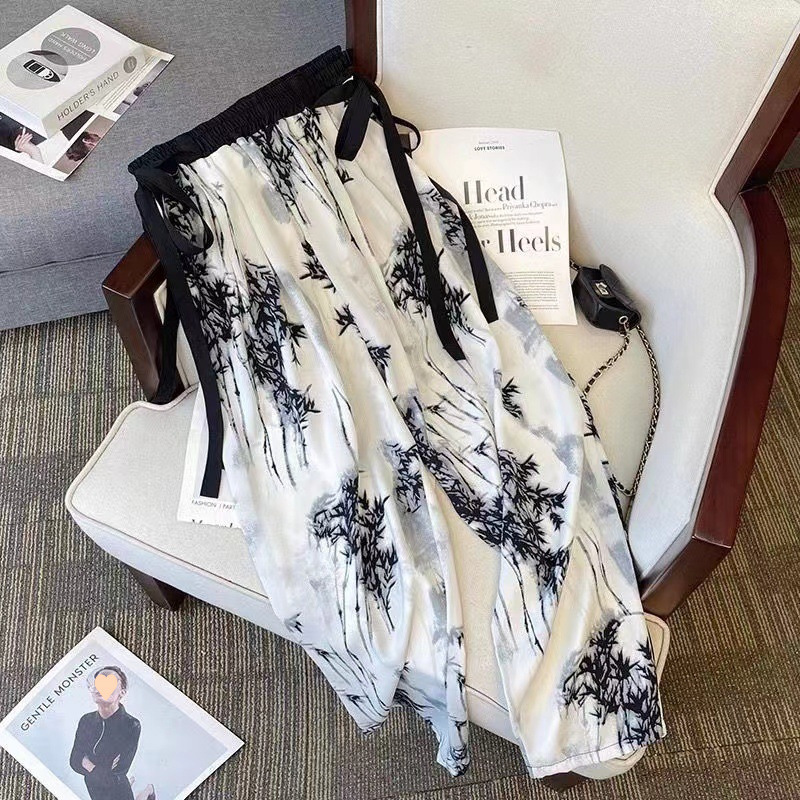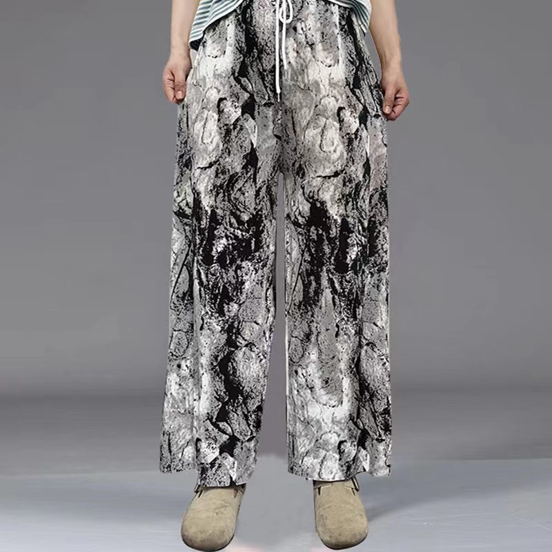 여성을위한 새로운 중국 스타일 수묵화 중국 스타일 얼음 실크 와이드 레그 팬츠 2025 여름 얇은 타이 염색 하이 웨이스트 드레이프 캐주얼 루즈