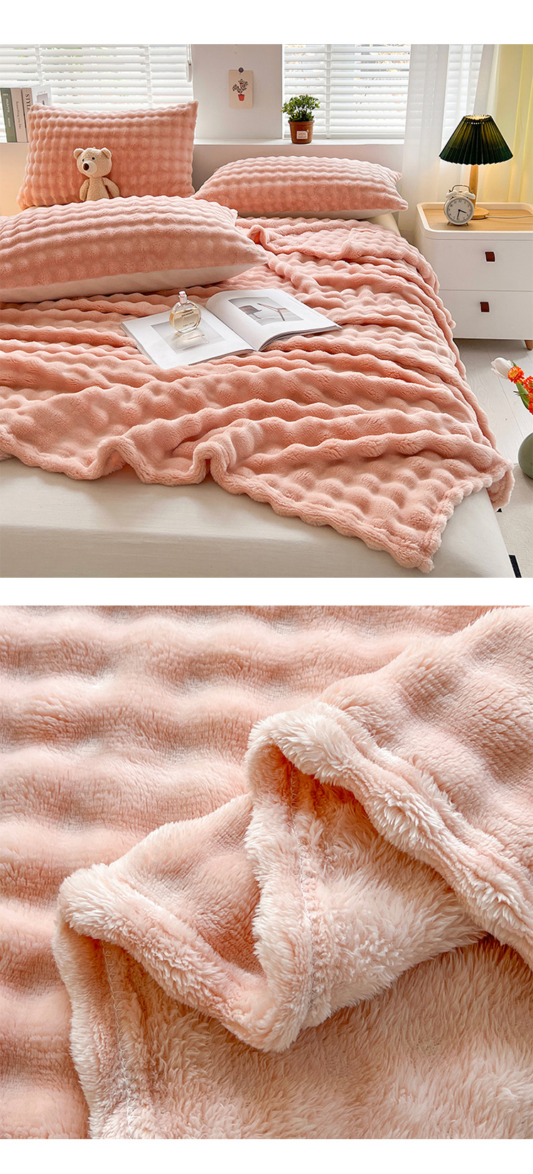 产品特点:吸湿透气,清爽舒适,手感柔软。可广泛适用于沙发盖毯,午睡毯,床毯
