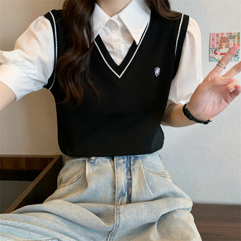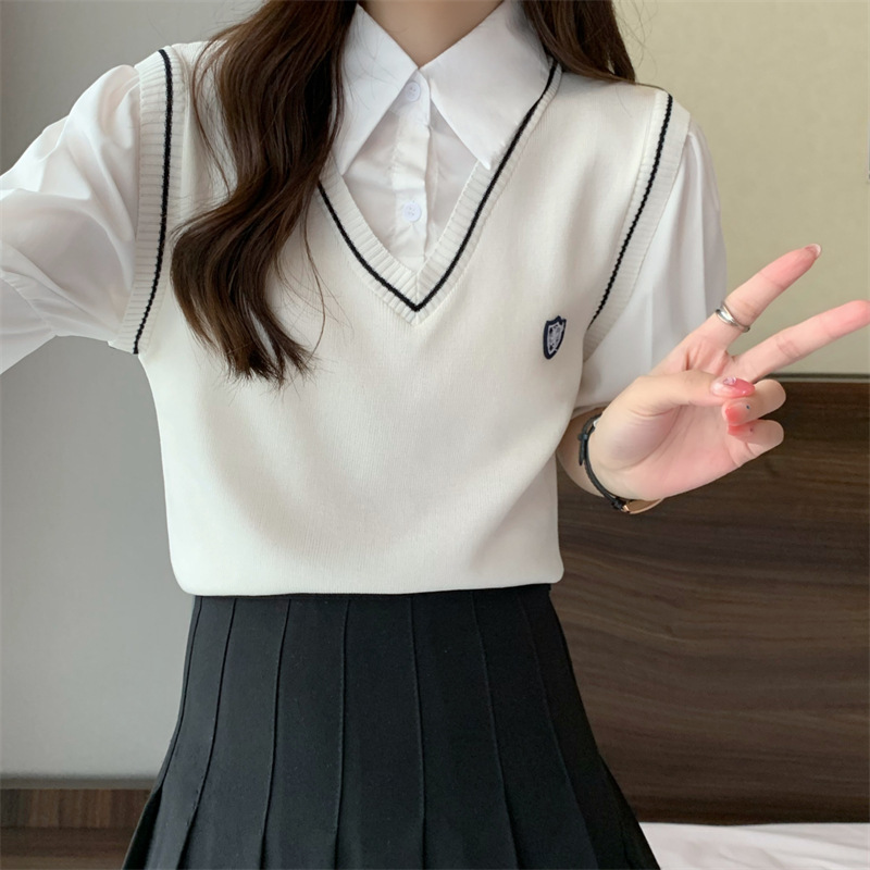 컬러 블록 대학 스타일 니트 조끼 가을 다목적 통근 캐주얼 스타일 루즈 트렌디 여성 니트