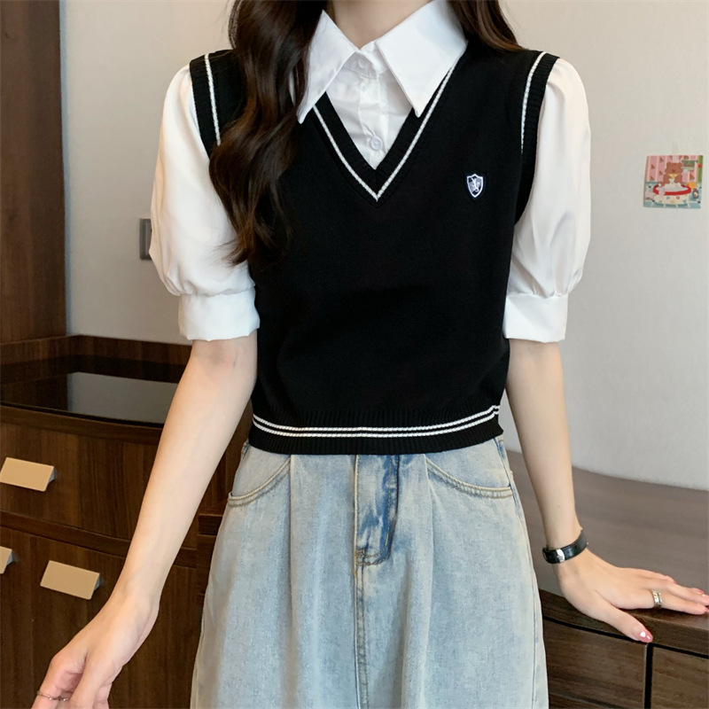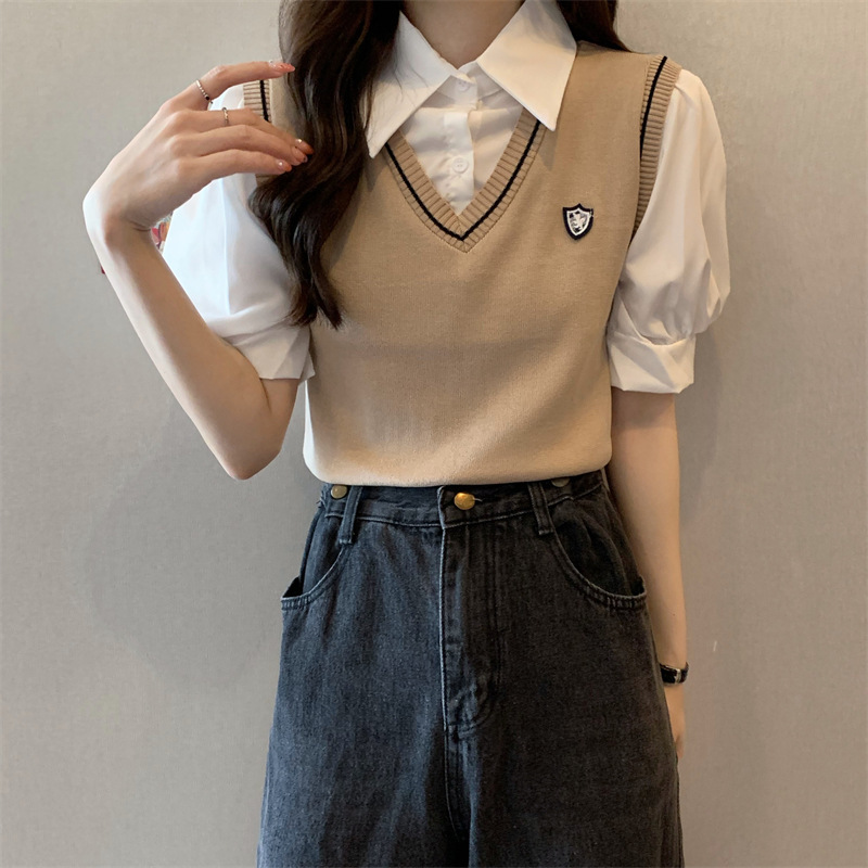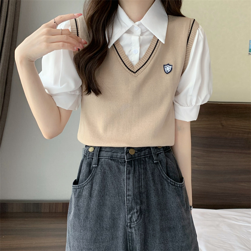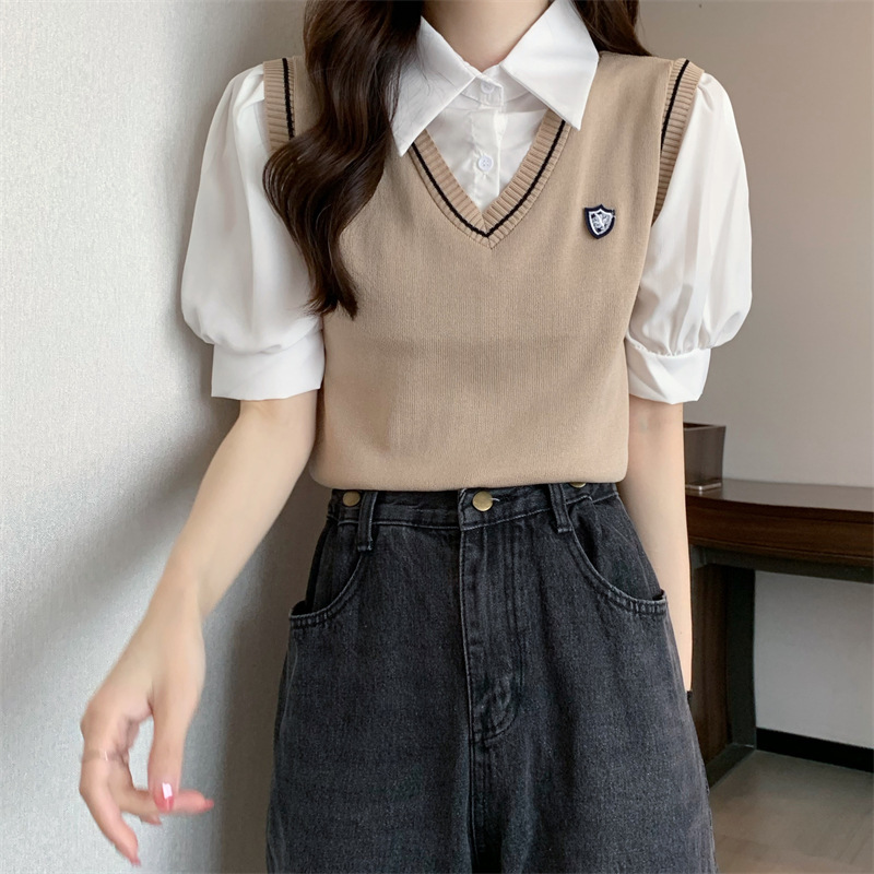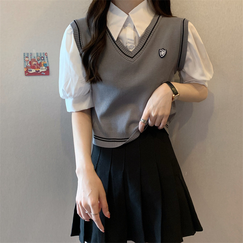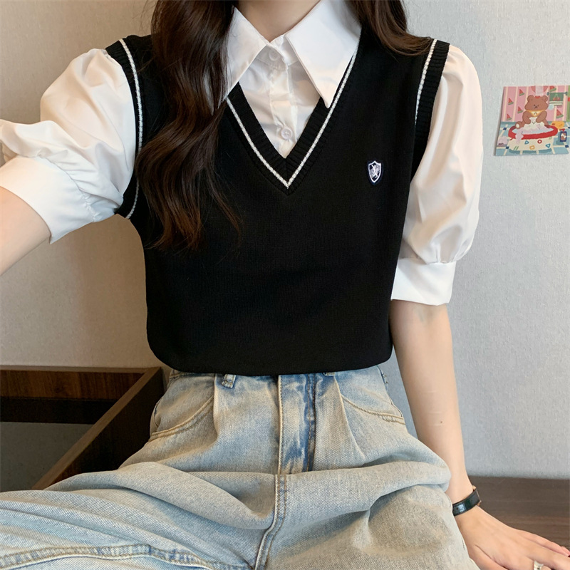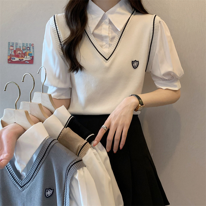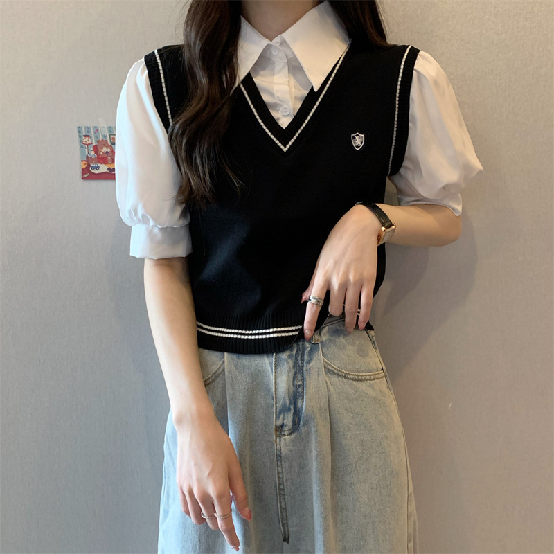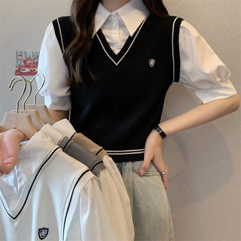 컬러 블록 대학 스타일 니트 조끼 가을 다목적 통근 캐주얼 스타일 루즈 트렌디 여성 니트스토어 가기