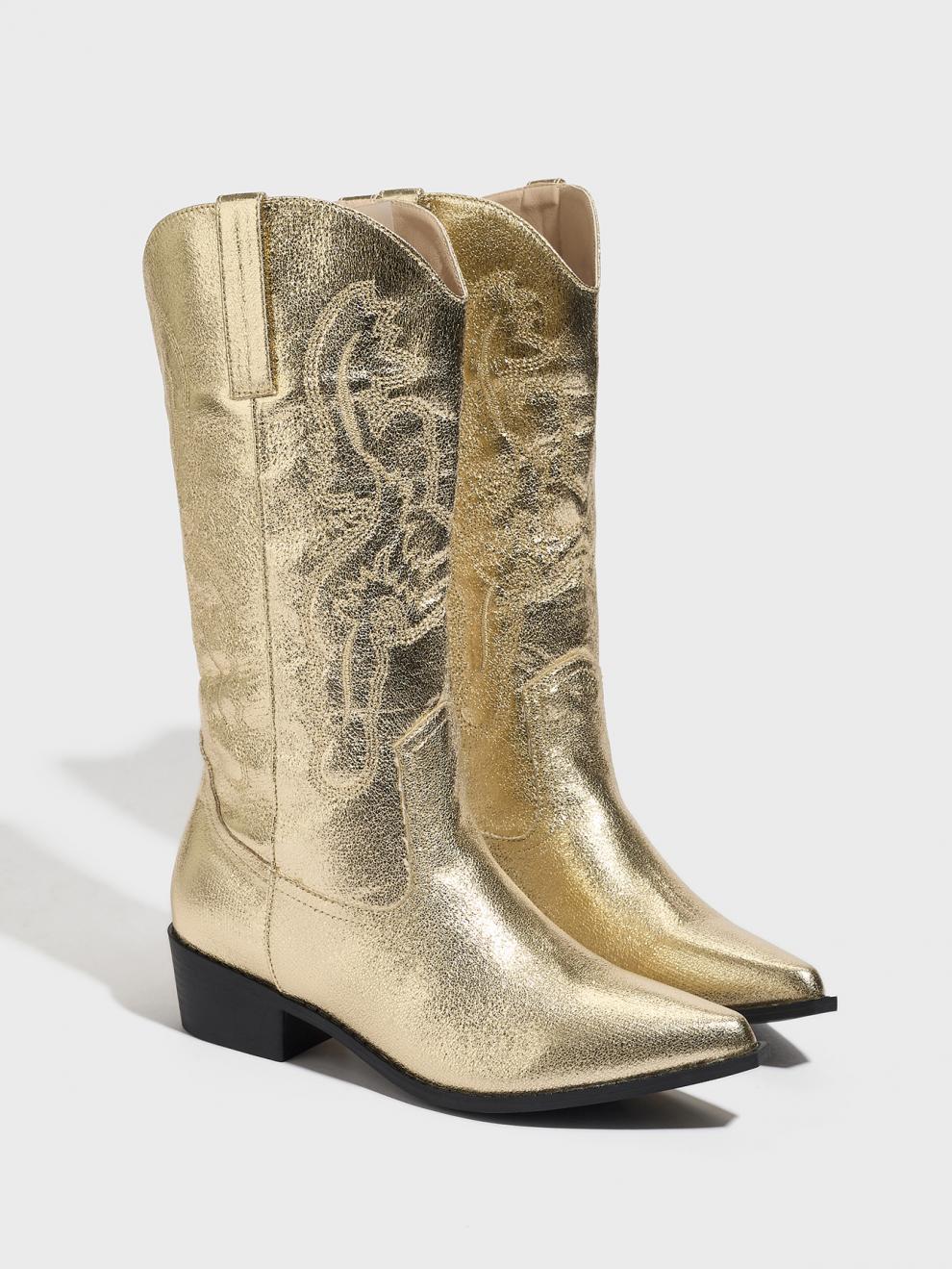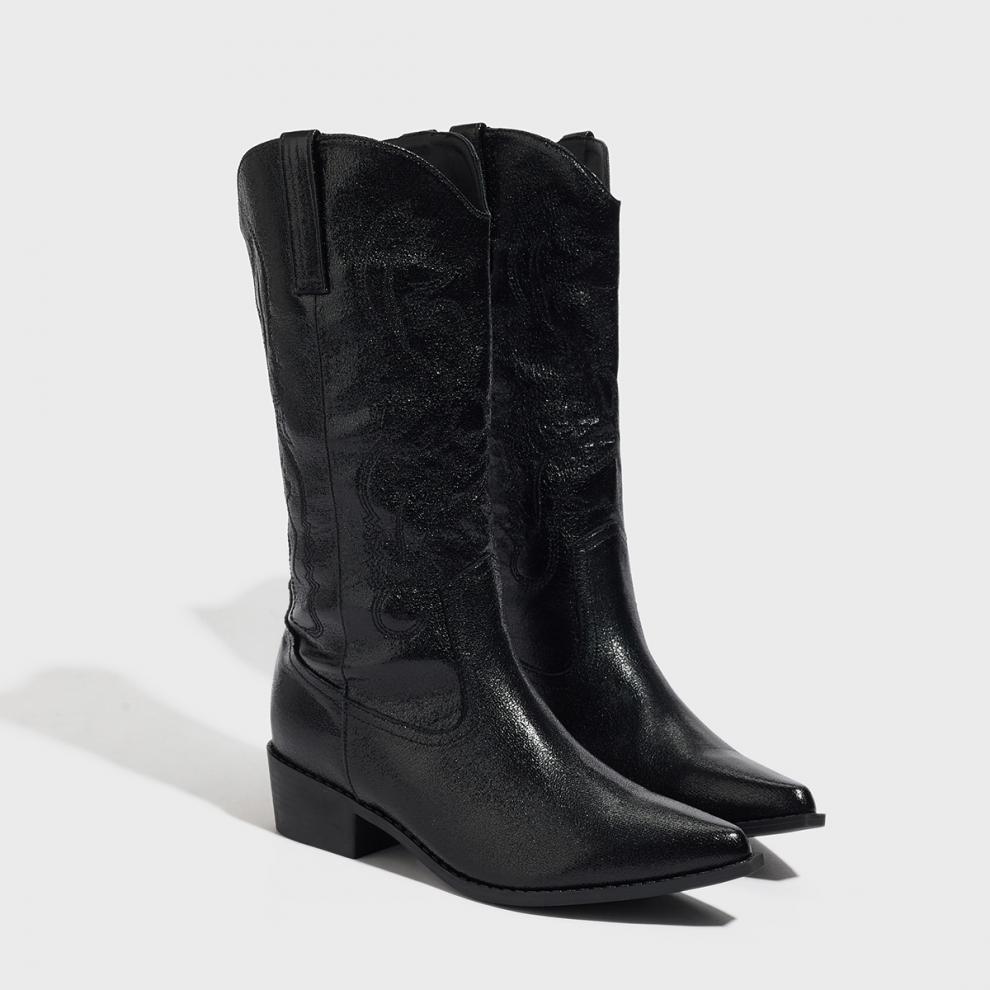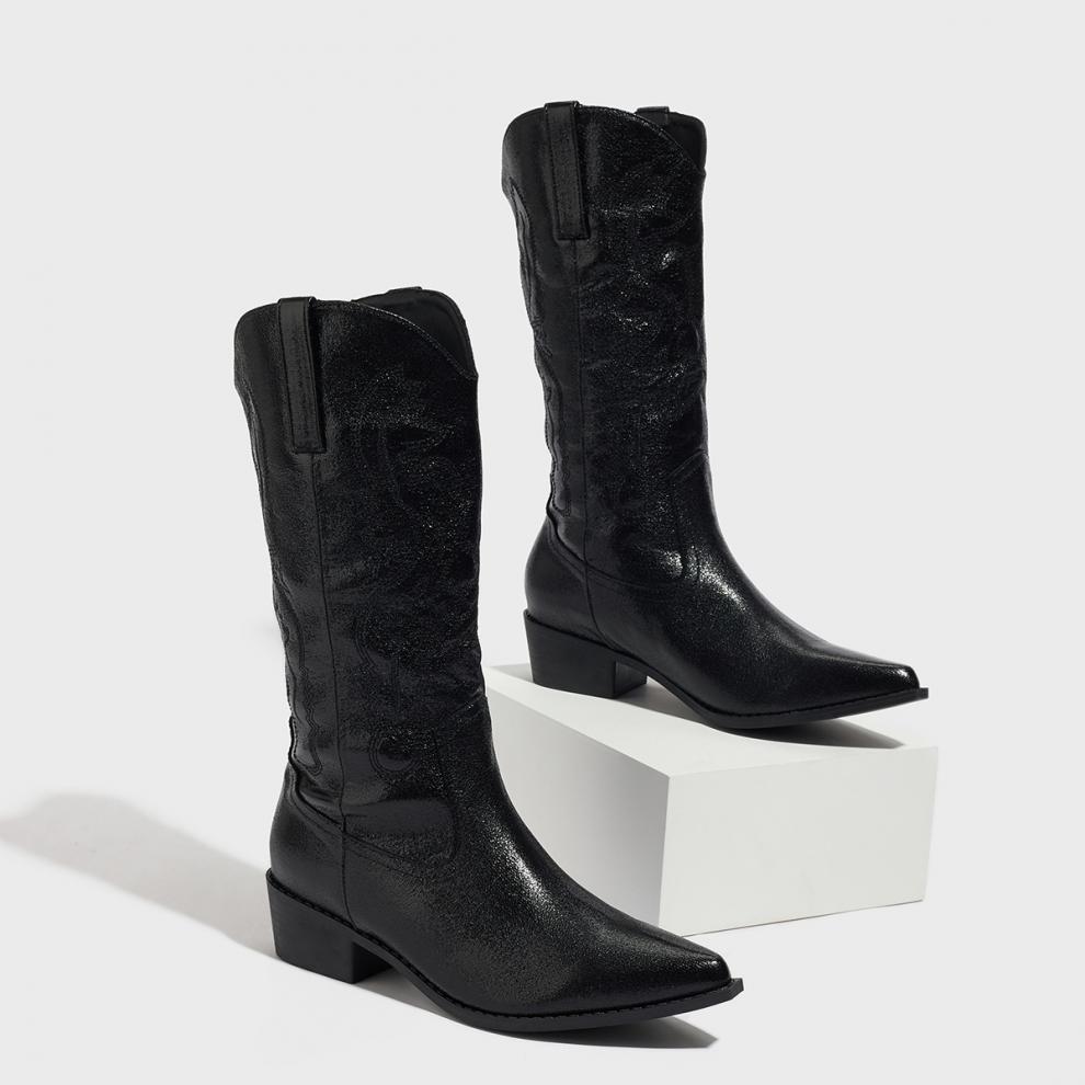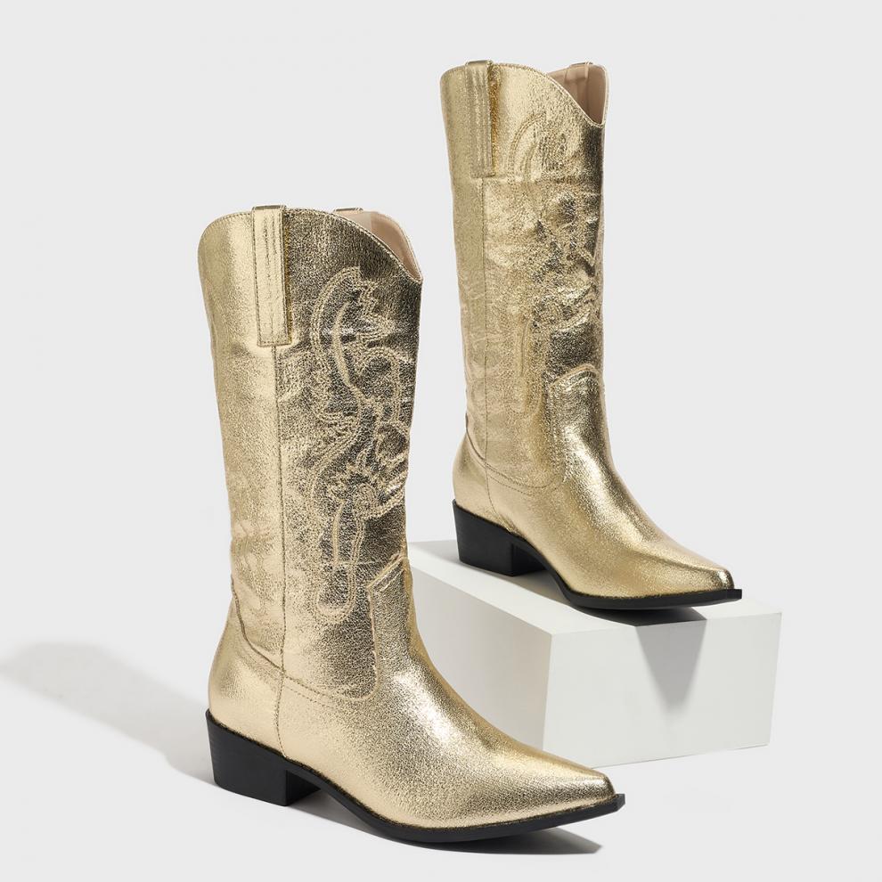 대외 무역 유럽 사이즈 대형 서양식 뾰족한 발가락 슬립온 두꺼운 굽 자수 중간 튜브 민족 스타일 복고풍 여성 신발스토어 가기