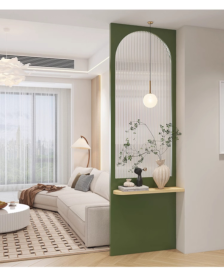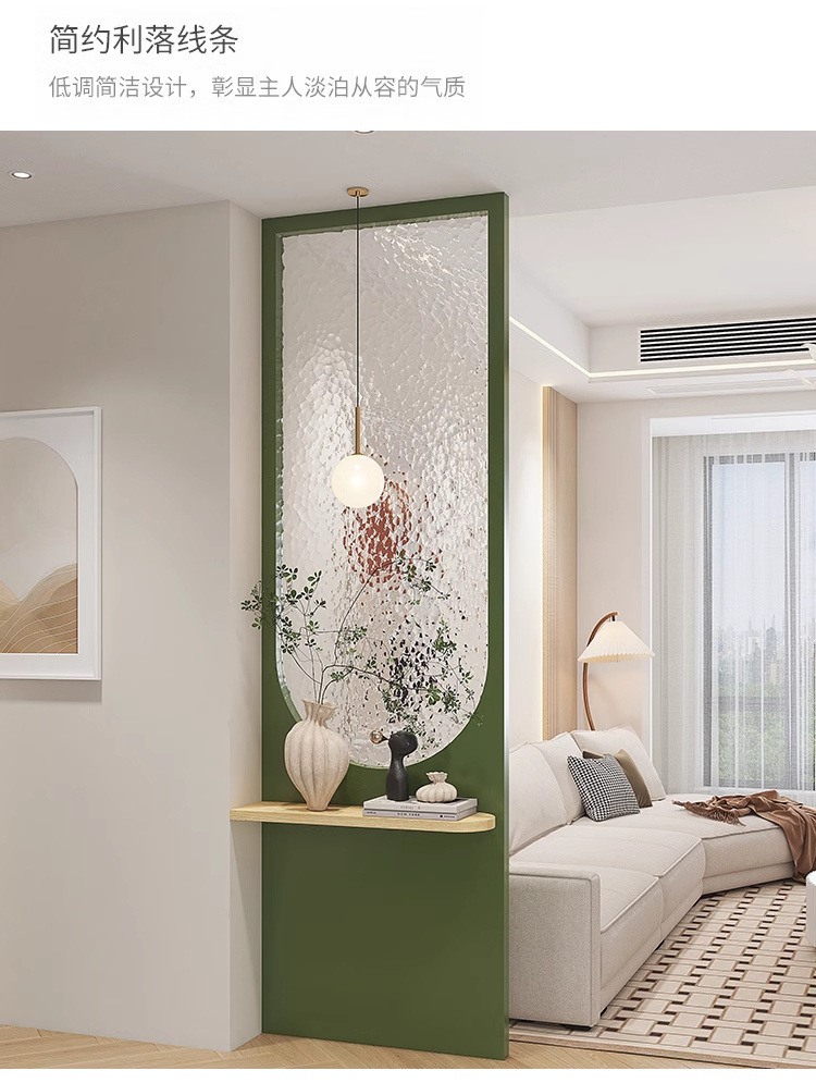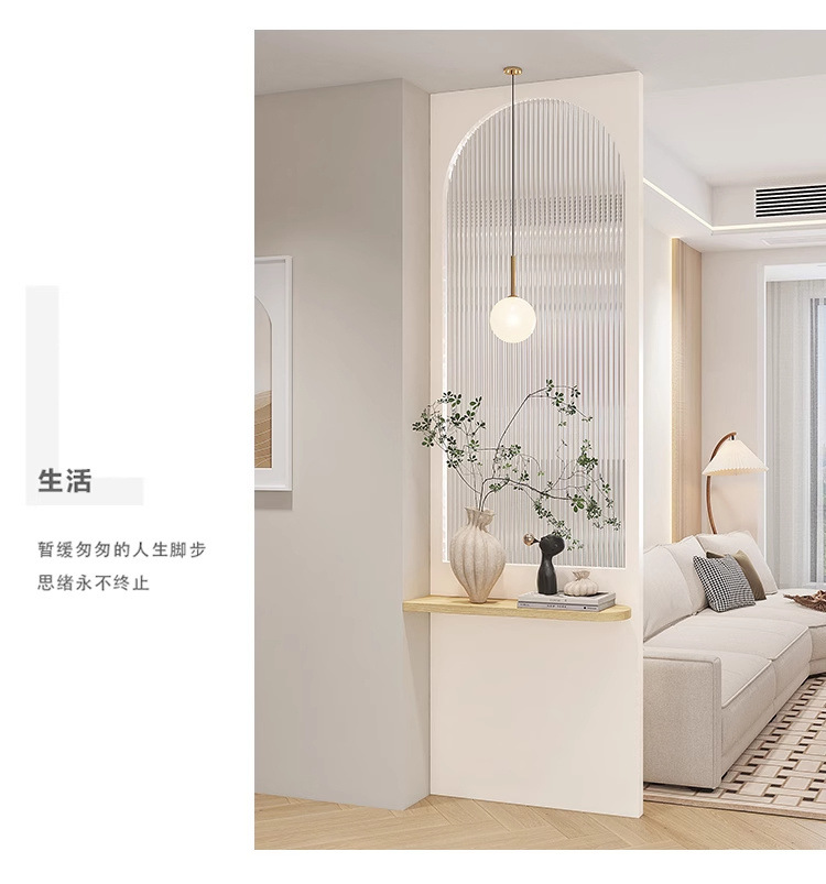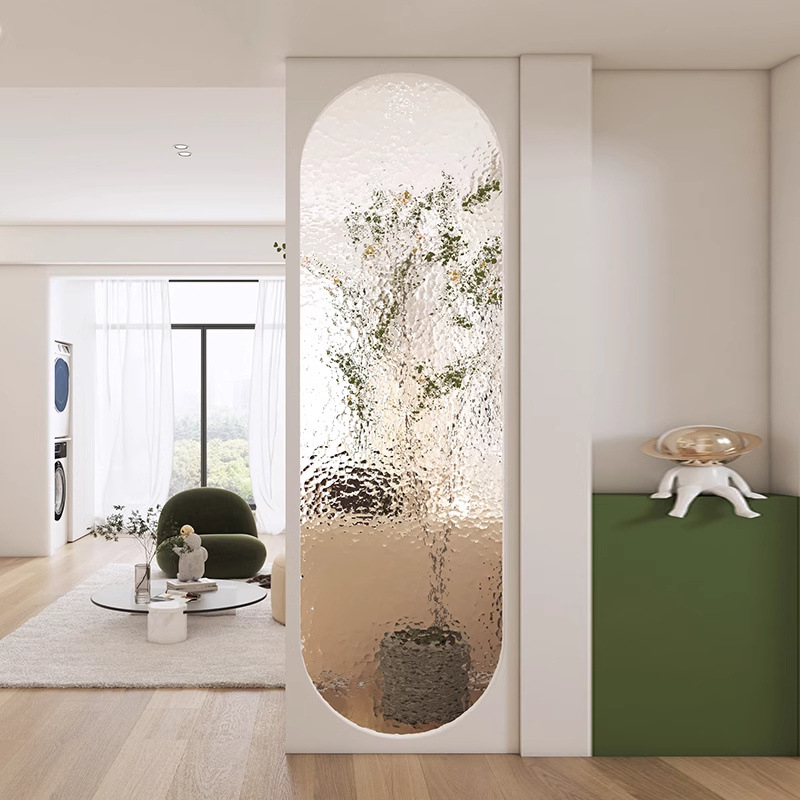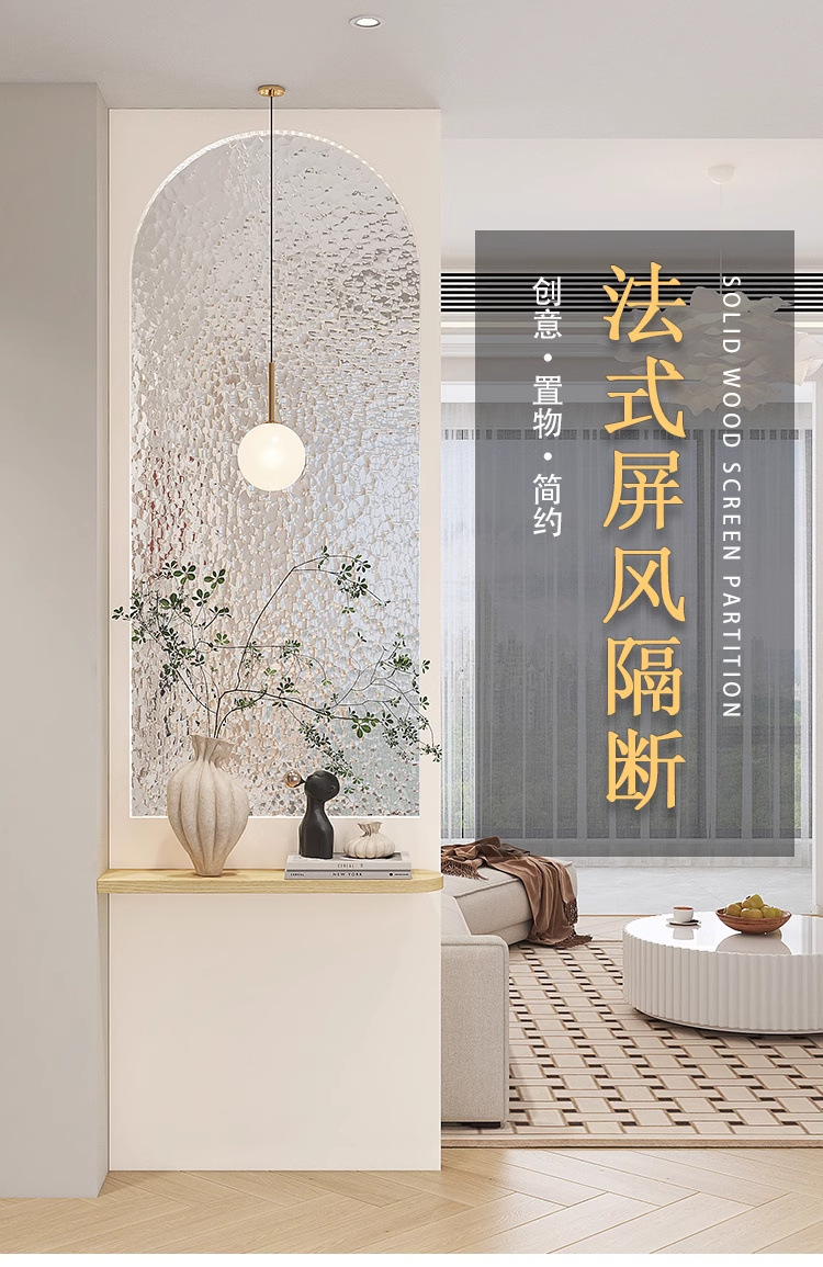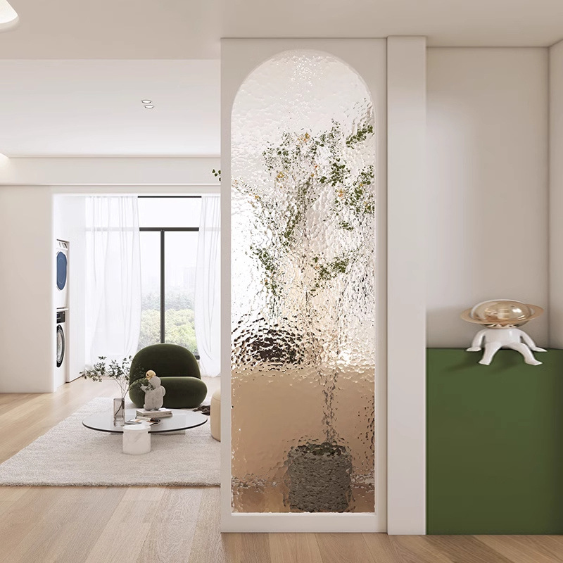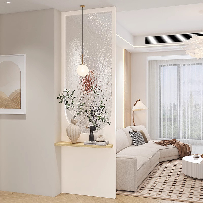 침실 세면대와 욕실을 가리키는 프렌치 크림 스타일의 거실 입구 파티션, 가벼운 고급스러운 물결무늬 유리 스크린