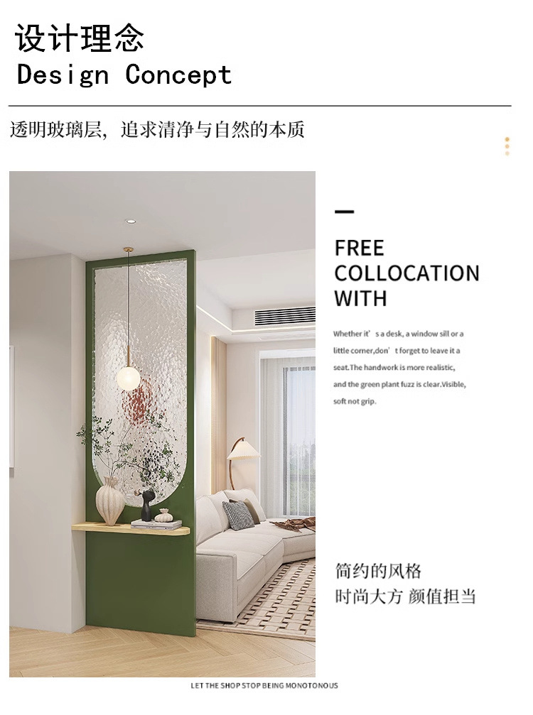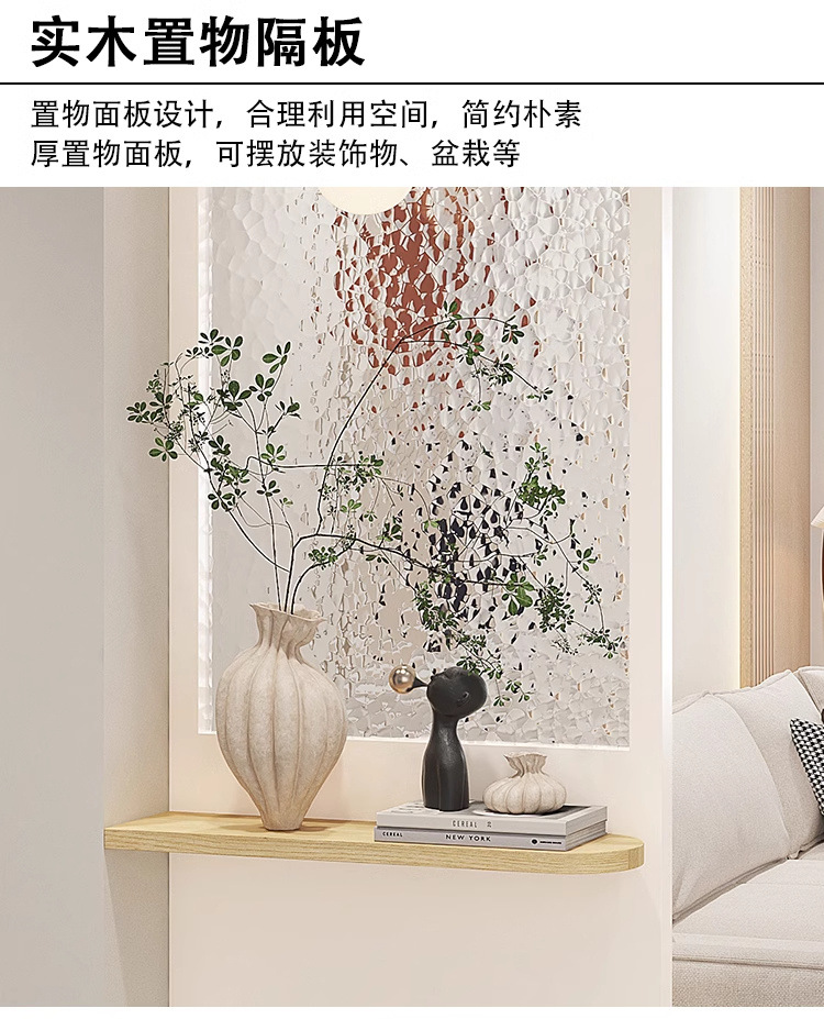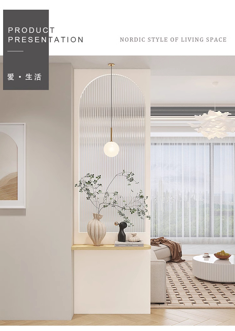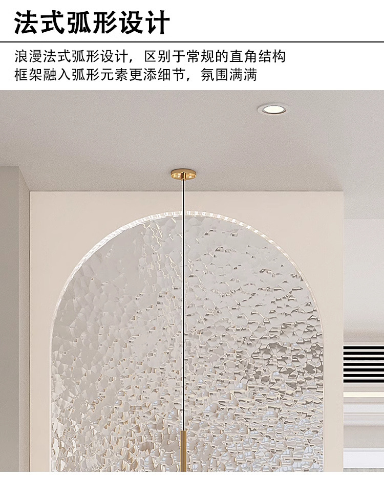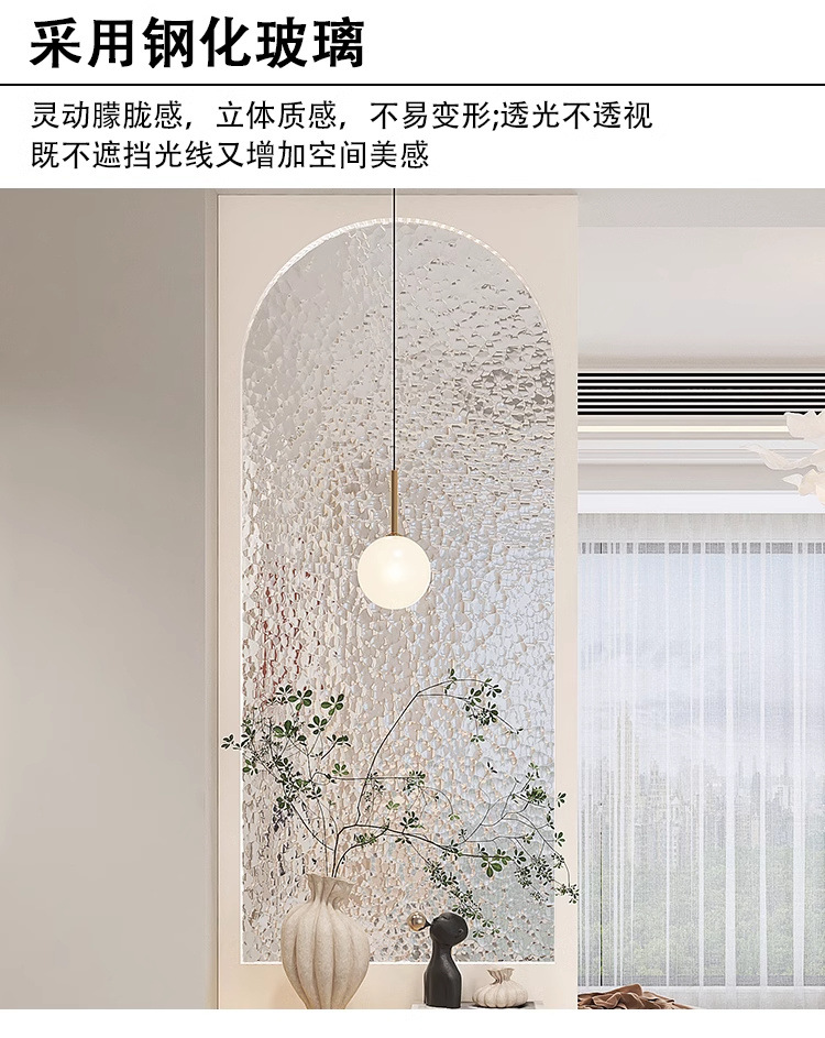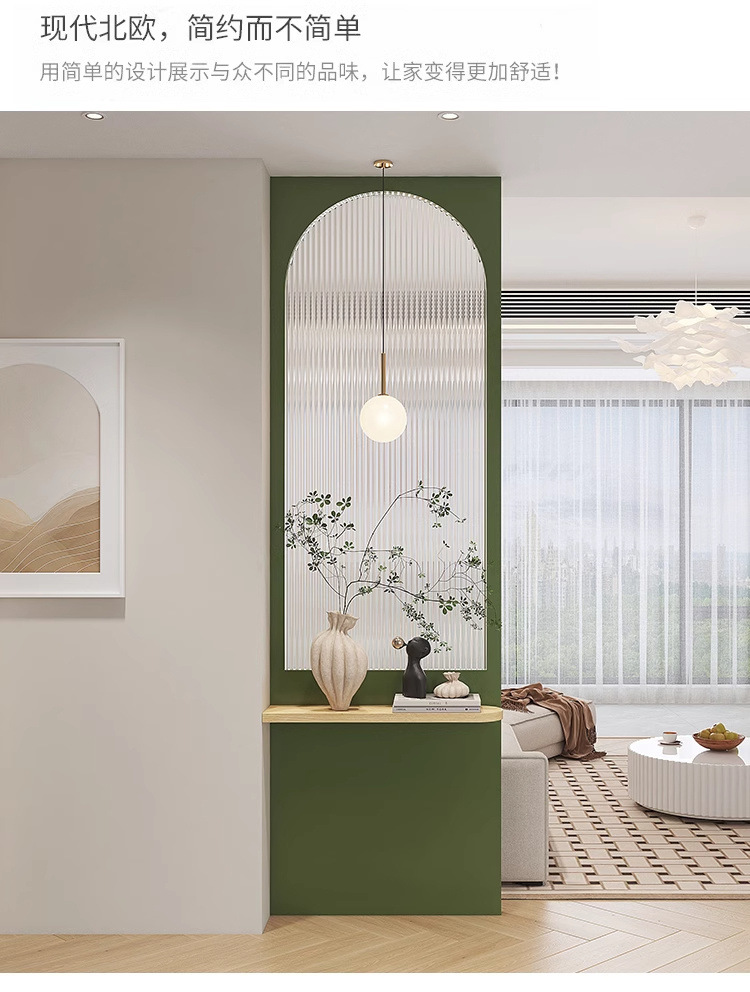 침실 세면대와 욕실을 가리키는 프렌치 크림 스타일의 거실 입구 파티션, 가벼운 고급스러운 물결무늬 유리 스크린