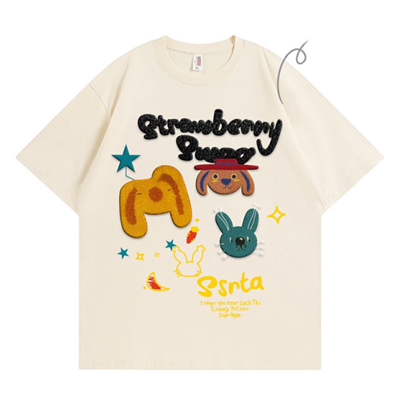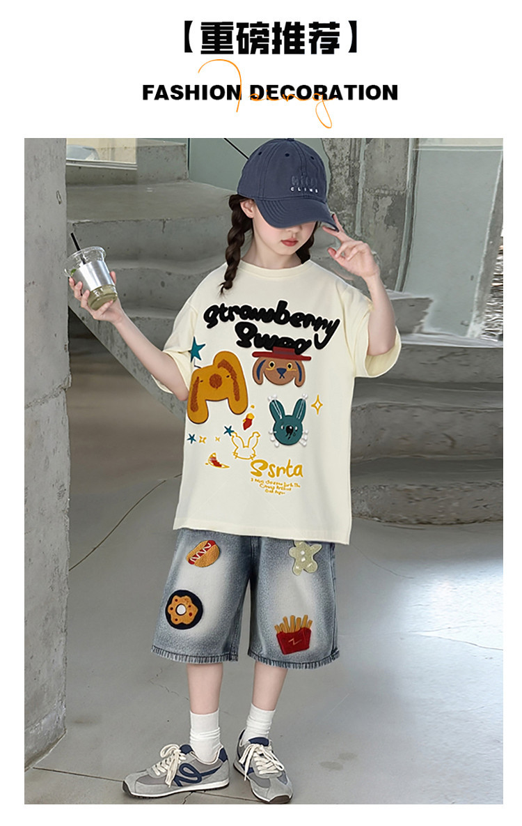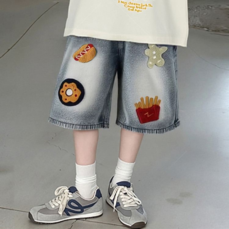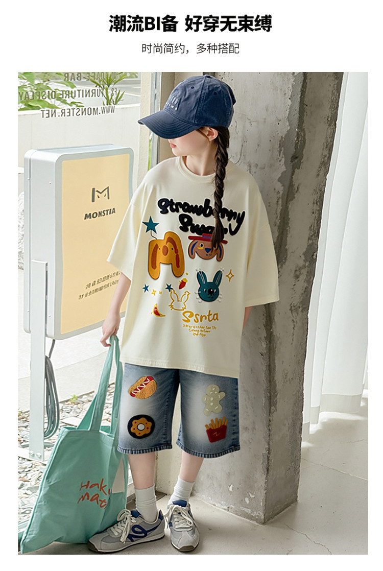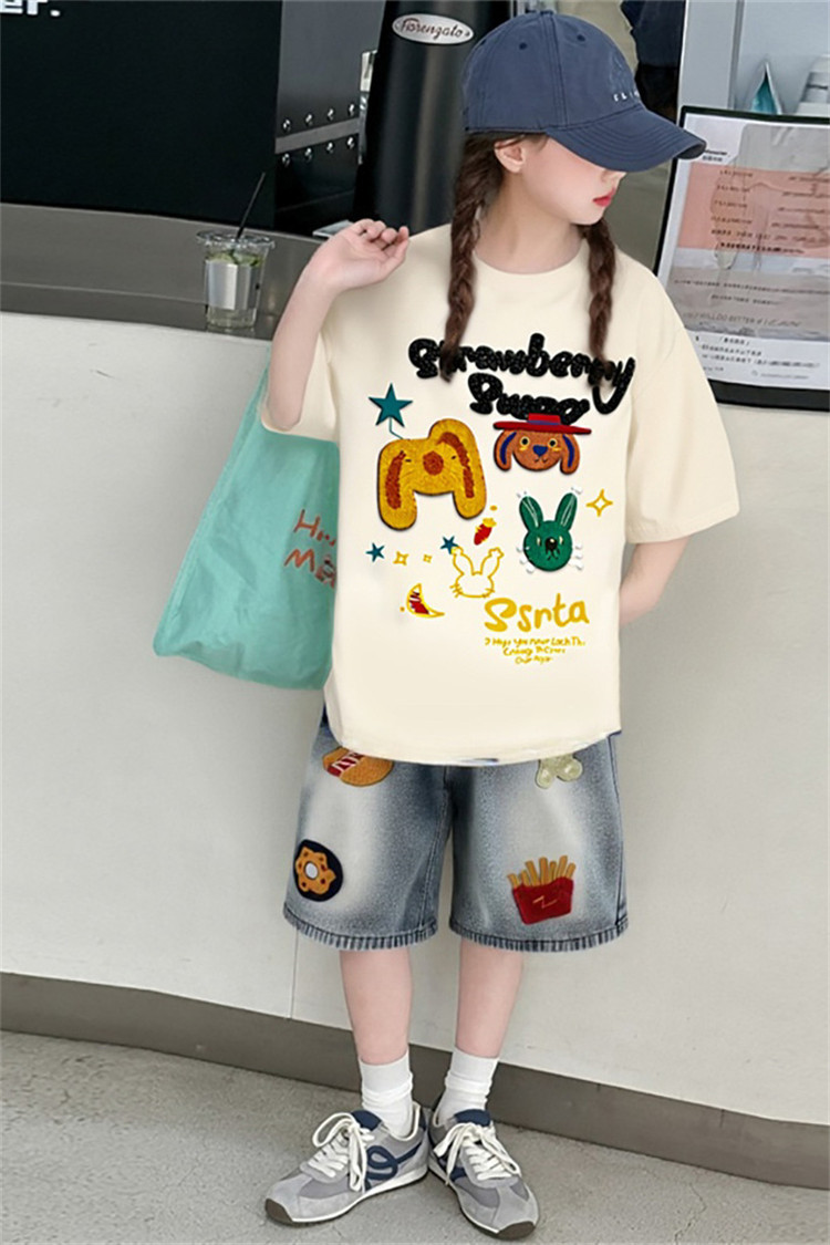 여름 캐주얼 트렌디 쿨 타월 자수 데님 반바지 중대형 아동용 루즈 반팔 티셔츠 2025 여름 신작스토어 가기