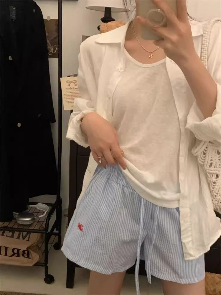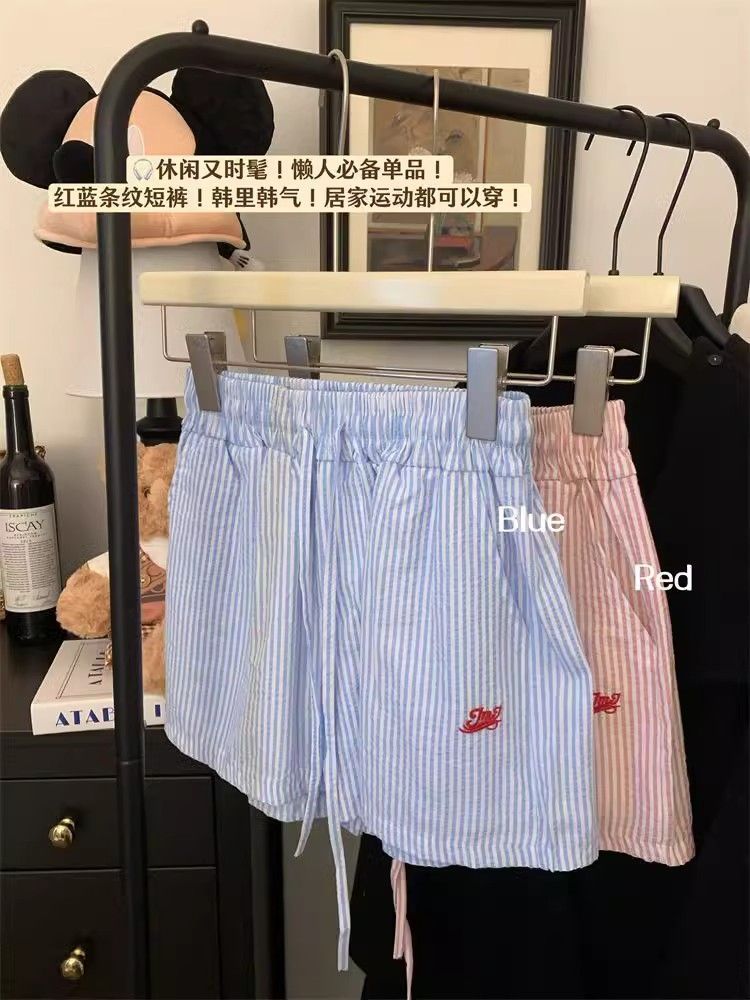 여성용 스트라이프 자수 와이드 레그 반바지 여름 얇은 루즈 캐주얼 3부 바지 트렌디 인터넷 연예인 드로스트링 워킹 팬츠 심플스토어 가기